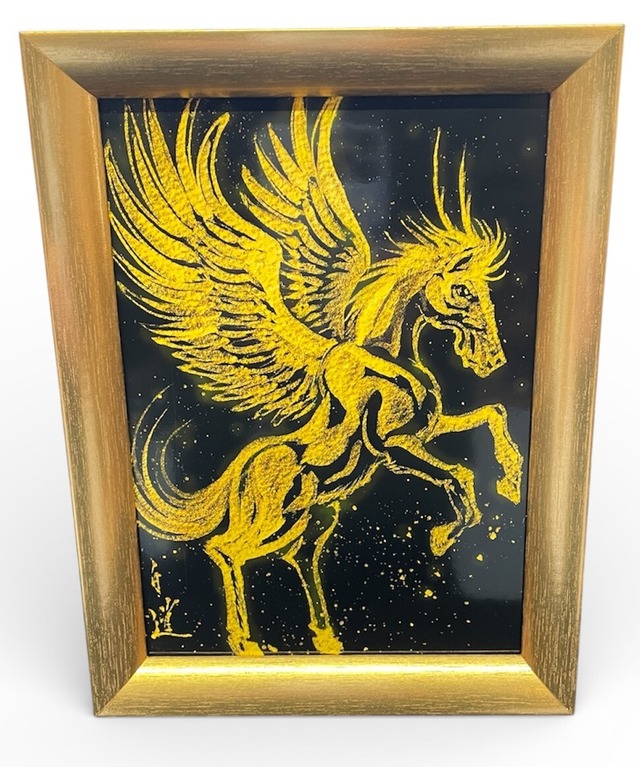 ご覧いただきましてありがとうございます。 お世話になります。 現代水墨画家 絵師白道です。 よろしくお願いいたします。 「羽馬」金墨 直筆作品 2026年は午年です。 勢いよくかけ走る馬が龍と融合して角が生え尻尾が戸愚呂を巻いています。 翼を生やして飛び立つ様を描き 更なる飛躍を呼び込む如く攻めしっかりと巻き込めるようにという願いで描きました。 画像では分りにくいかもしれませんが 現物はキラキラチカチカと砂金のように輝きがあります。 光を当てますと更に輝きが増し美しい龍が浮かび上がります。 額縁サイズ:12×20cm (置き型でも壁掛けでもご使用いただけます) ご依頼事、ご相談事がございましたら、 このホームページ、チャットよりご連絡ください。 Amazon(スマホケース)絵師白道 楽天市場(スマホケース)絵師白道 ------------------------------------------------------------------- 絵師白道 略歴 2007に名古屋で路上活動を開始。翌年白道アートギャラリー「龍の部屋」設立。 龍や鳳凰などの縁起の良いモチーフを描くことが多く、力強く躍動感のある筆致が特徴。純金など異素材を融合させた作品も手掛けています。 伝統と現代アートを融合させた独自のスタイルで、日本の伝統的な水墨画のスタイルを現代的にブラッシュアップした作品は、国内外からの評価を受けています。 <受賞歴> 2014 NY ART EXPO 奨励賞 2017 DISCOVER THE ONE JAPAN(Paris)人気アーティスト賞 2020 雪舟国際美術協会展 審査員特別賞(国立新美術館) 2022 福岡アジア美術館「躍動する現代作家展」優秀賞 2022 東京国立新美術館「躍動する現代作家展」躍動する現代作家賞 2024 NY 国際書道展 準優秀賞 <版権コラボ> 2017 ウルトラマン × バルタン星人 掛け軸原画 (円谷プロダクション監修 / プレミアムバンダイ) 2018 手塚プロ(アトム・BJ・火の鳥)掛け軸原画 全国発売 2025 東宝公式ライセンス「ゴジラ-1.0」原画担当(全国発売) <展示会> 2023 LA「The Pop-Hop」 NY「Principles Gl Coffee House」 ドバイ FWAG 展 ローマ Museo Venanzo Crocetti ミラノ MADS Gallery 契約 NY タイムズスクエア 5作品掲出 ロンドン The Holy Art 契約 2024 World Art Dubai 2024 出展 NY KI SMITH GALLERY 取り扱い作家契約 2025 浅草「白道展」 個展 福岡「躍動する白道展」個展 千疋屋ギャラリー(京橋本店)「白道作品展」個展 Hakudouroom.ART 「DECO PANE展」個展 Hakudouroom.ART 「龍馬展」個展 2026 NY 個展 開催決定!