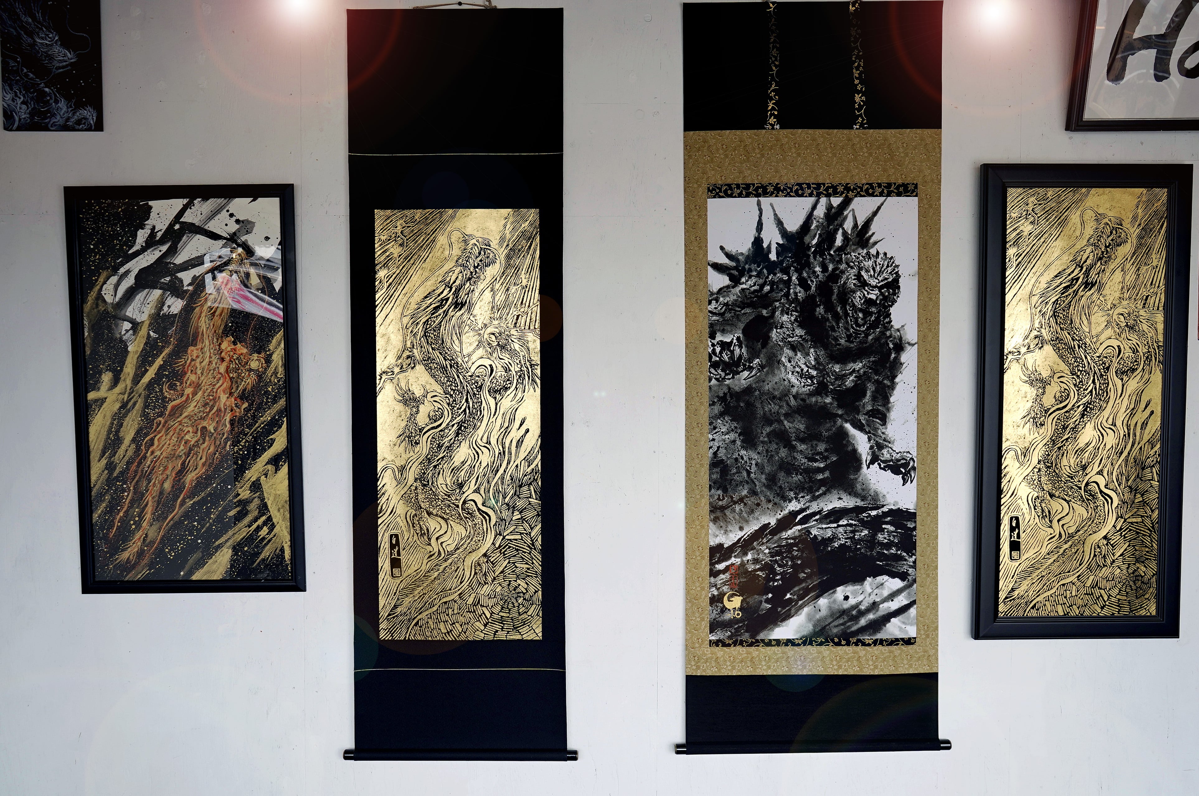 絵師白道の真骨頂 現代水墨画 「G-DRAGON」 巨大な体を地面に張り付かせ大暴れしている様子を墨、一本で描きました。 和モダンを意識してシックなデザインで綺麗な表装で仕上げていますので 洋間の白い壁にも映えると思います。 ◆サイズ/本体幅寸•.• W 76cm X H 200 cm ◆絵サイズ/W61㎝×H118㎝ 絵師 白道 (えしはくどう) 岐阜出身。路上活動をはじめ約一年で自身のギャラリーHakudouroomを設立以後、アニメ、特撮ヒーローの公式商品の絵を手掛ける 国内で活躍。その後ミラノとロンドンのギャラリーと契約しNYタイムズスクエアービルボードで紹介されるなど海外での評価も高いアーティスとして活動、 最新はゴジラ-0.1 水墨画、掛け軸を手掛け注目を集めています。