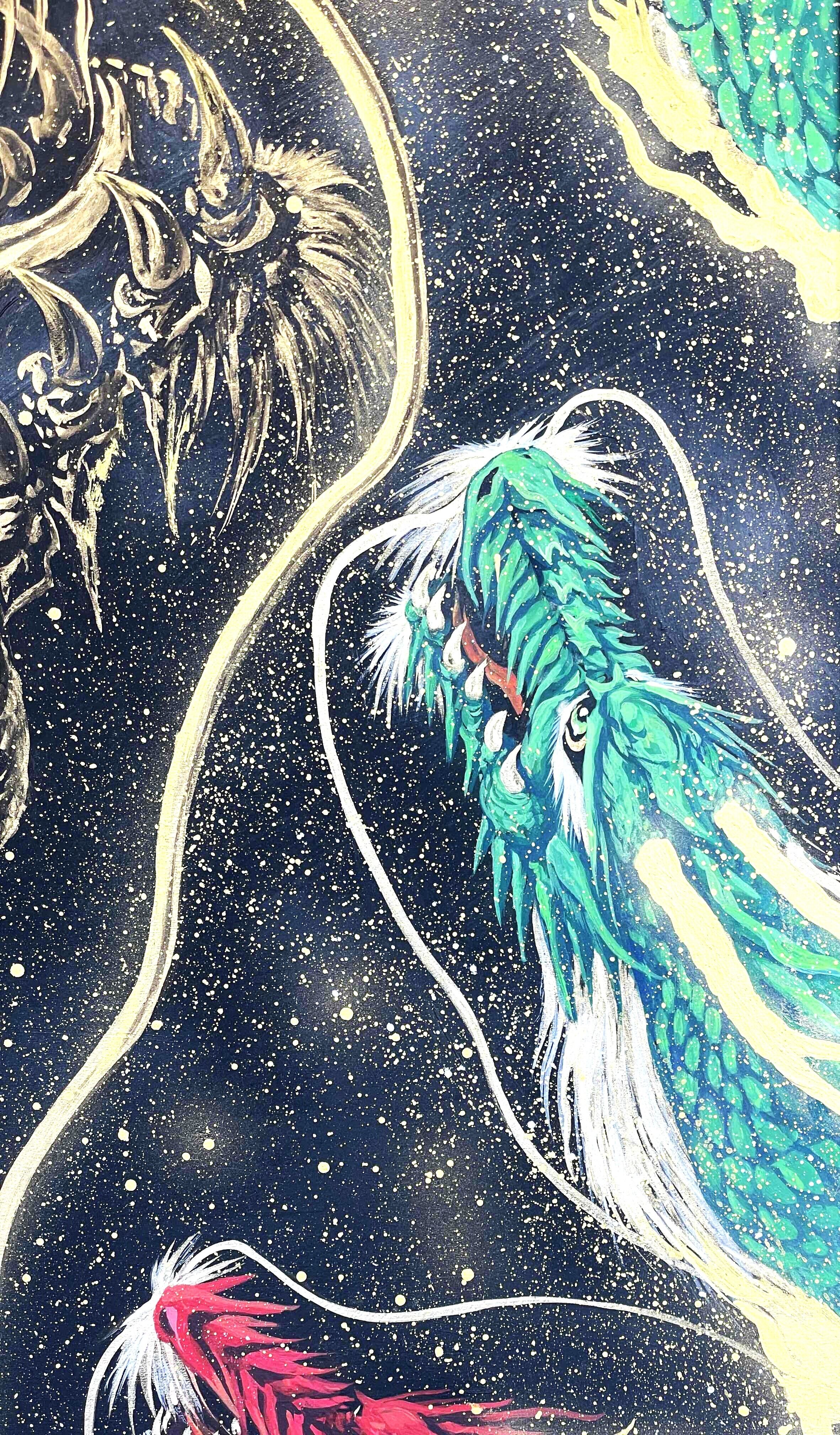 龍や鳳凰などの縁起の良いモチーフを描くことが多く、力強く躍動感のある筆致が特徴です。