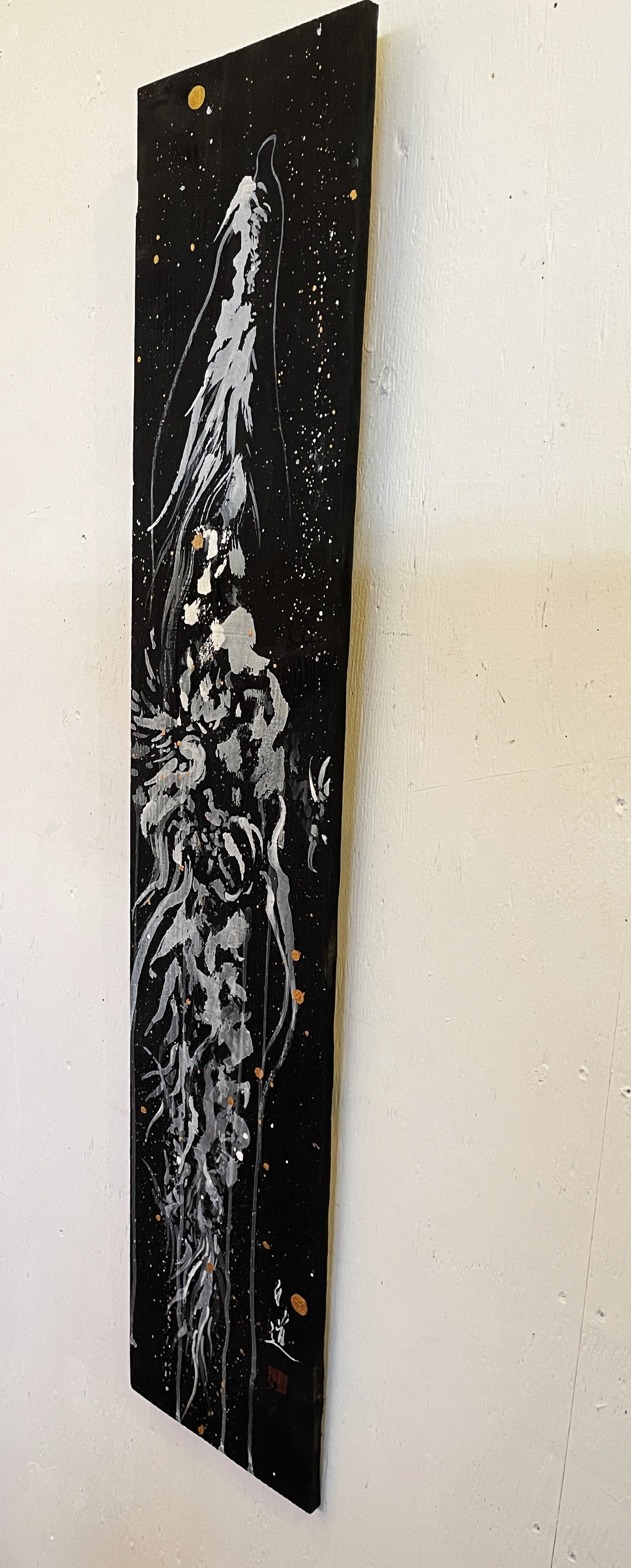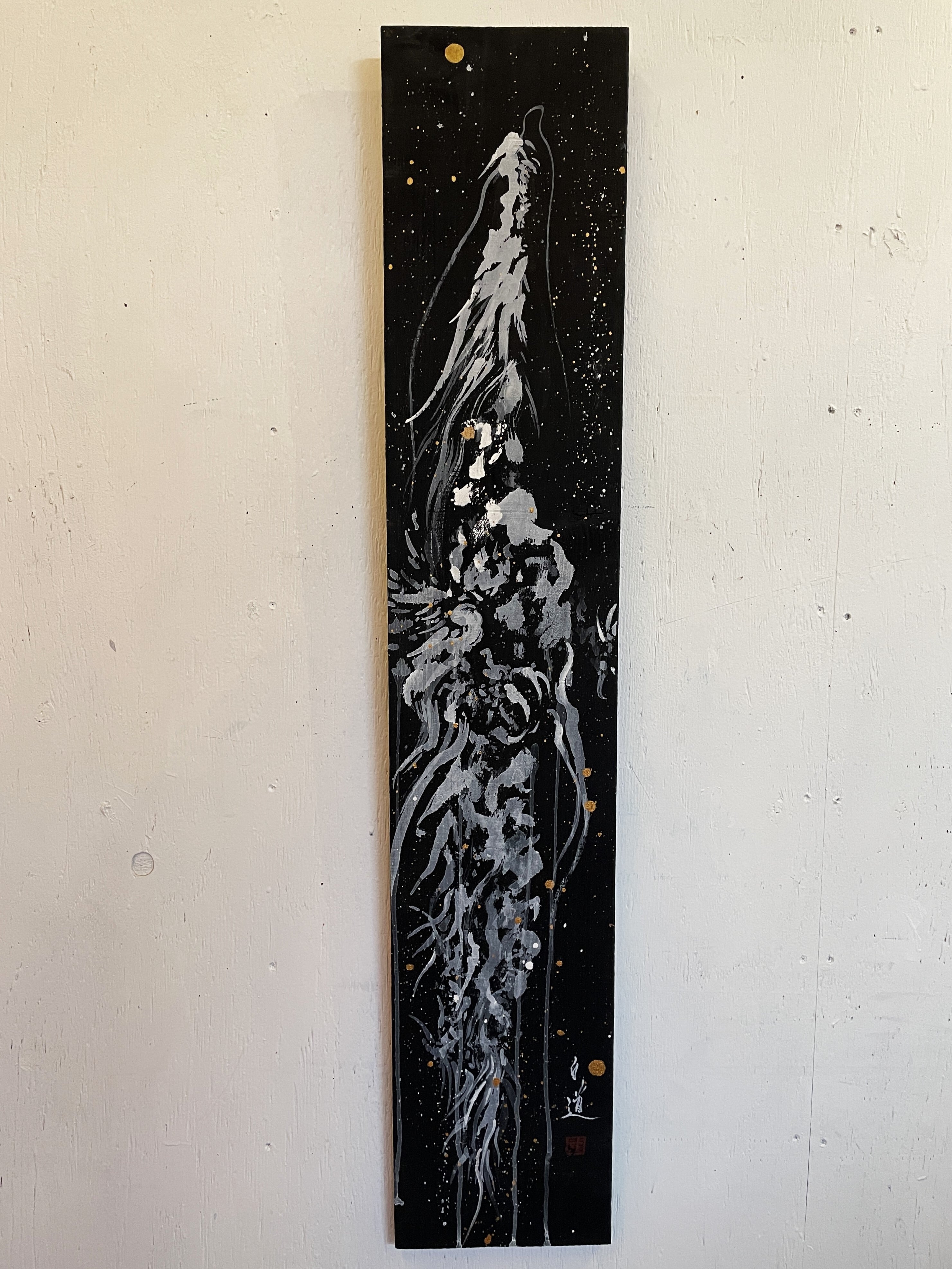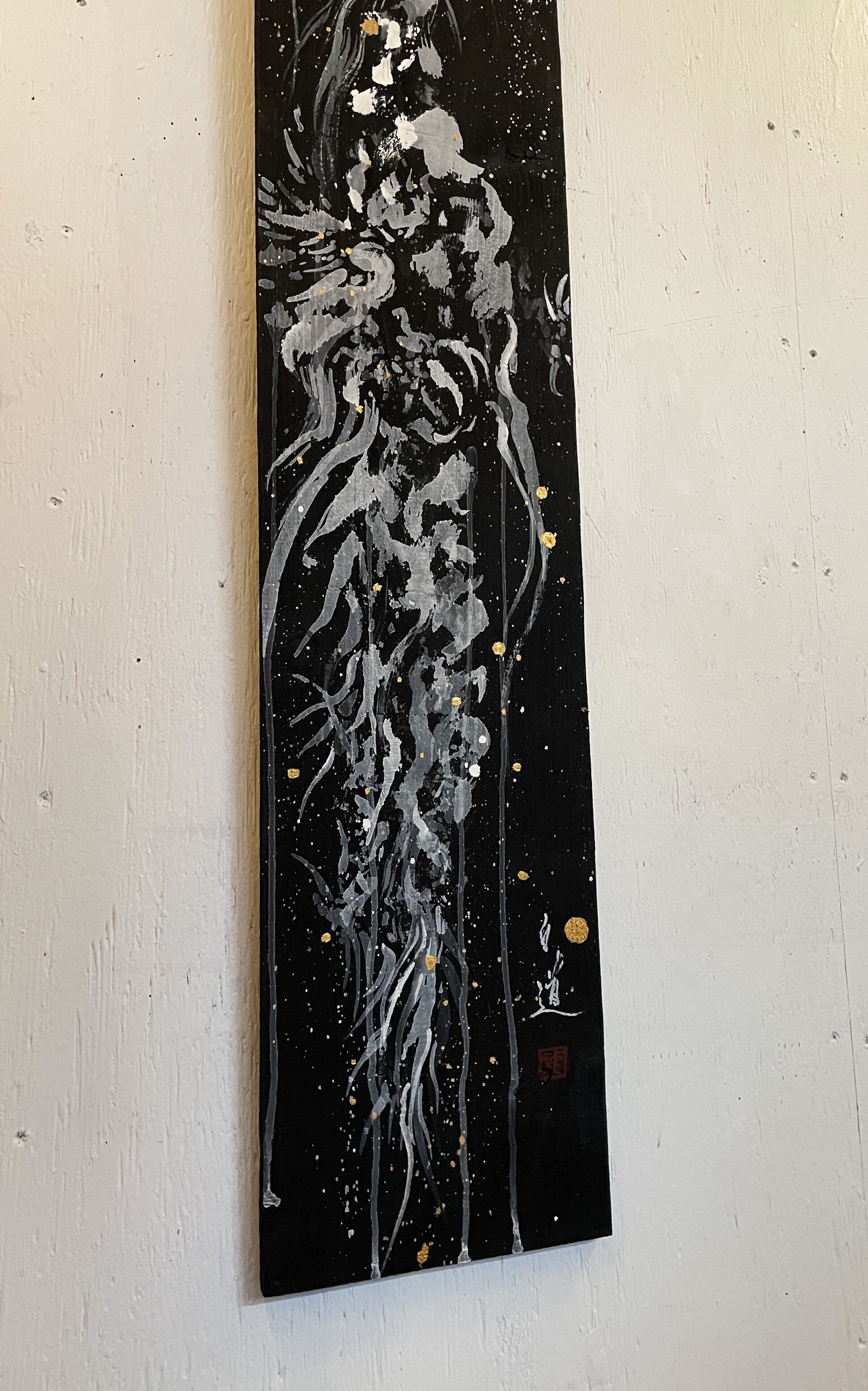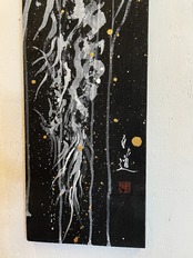 龍や鳳凰などの縁起の良いモチーフを描くことが多く、力強く躍動感のある筆致が特徴。純金など異素材を融合させた作品も手掛けています。