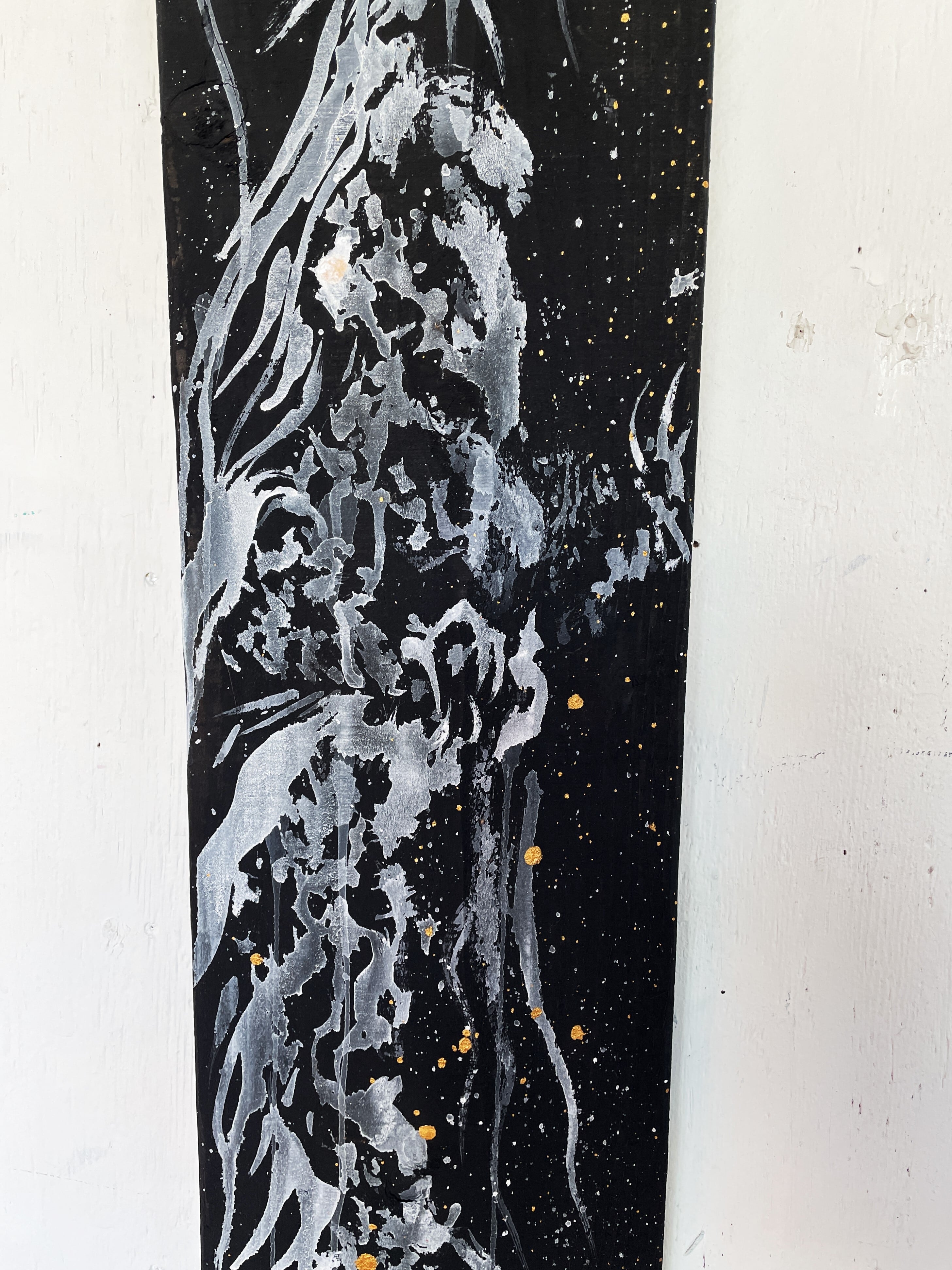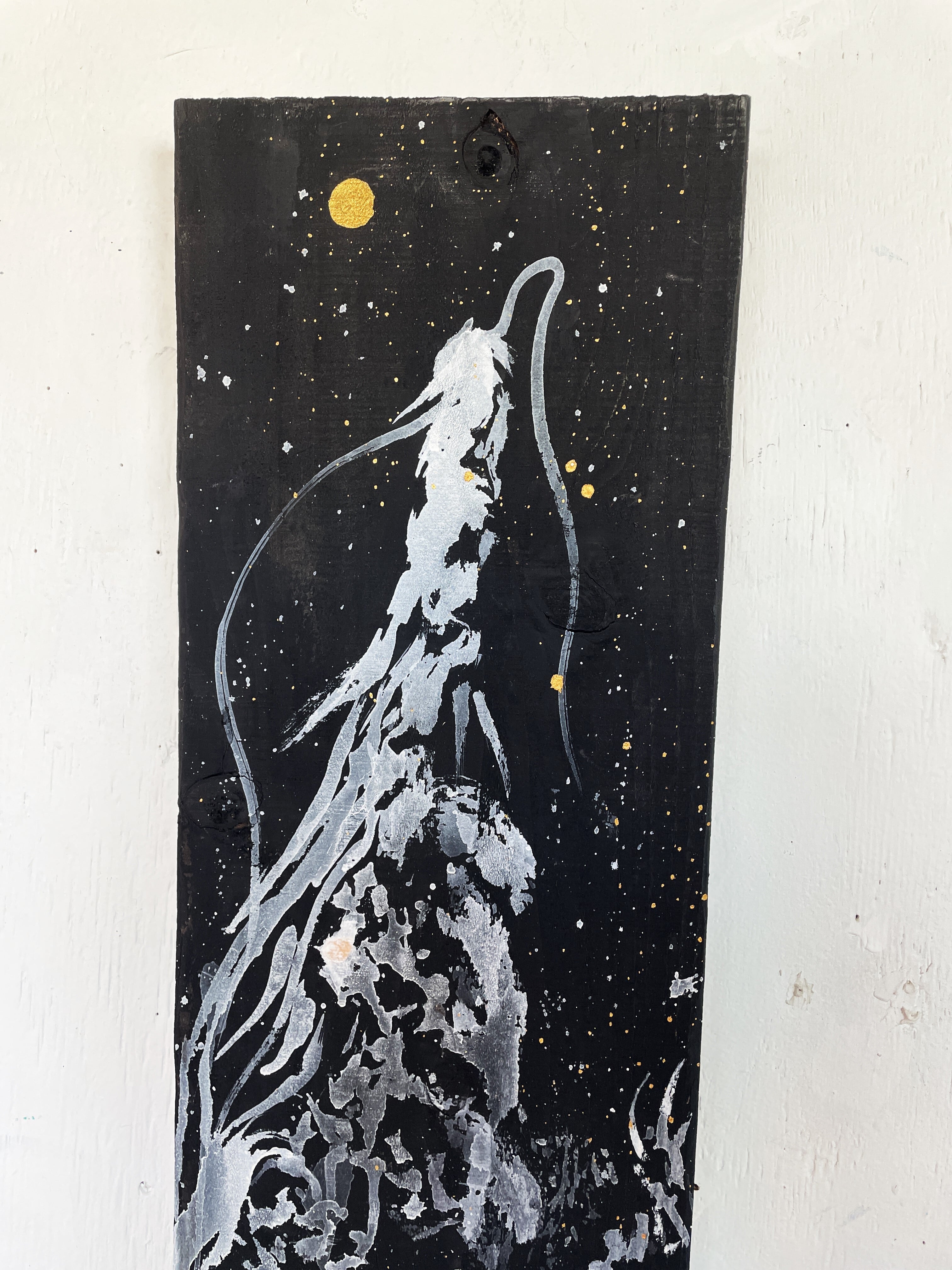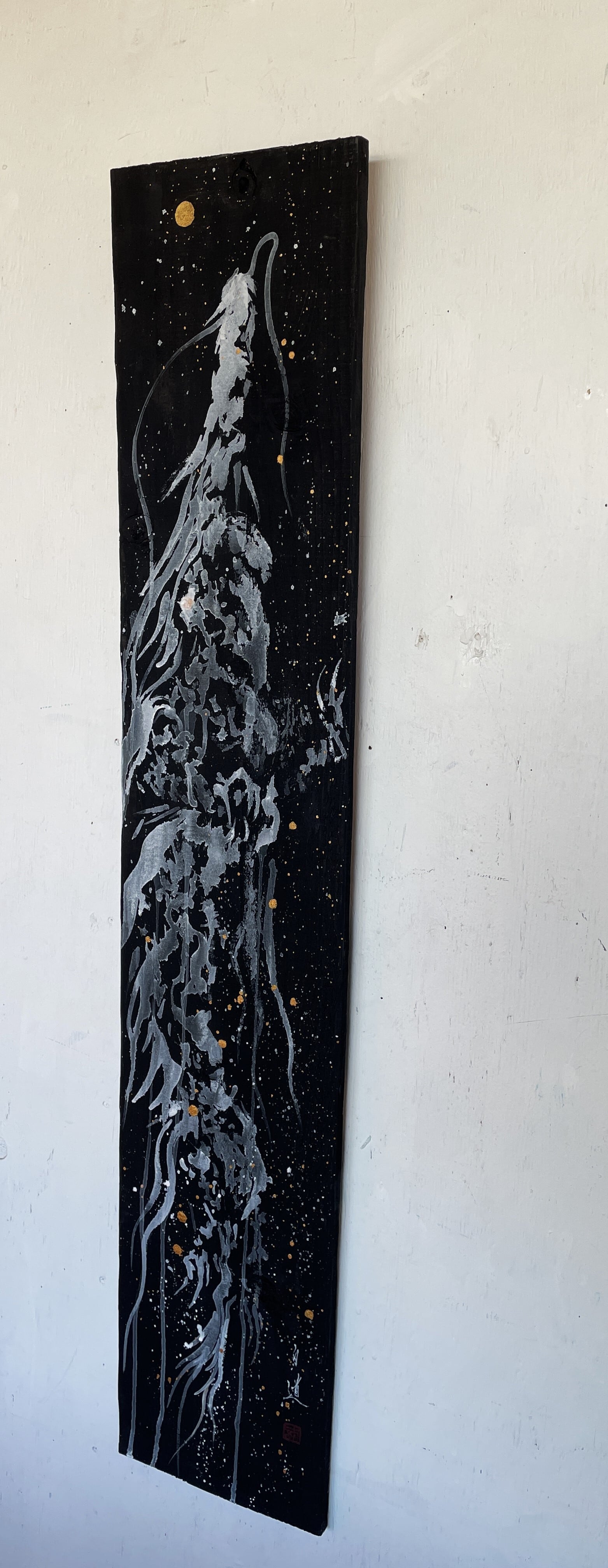 龍や鳳凰などの縁起の良いモチーフを描くことが多く、力強く躍動感のある筆致が特徴。純金など異素材を融合させた作品も手掛けています。