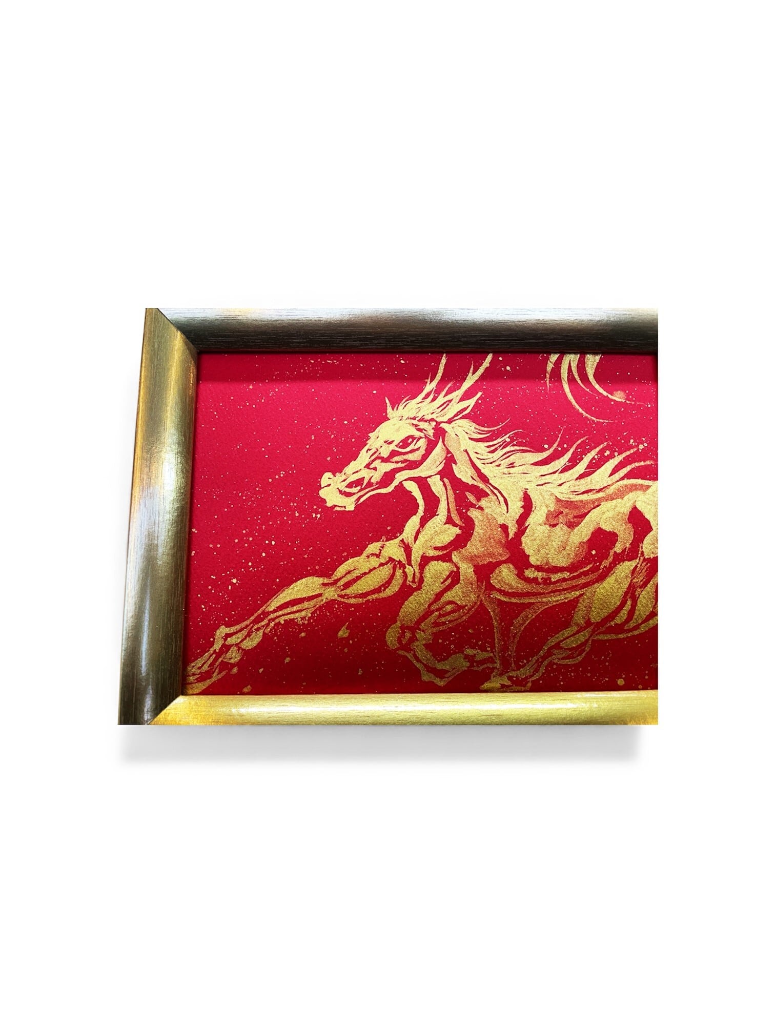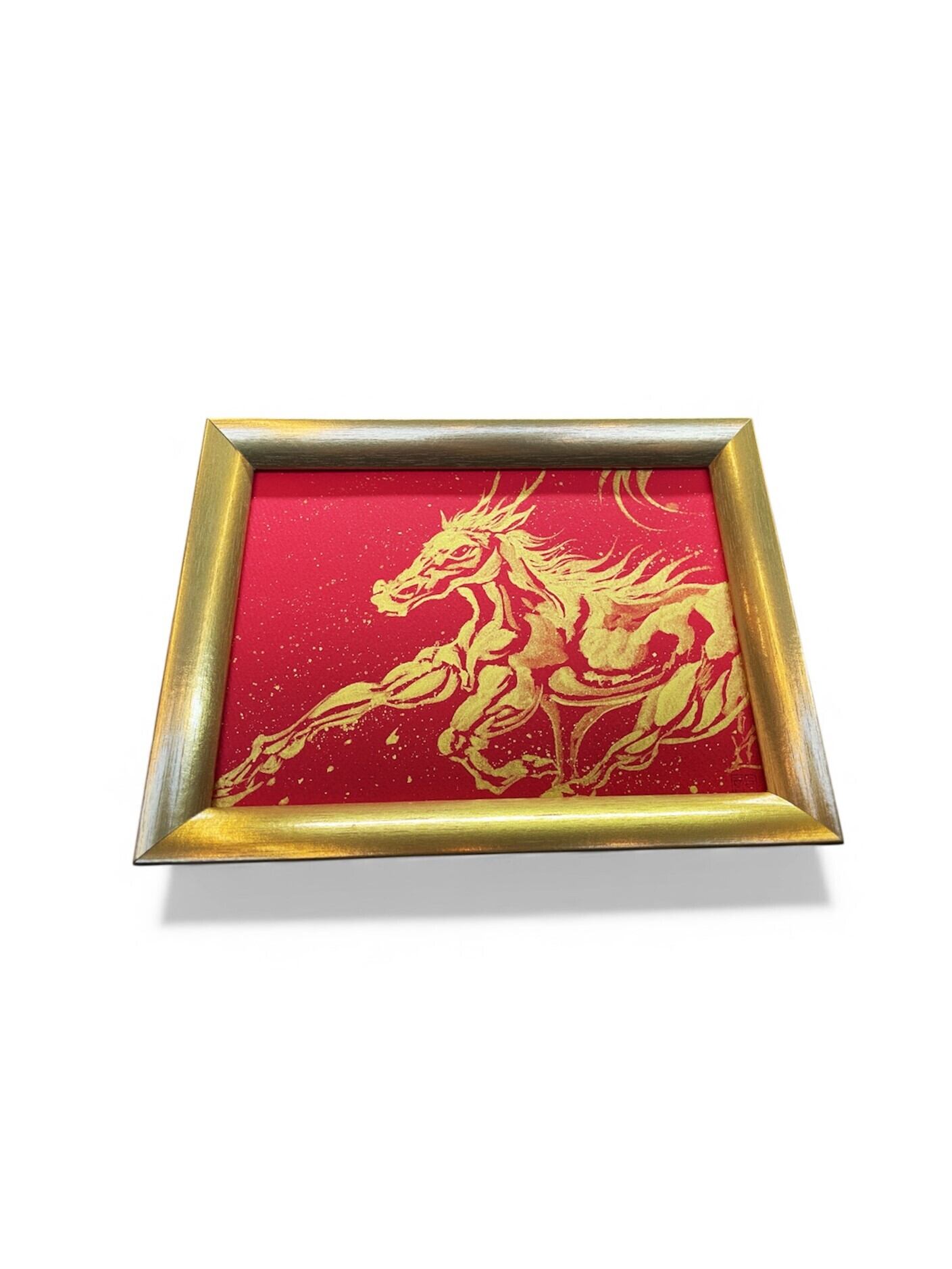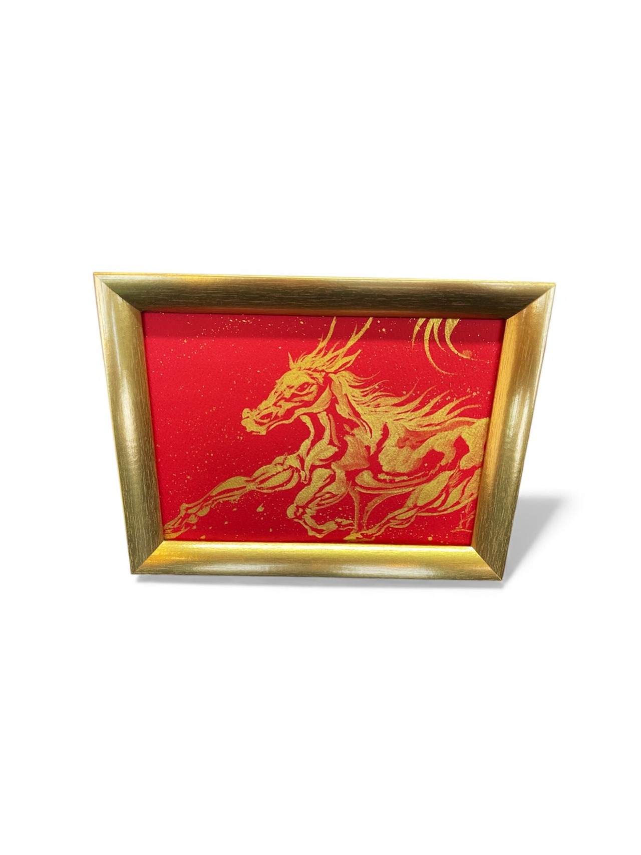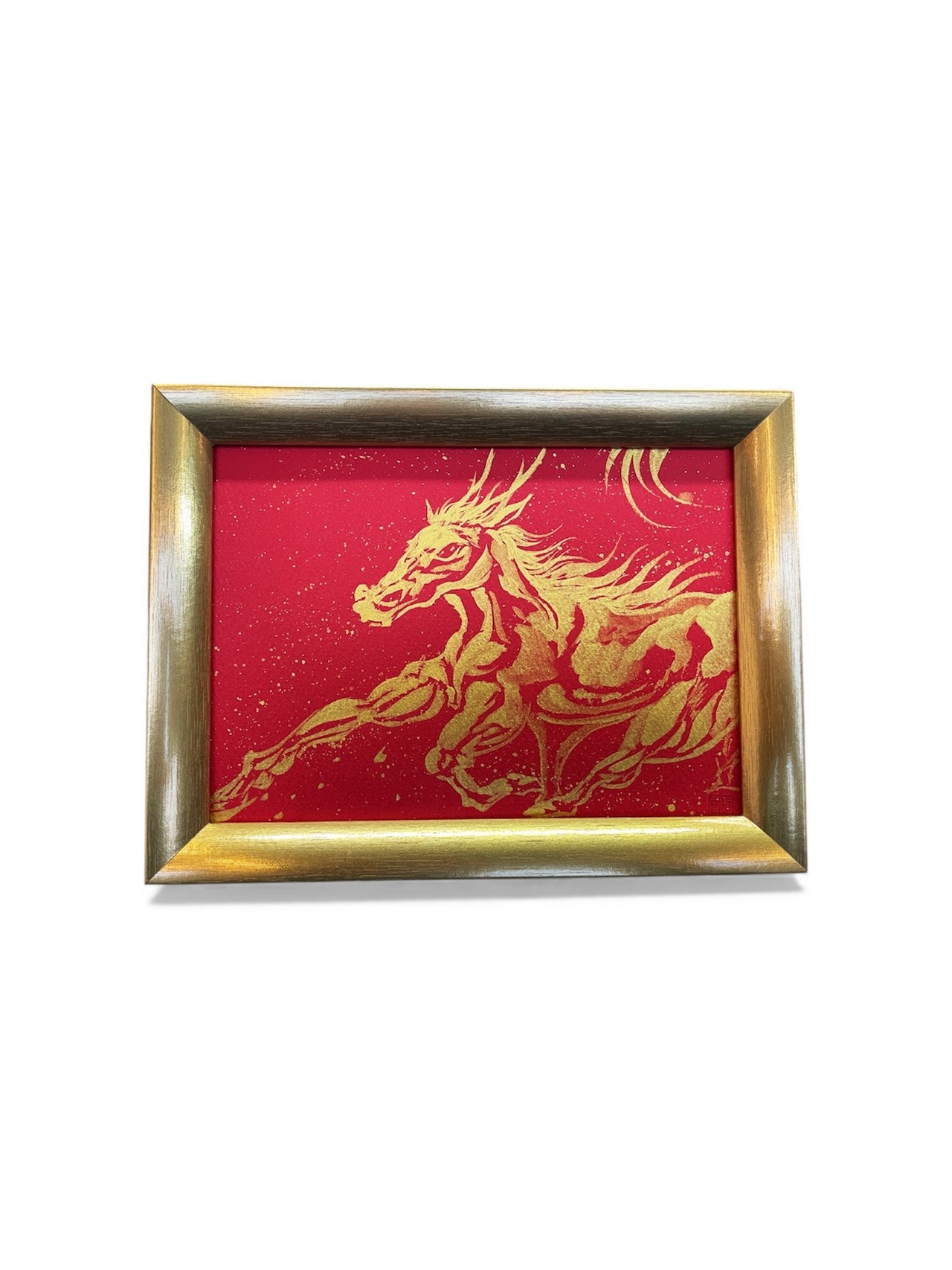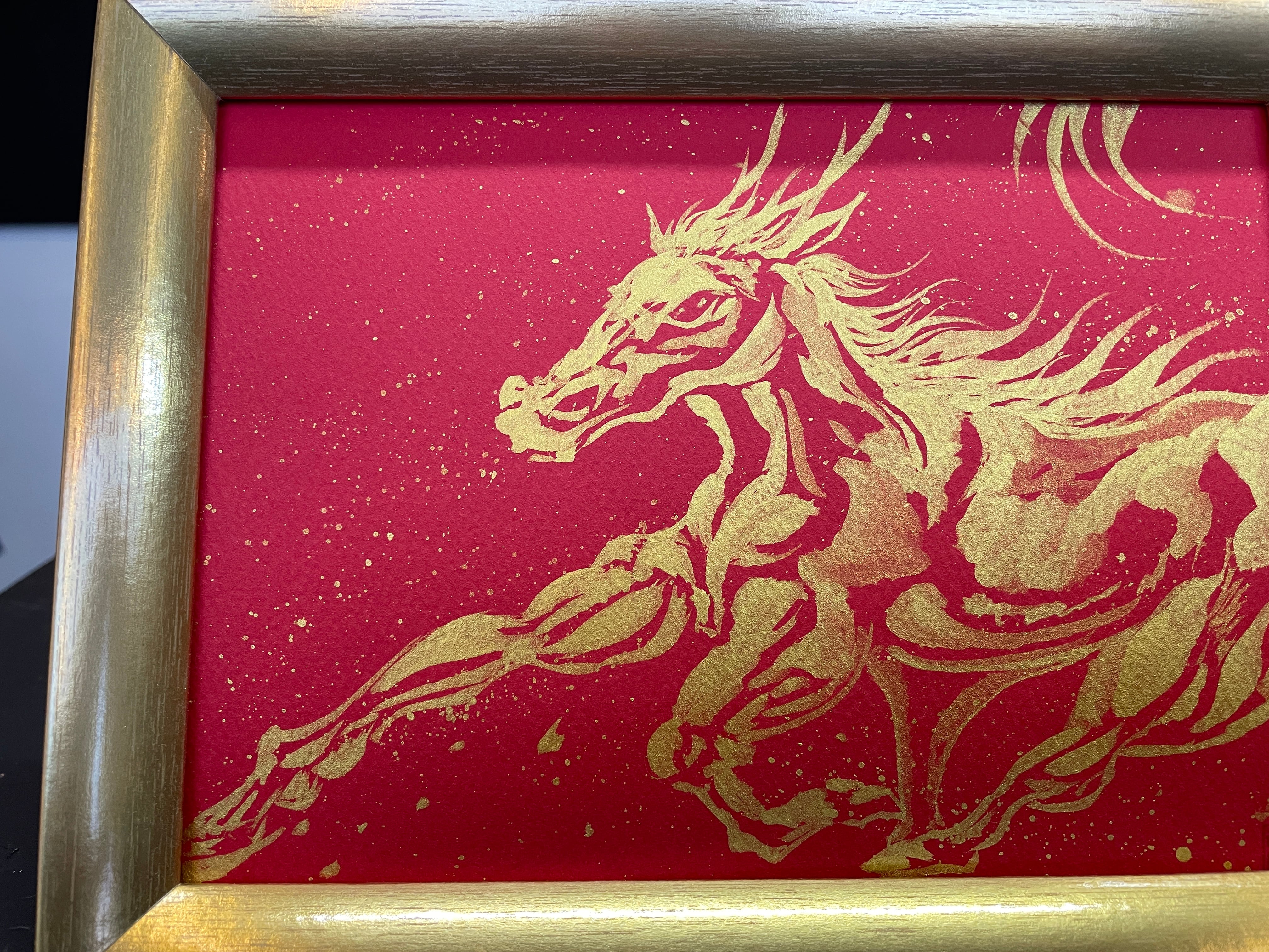 勢いよくかけ走る馬が龍と融合して角が生え尻尾が戸愚呂を巻いています。