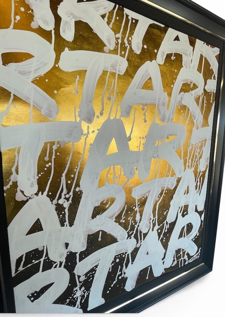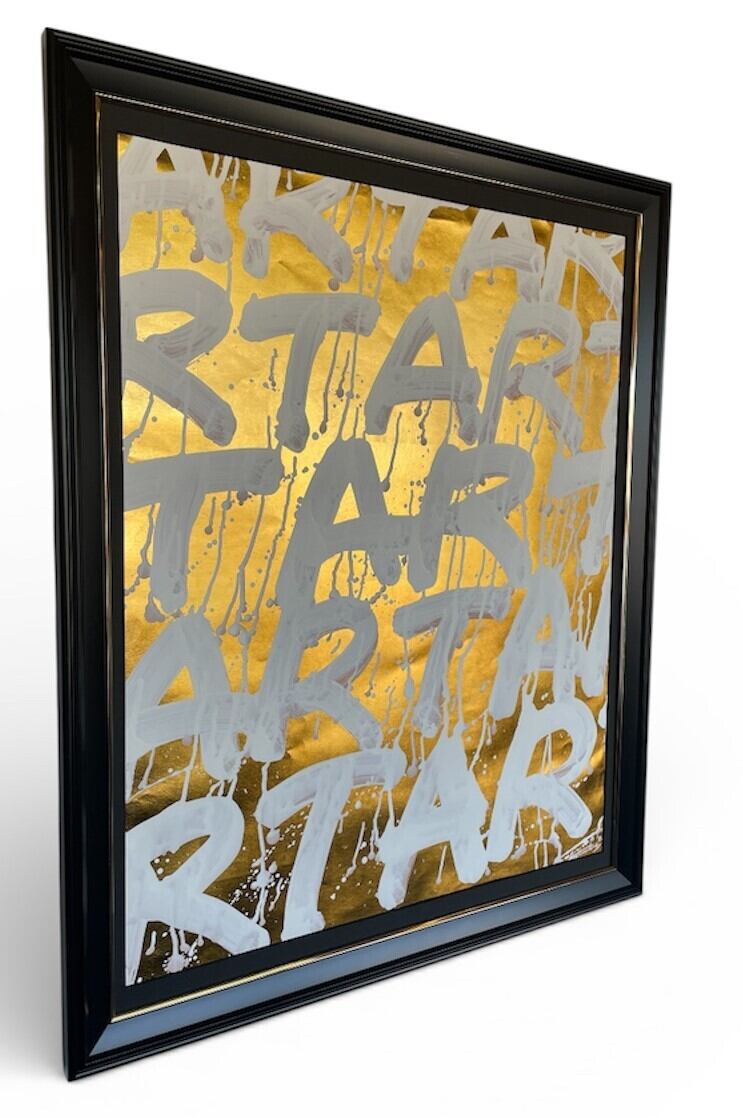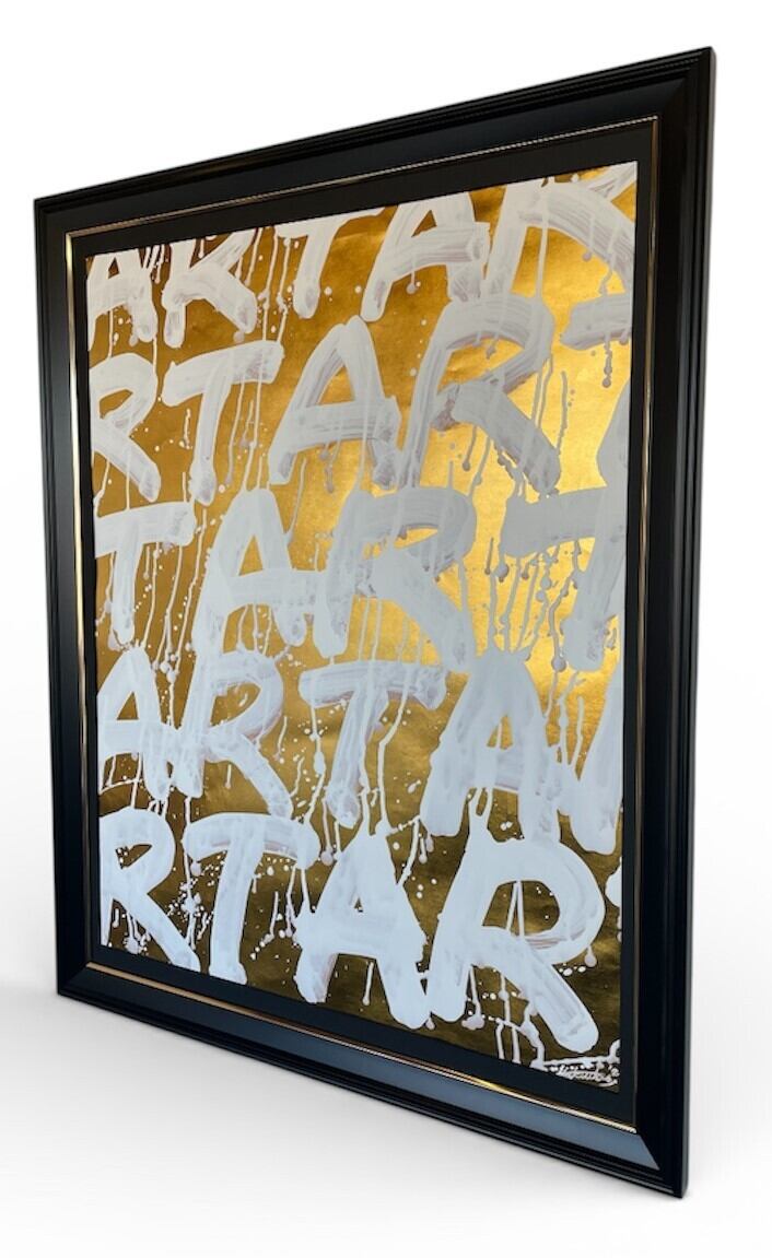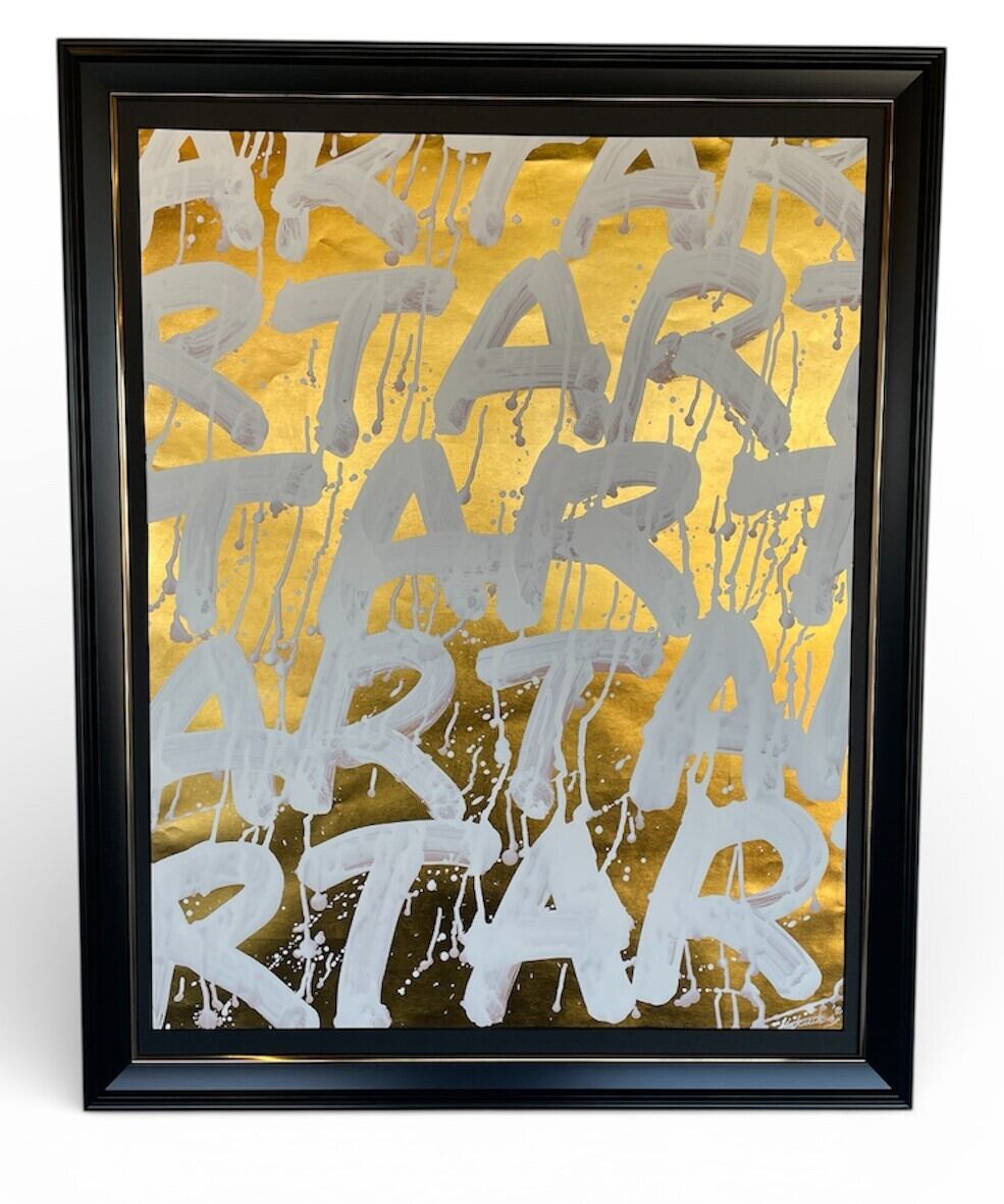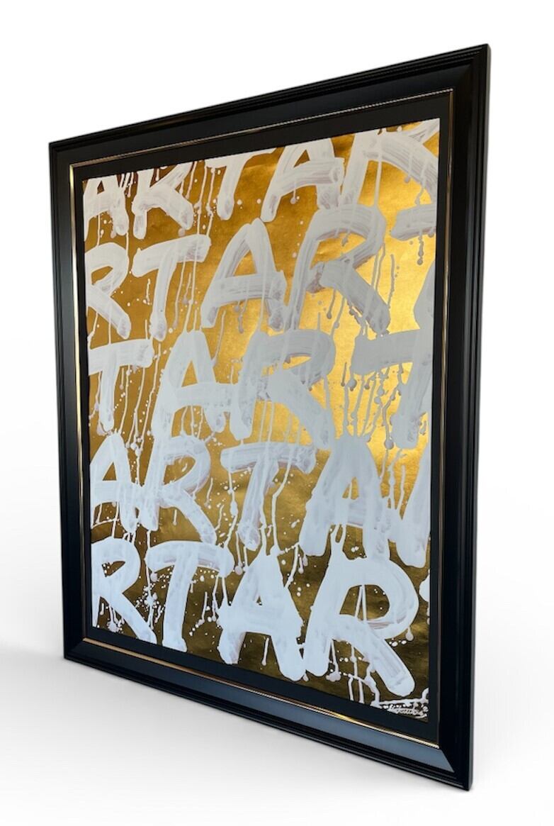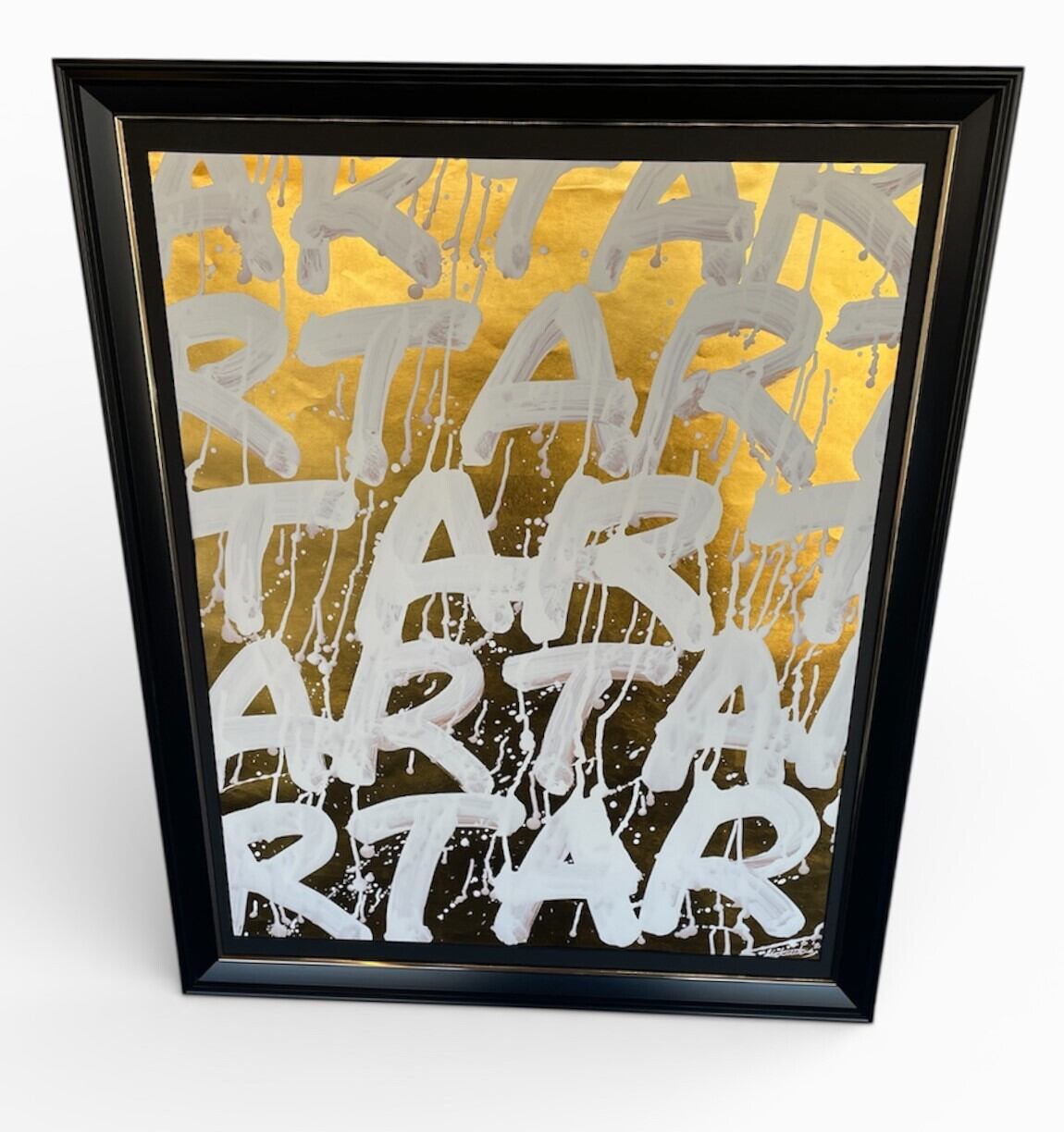 金箔を箔押しした台紙に白色でARTの文字を書道しました。