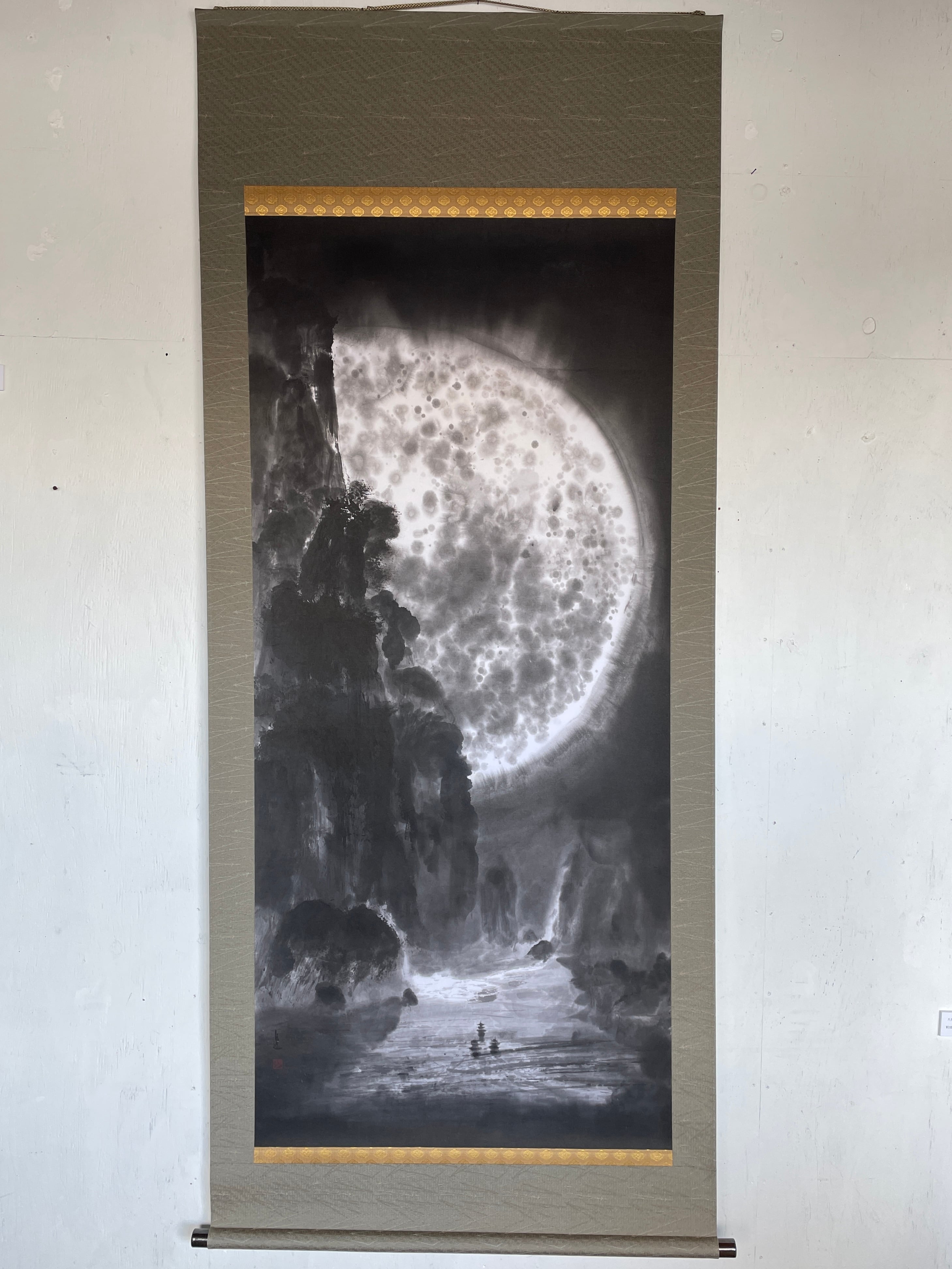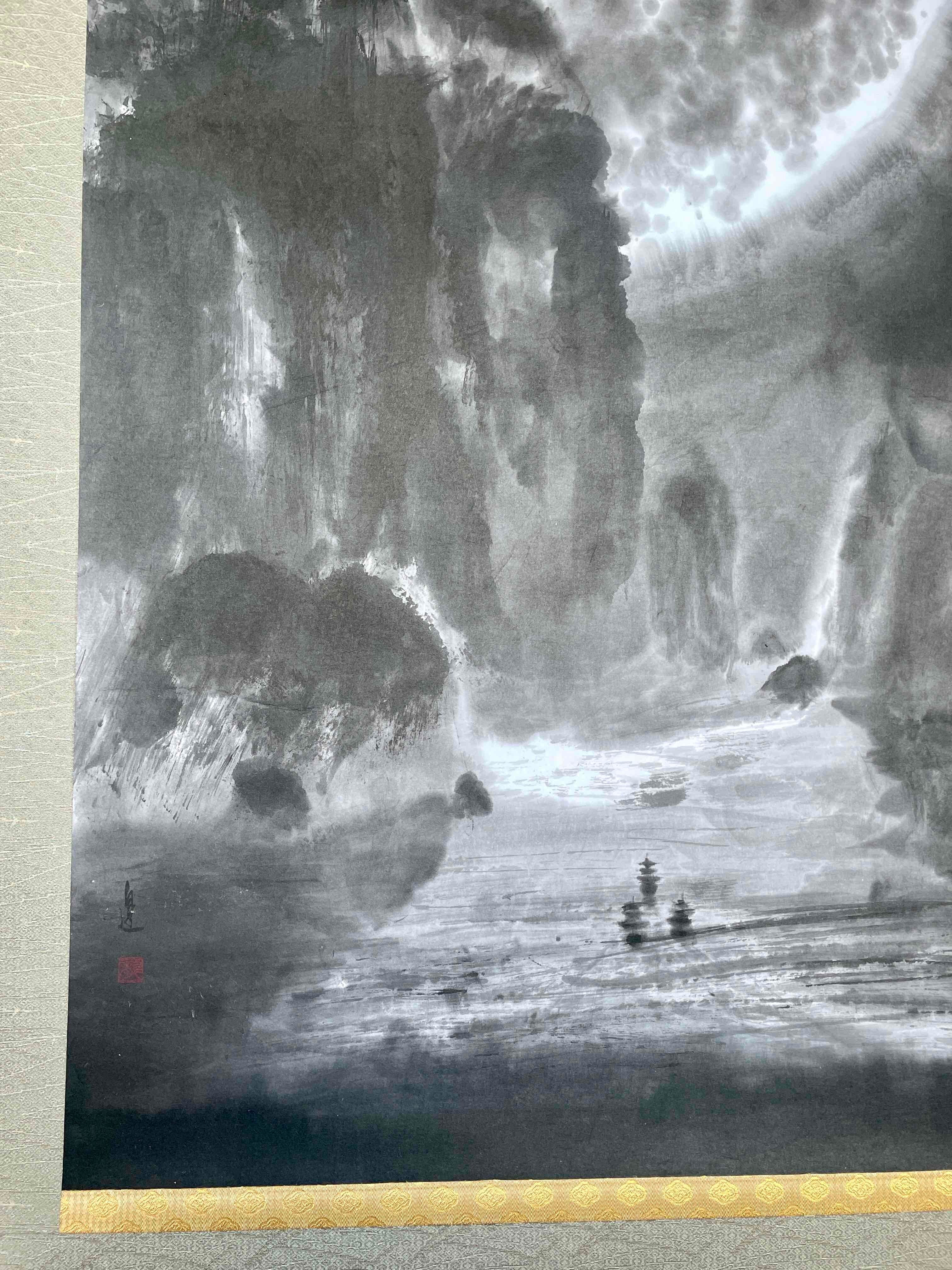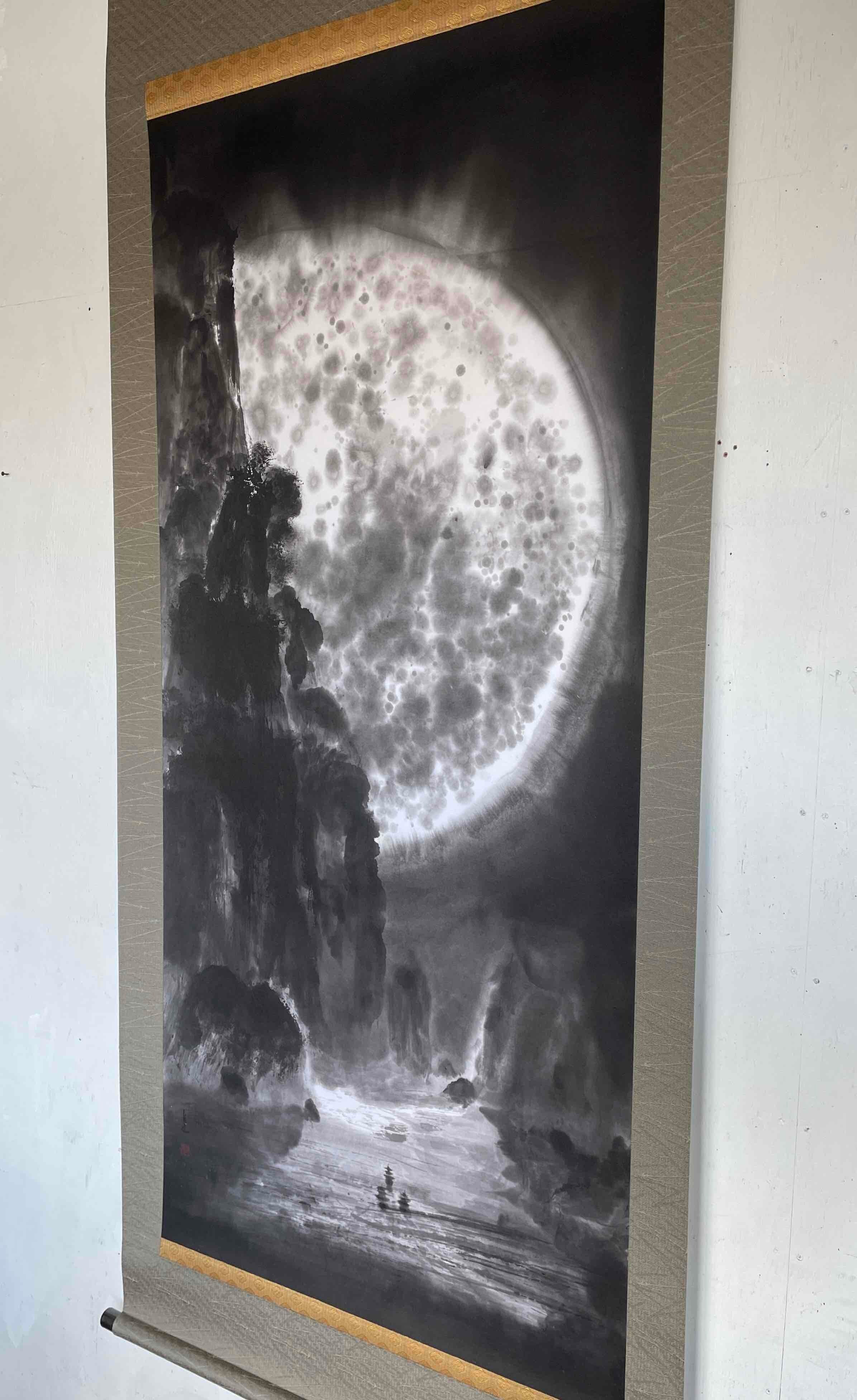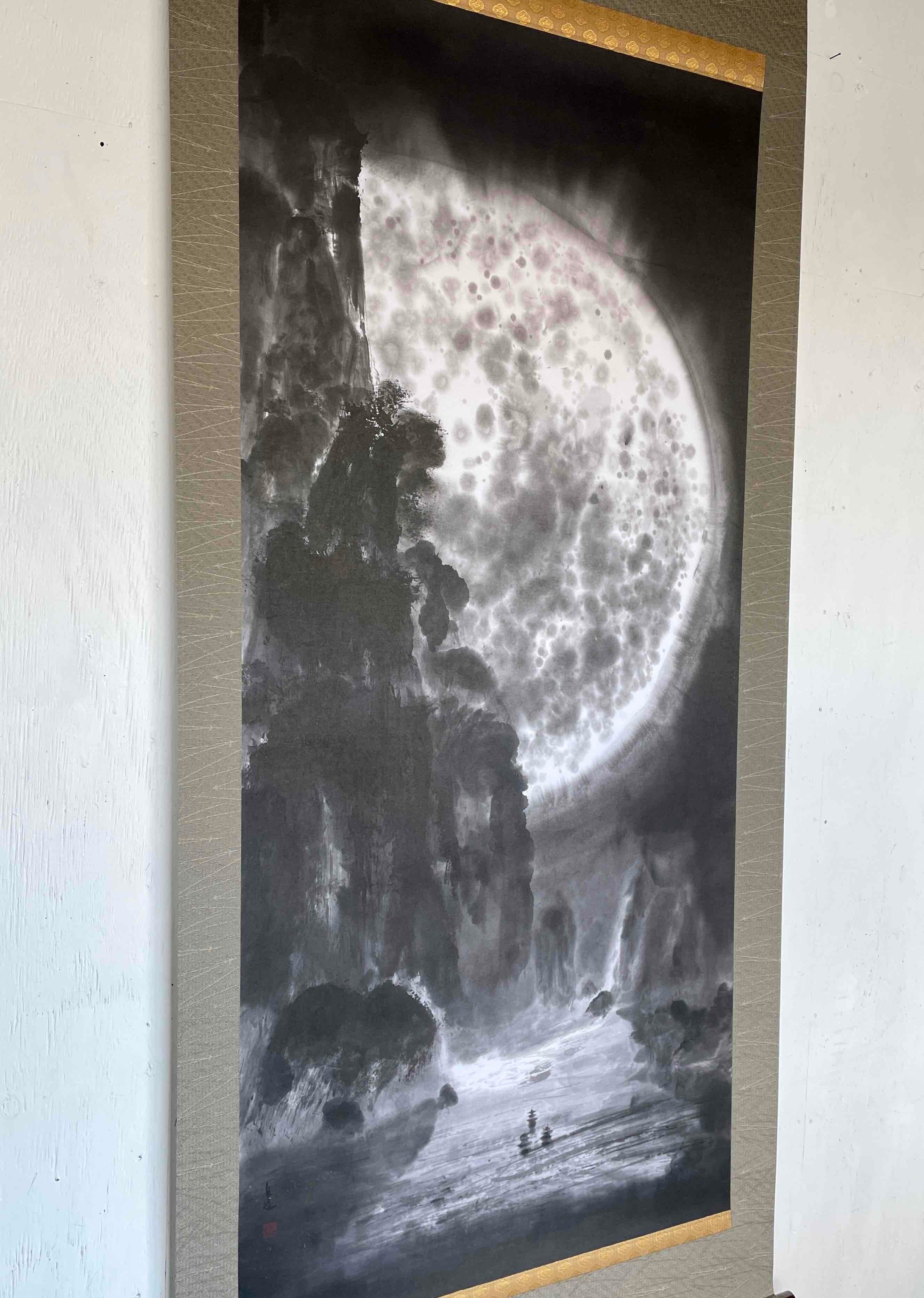 現代水墨画家 絵師白道 「月の陣」(水墨画) 直筆作品 証明書カード付 三国志 船 川 絵 絵画 掛軸