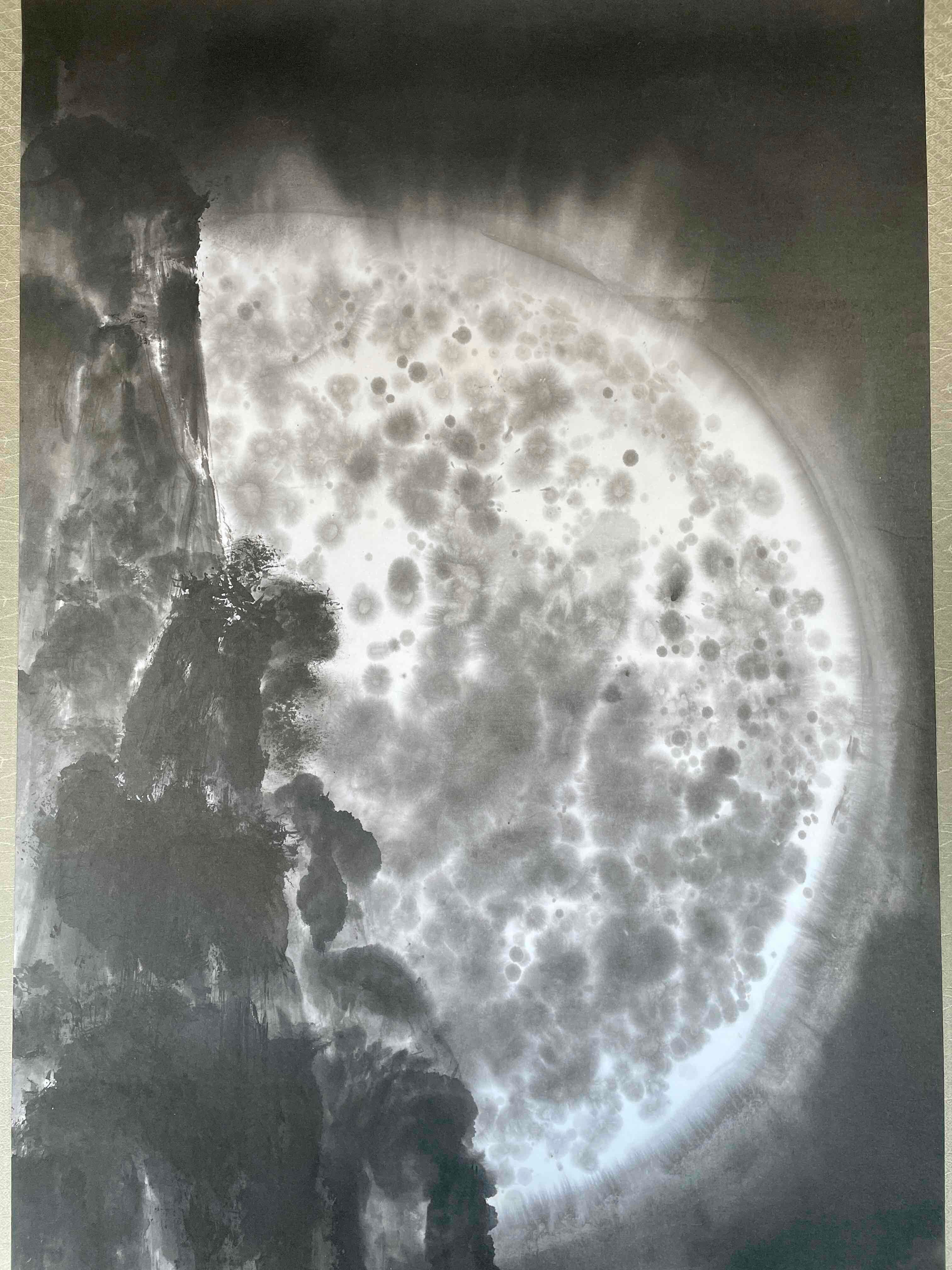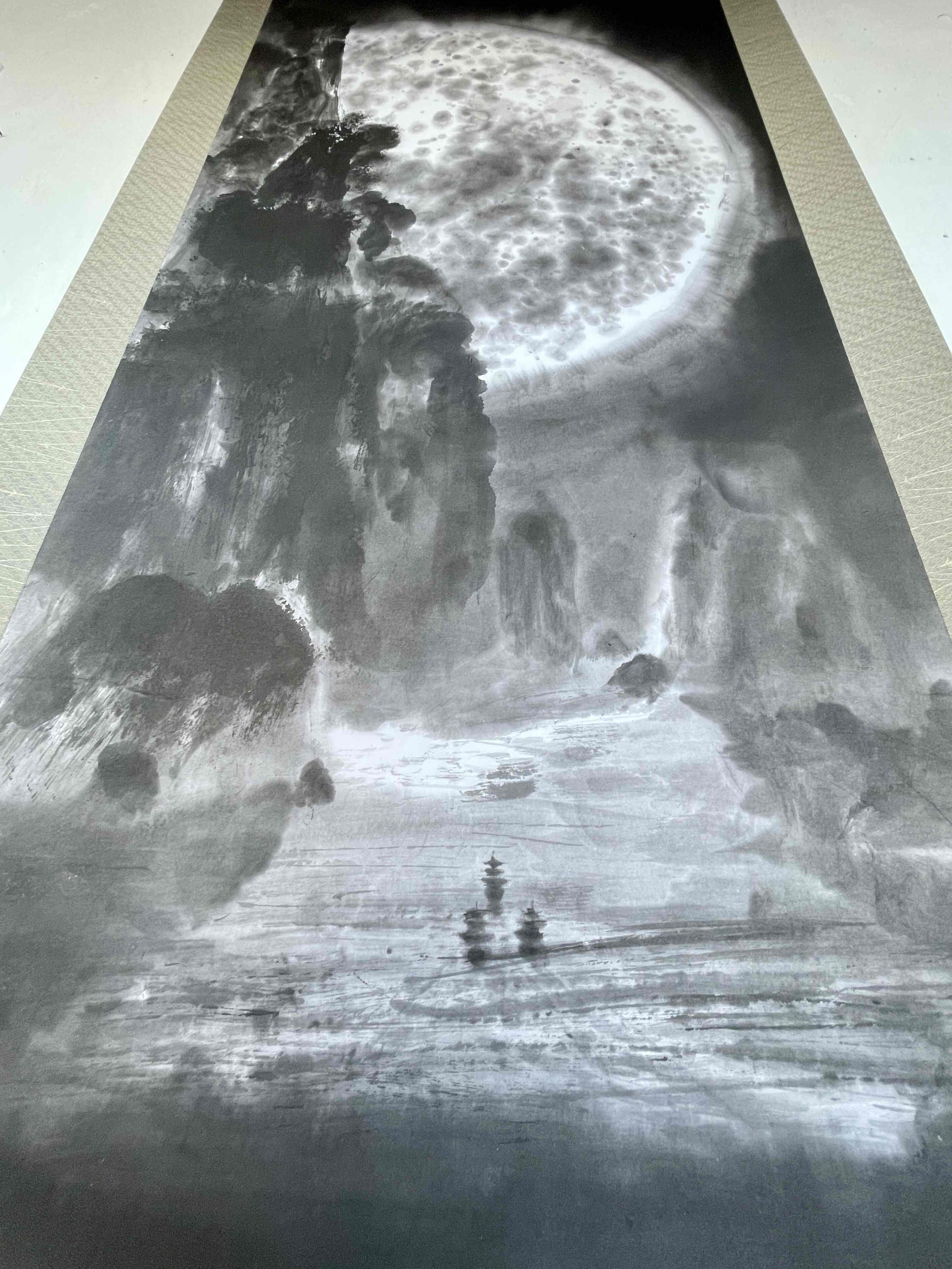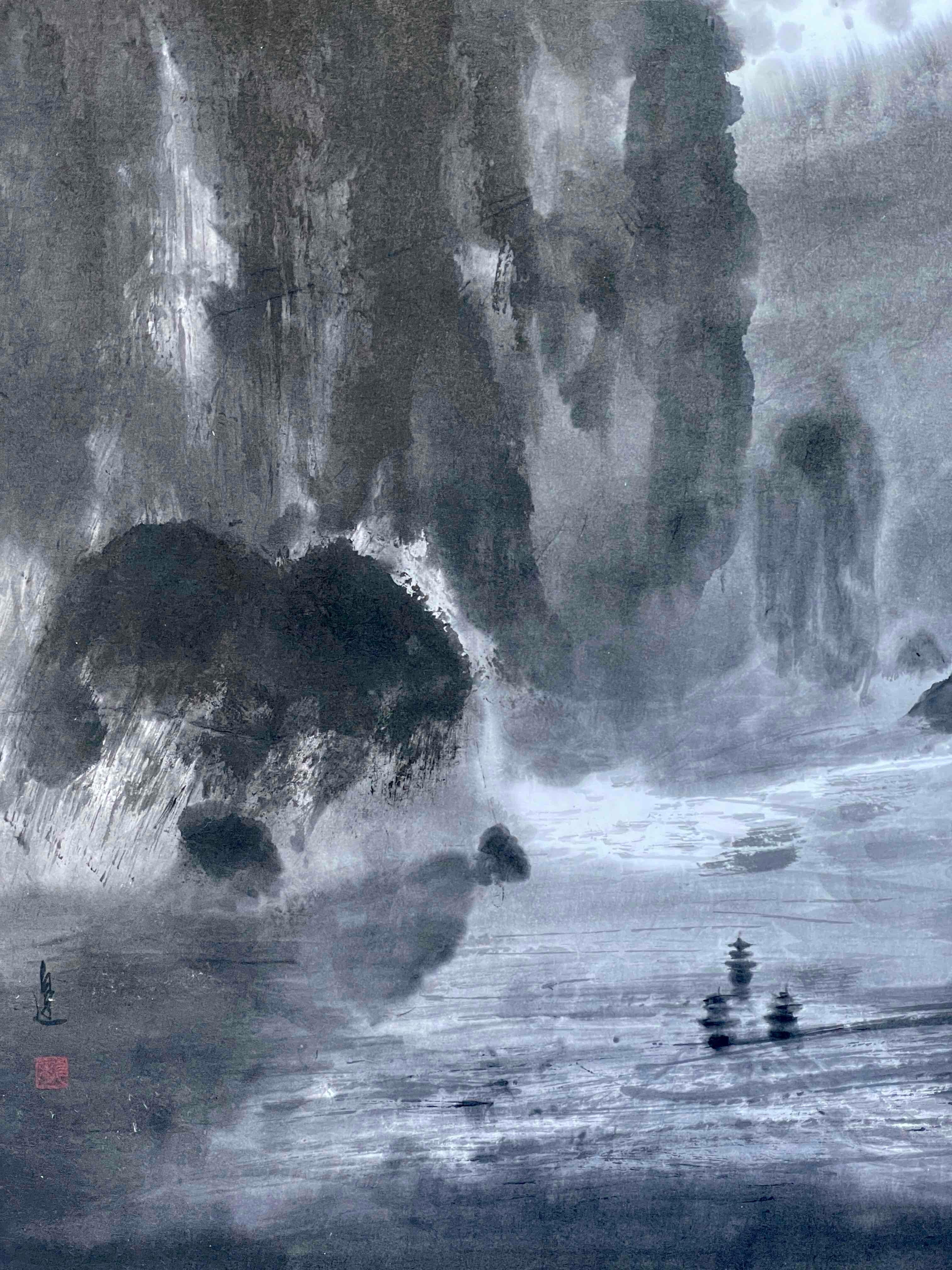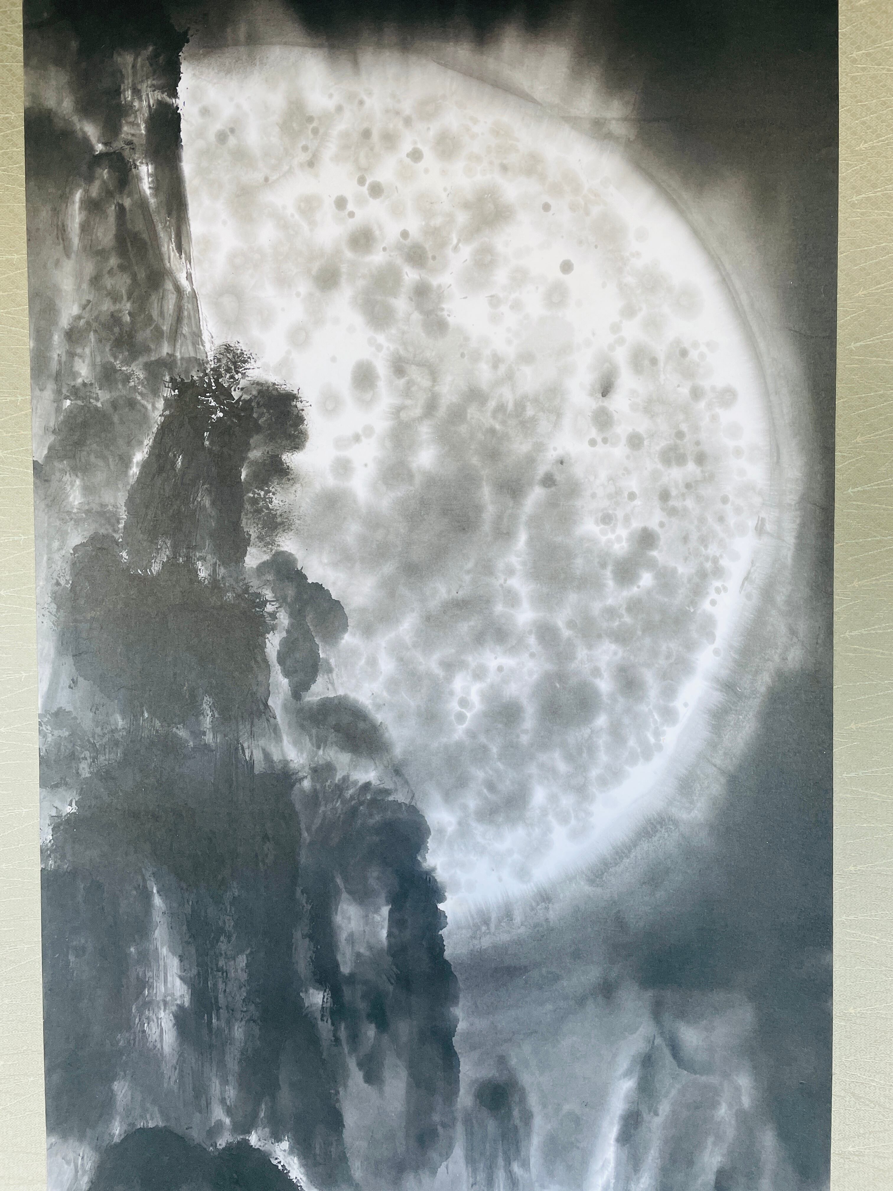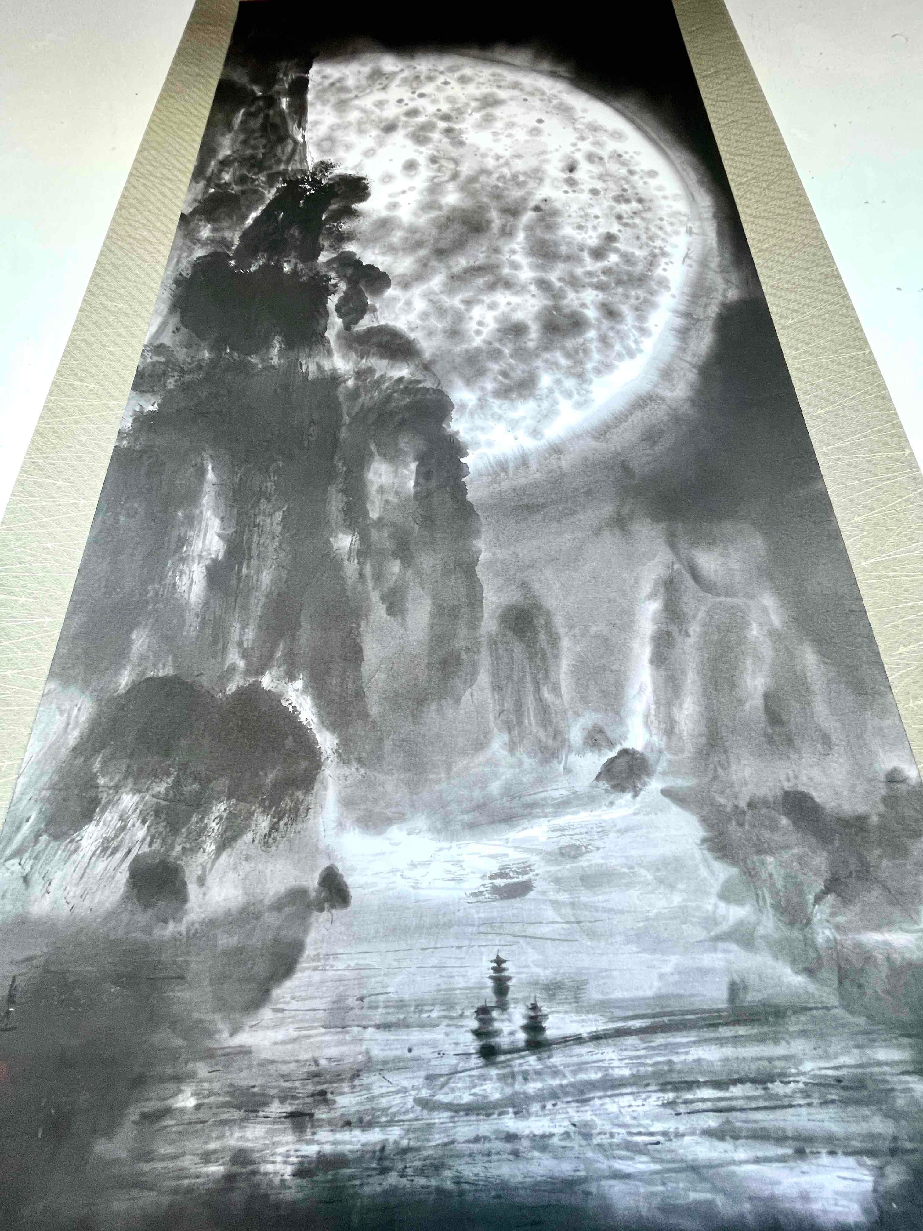 現代水墨画家 絵師白道 「月の陣」(水墨画) 直筆作品 証明書カード付 三国志 船 川 絵 絵画 掛軸