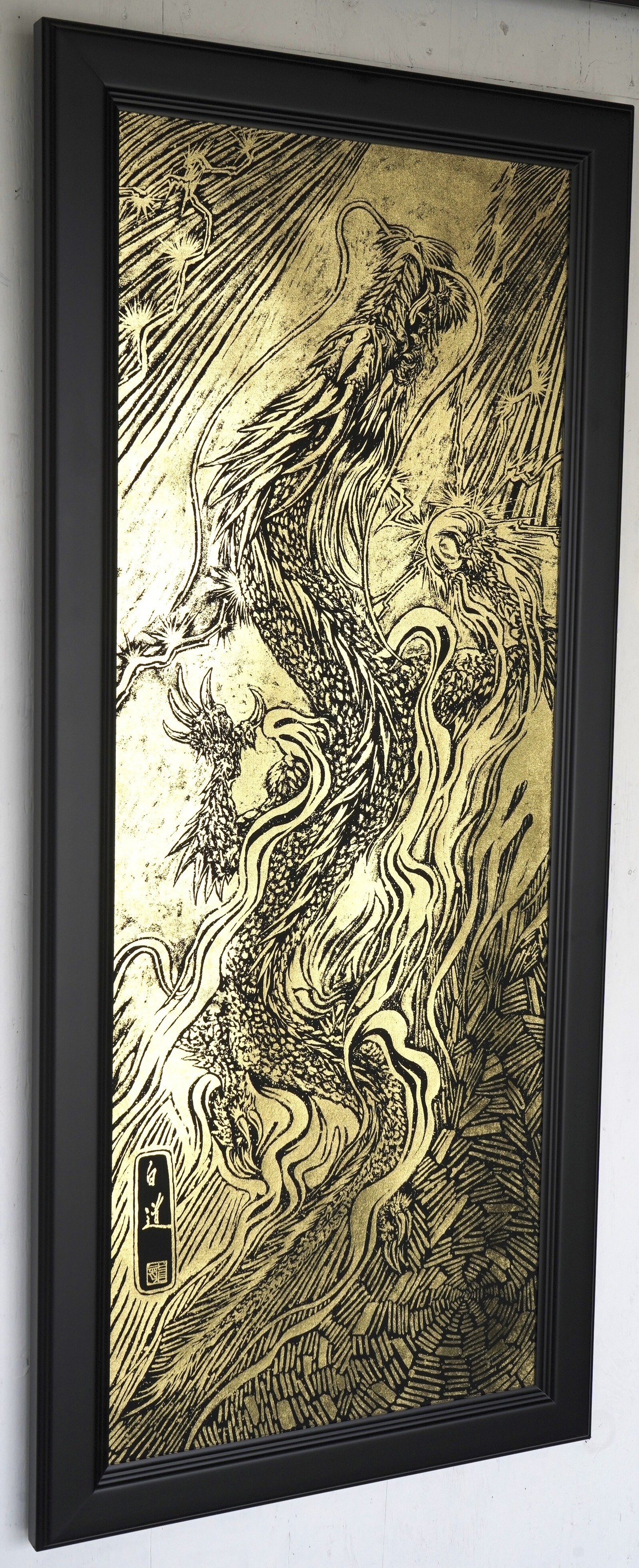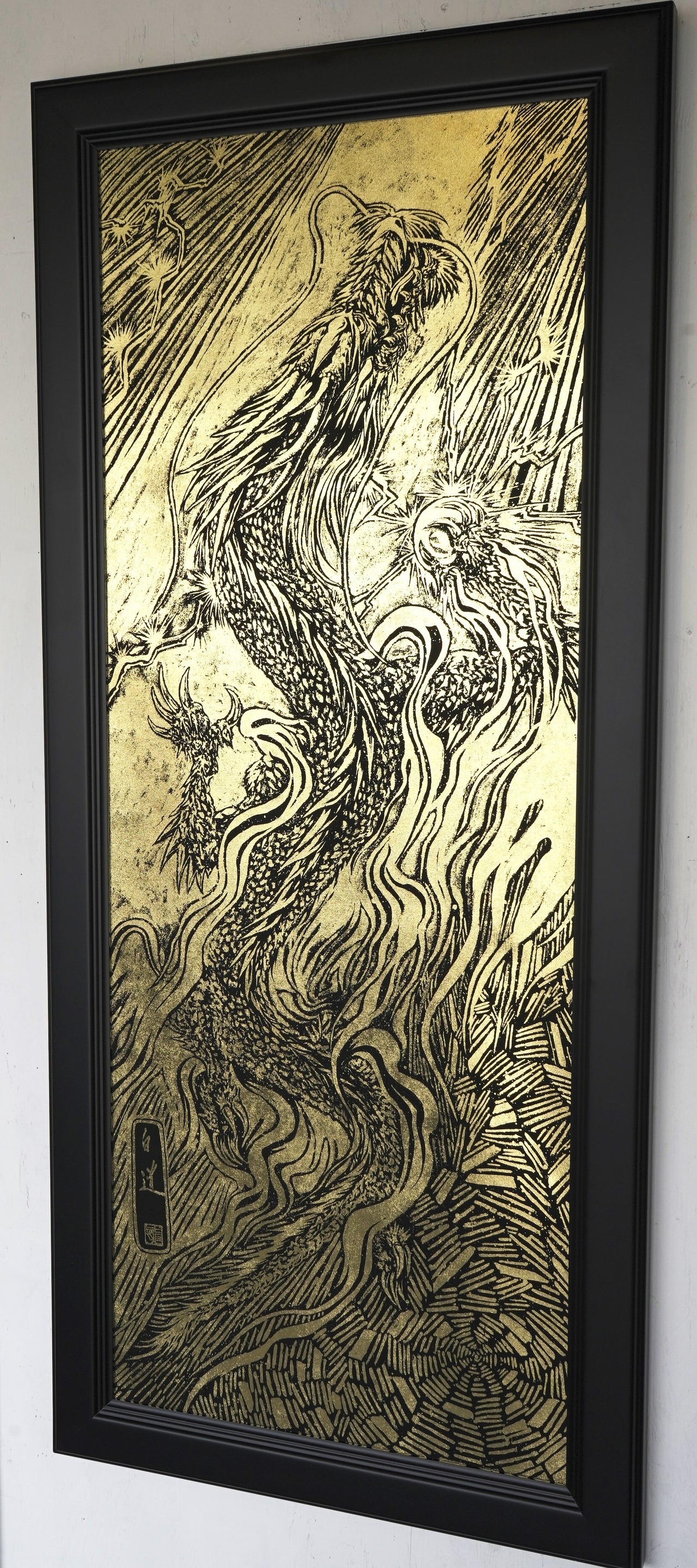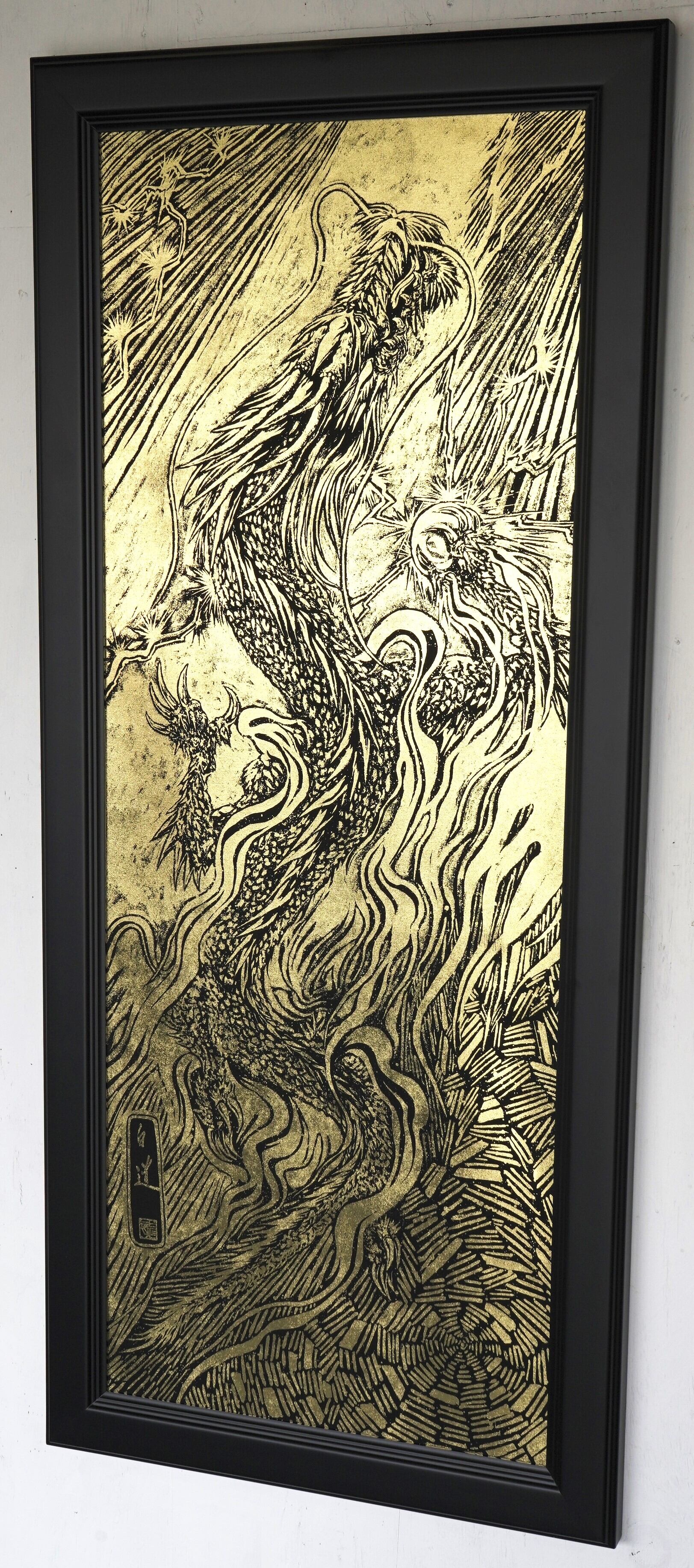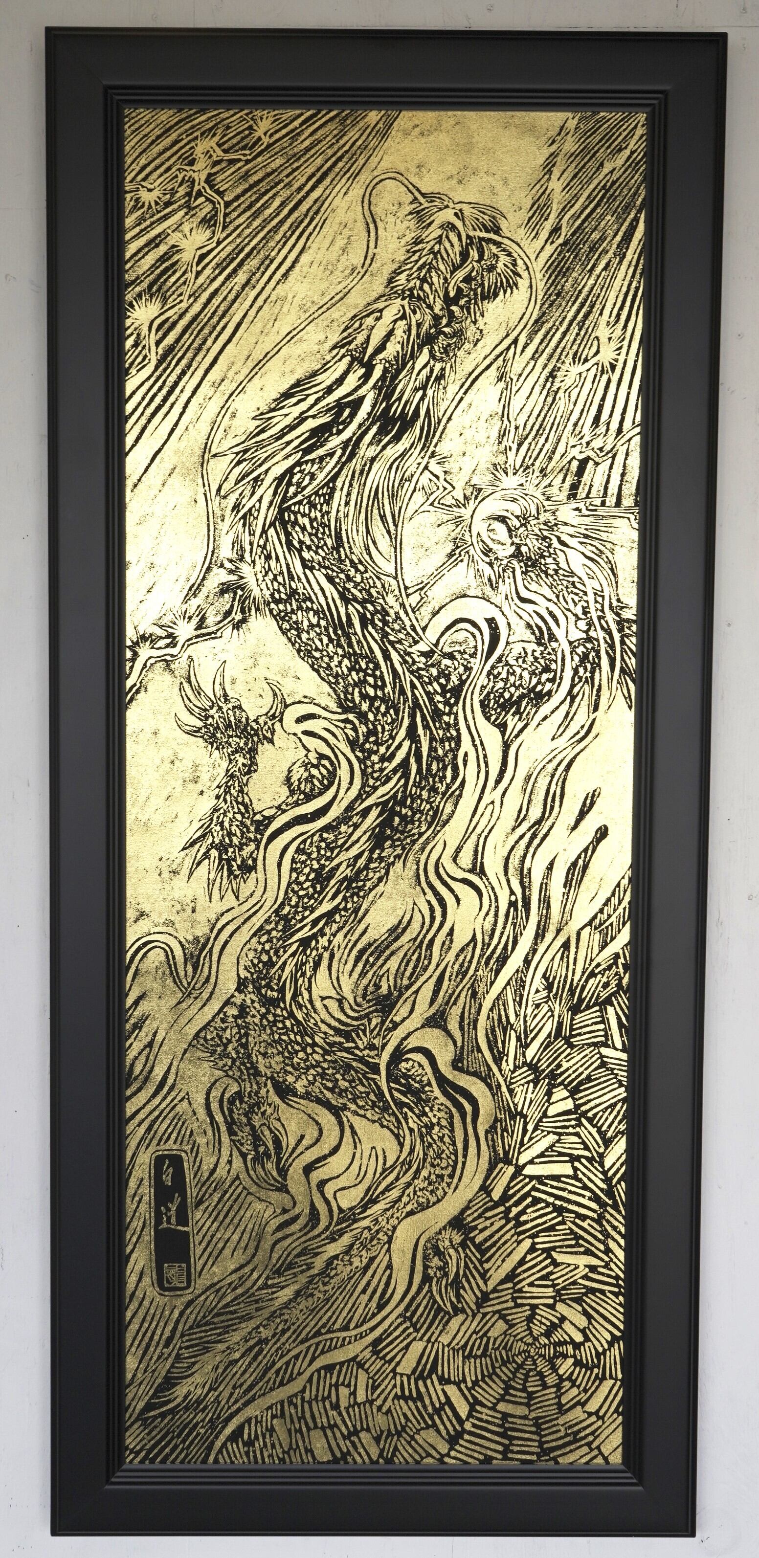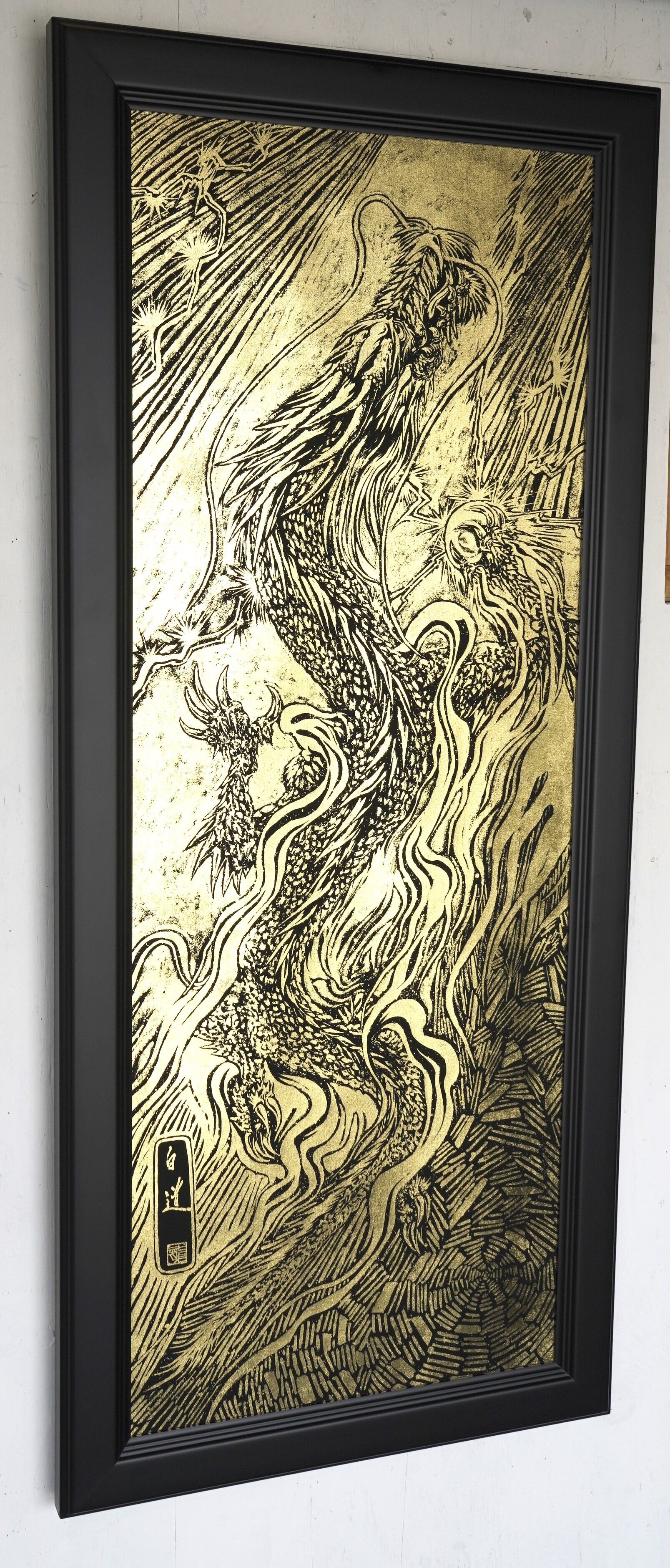 NEW! 現代水墨画家 絵師白道 「黄金昇龍」箔押し作品 (本金箔品質保証書付)額縁(大) 龍 絵 送料無料サービス♪