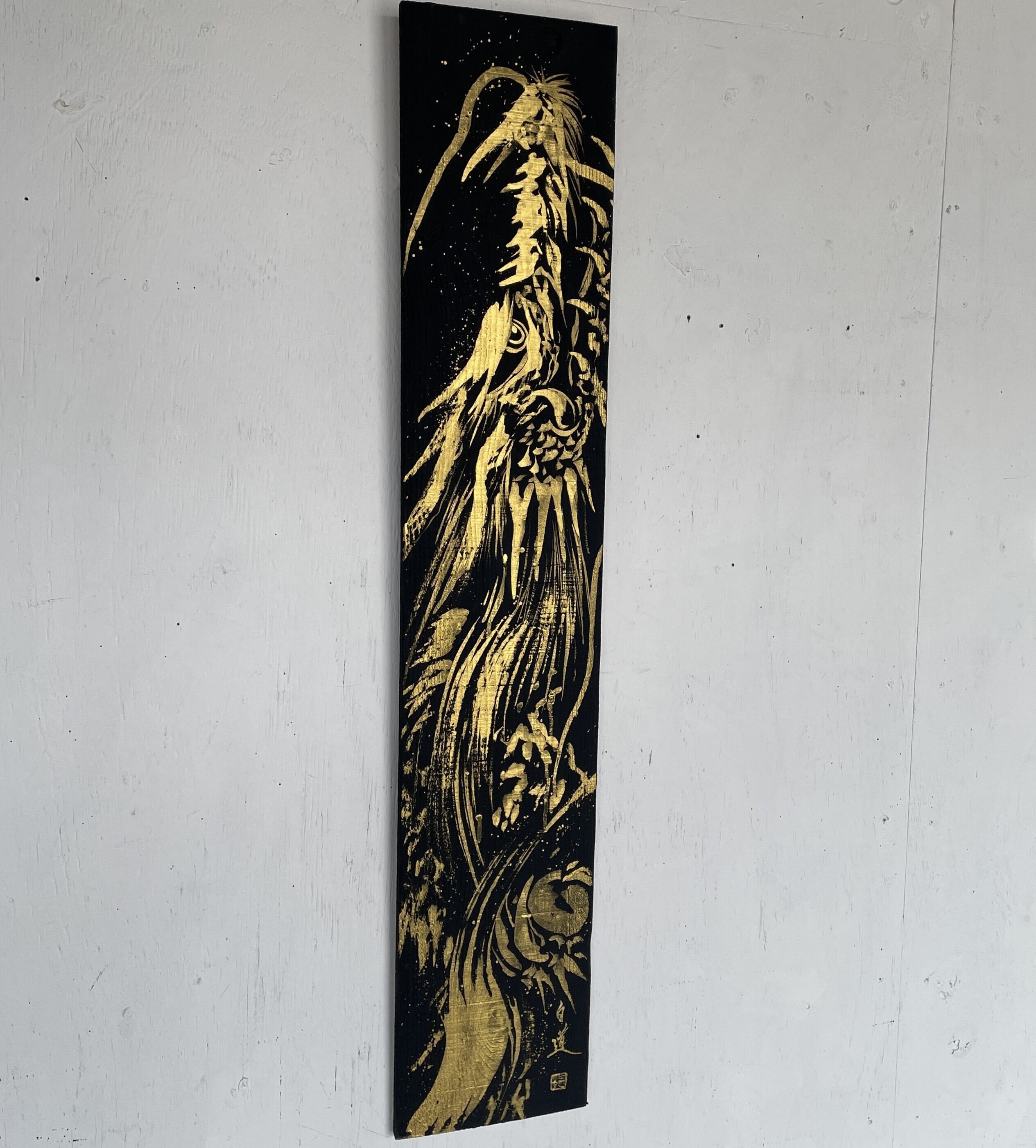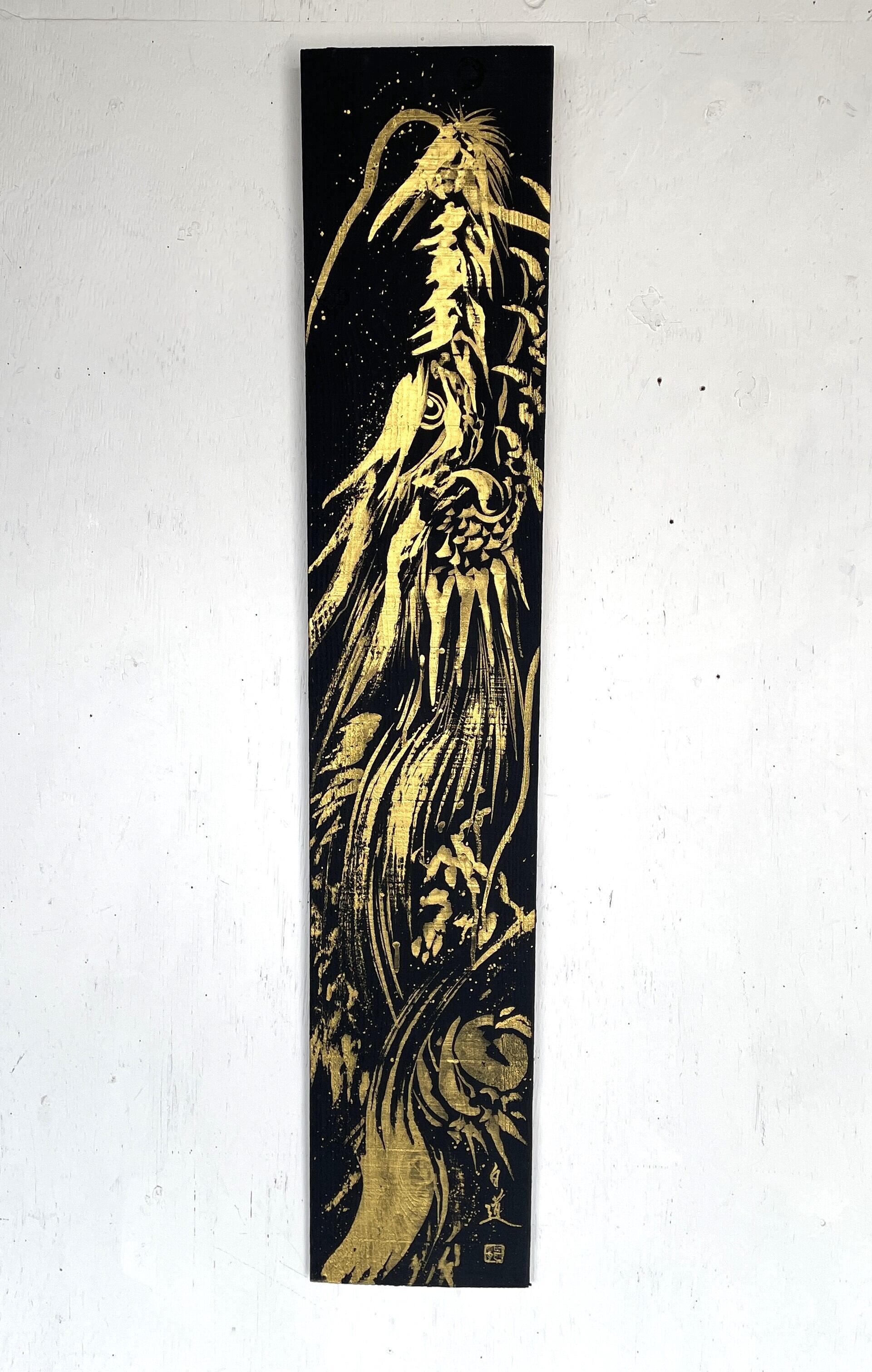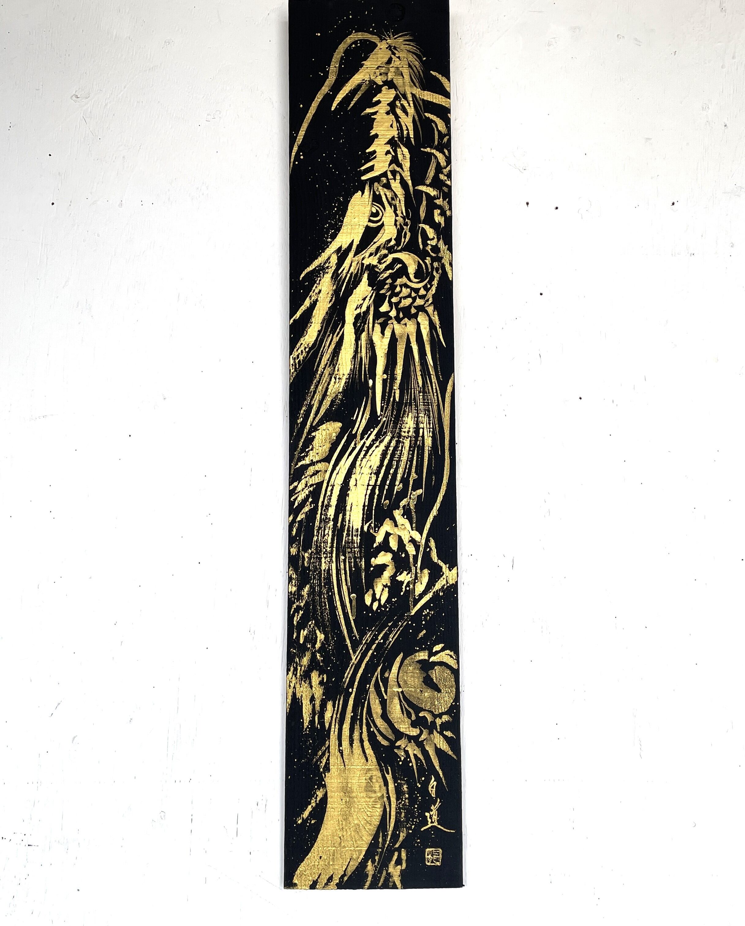 龍や鳳凰などの縁起の良いモチーフを描くことが多く、力強く躍動感のある筆致が特徴。純金など異素材を融合させた作品も手掛けています。