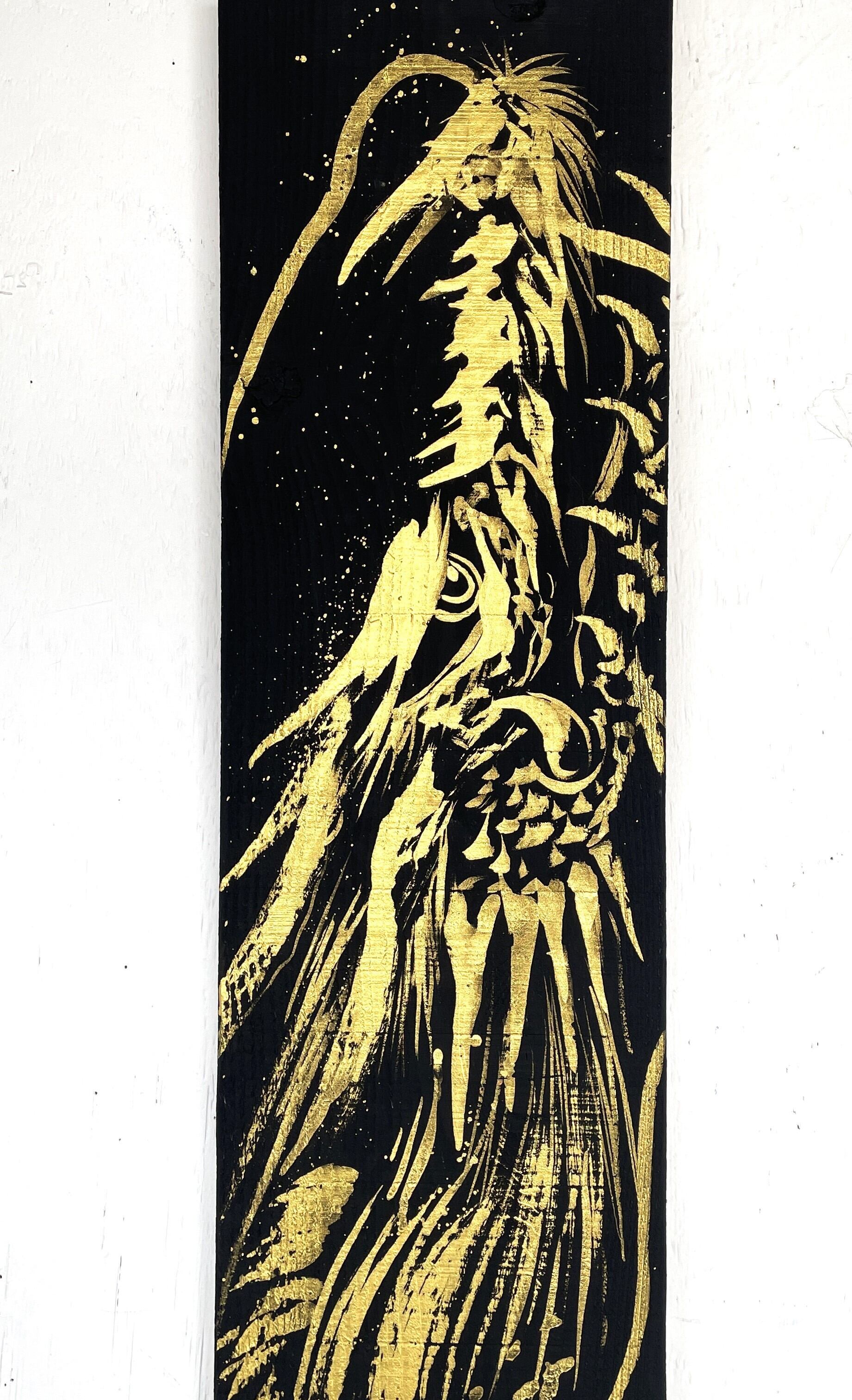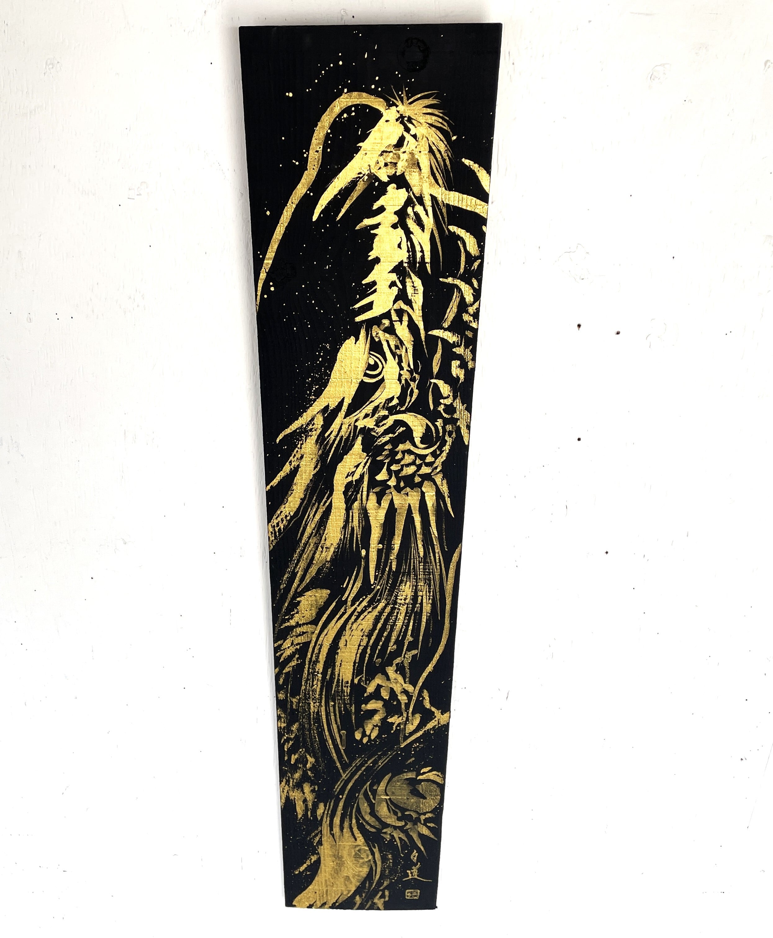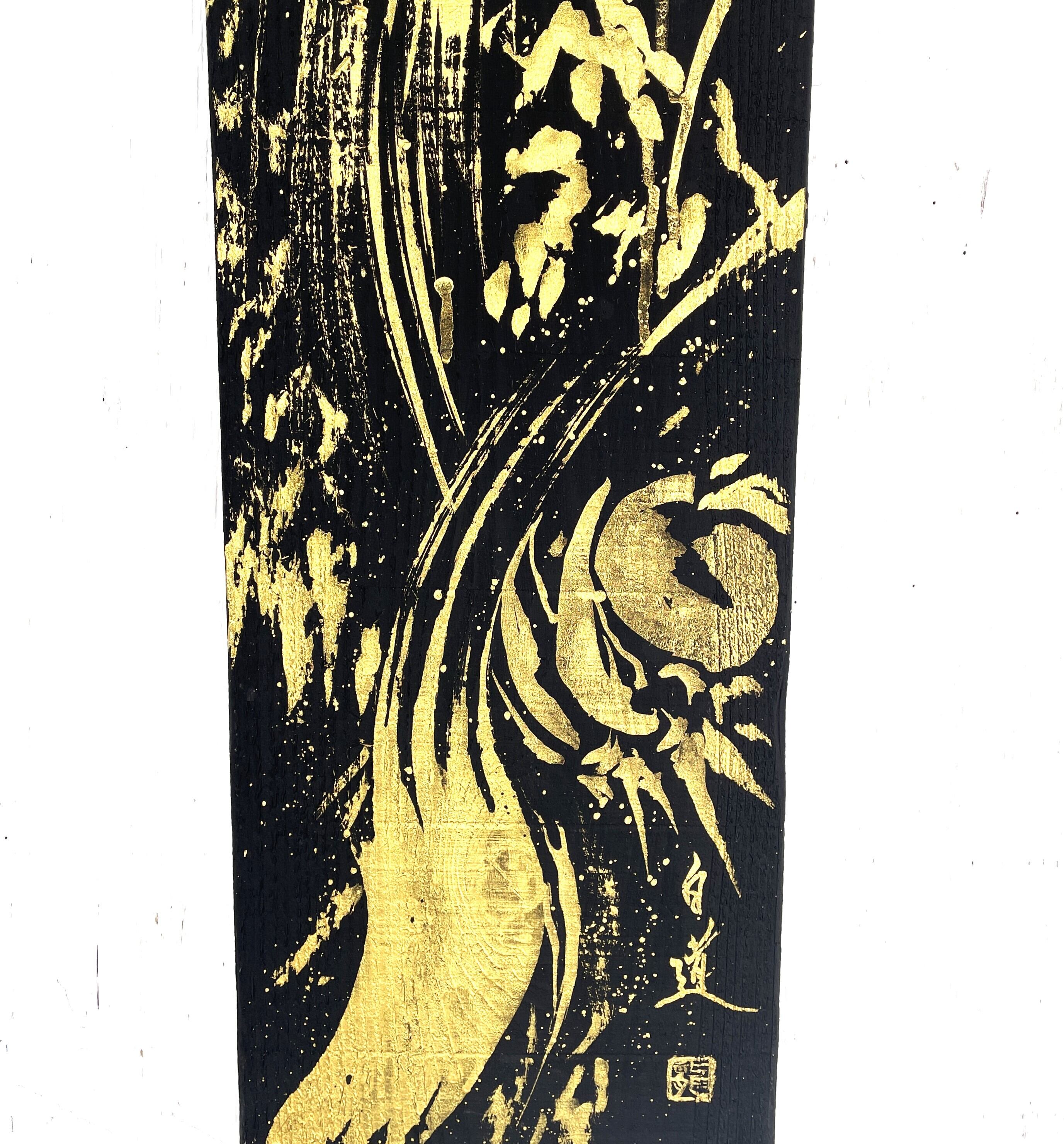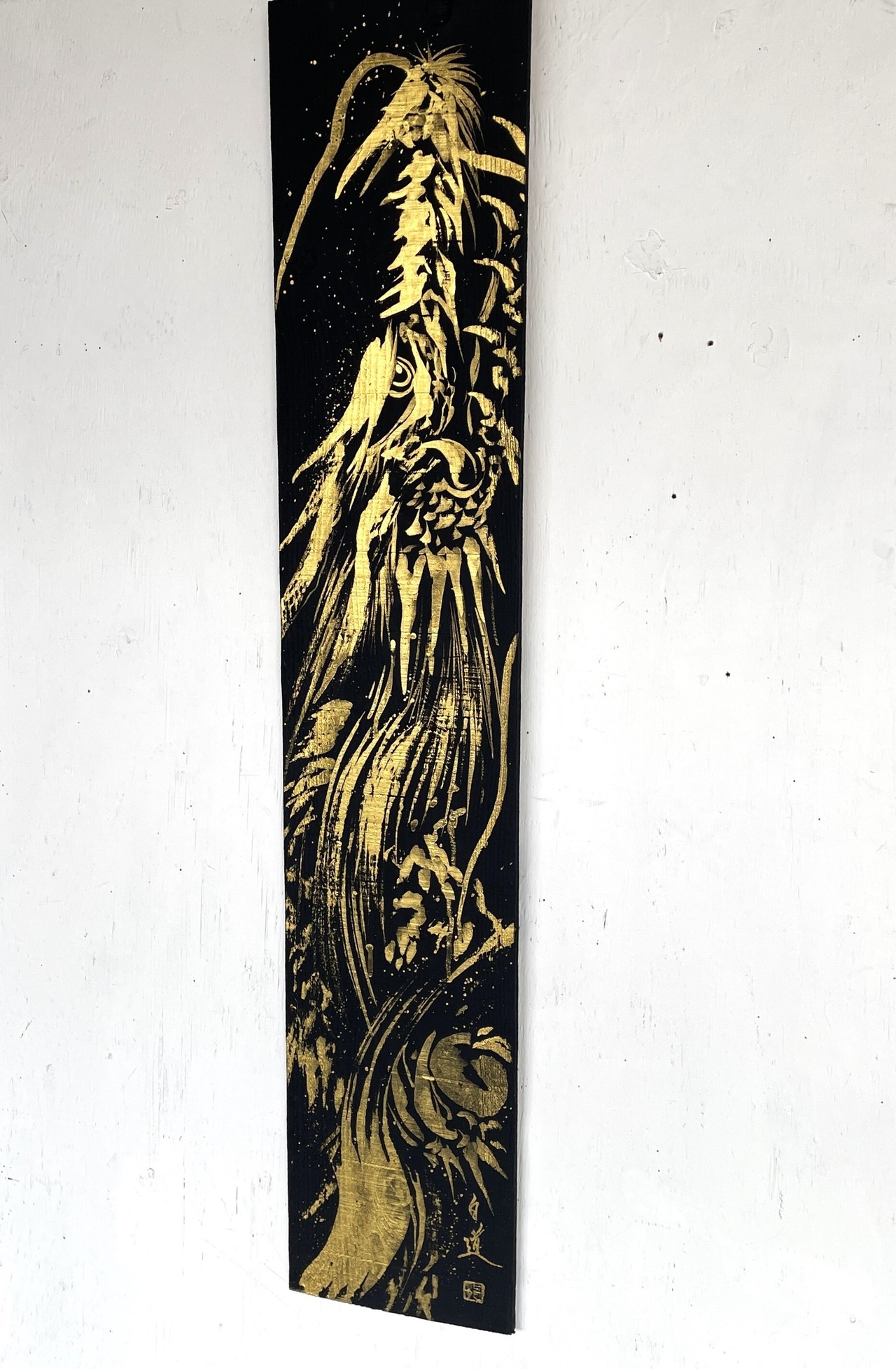 龍や鳳凰などの縁起の良いモチーフを描くことが多く、力強く躍動感のある筆致が特徴。純金など異素材を融合させた作品も手掛けています。