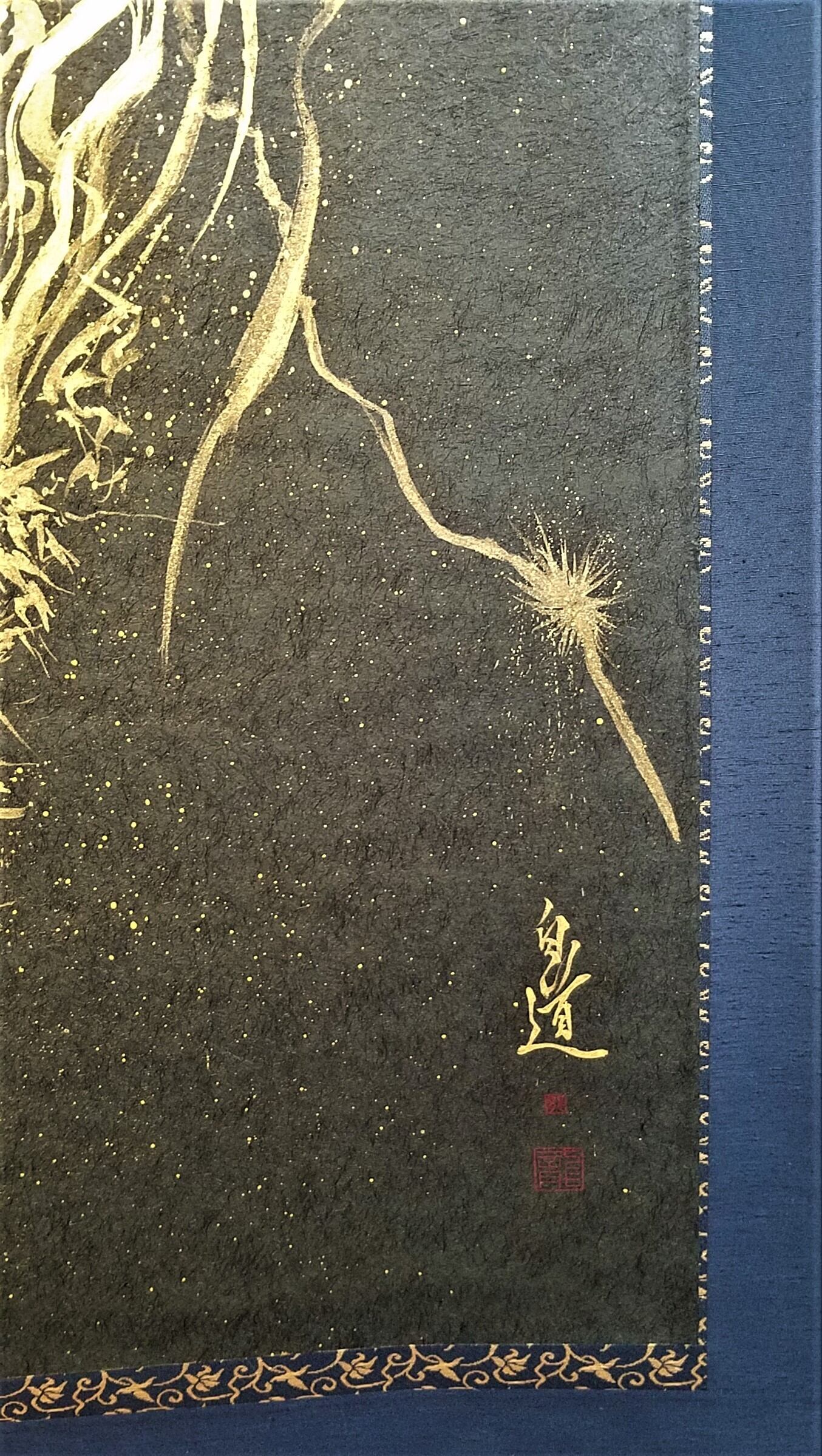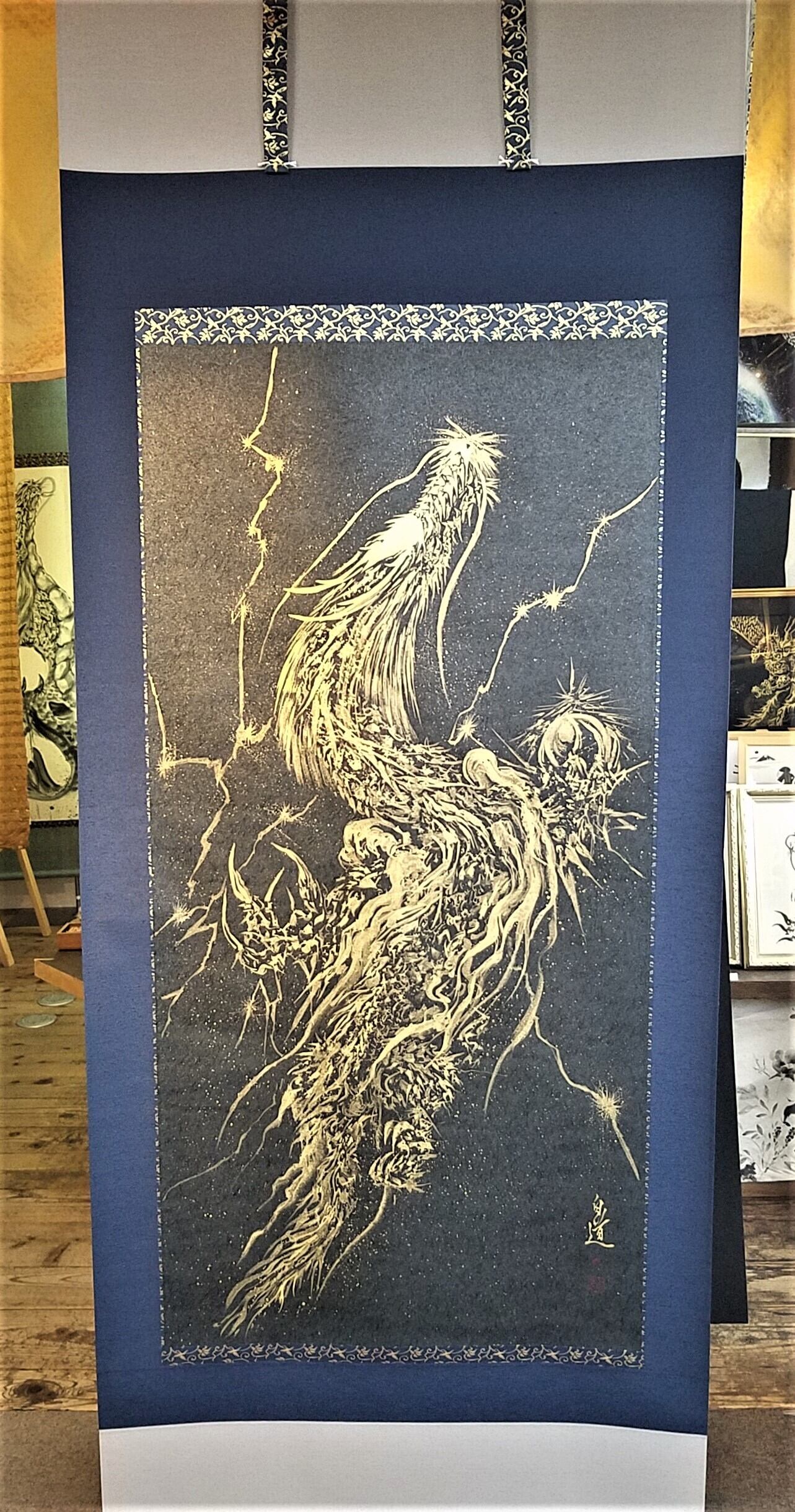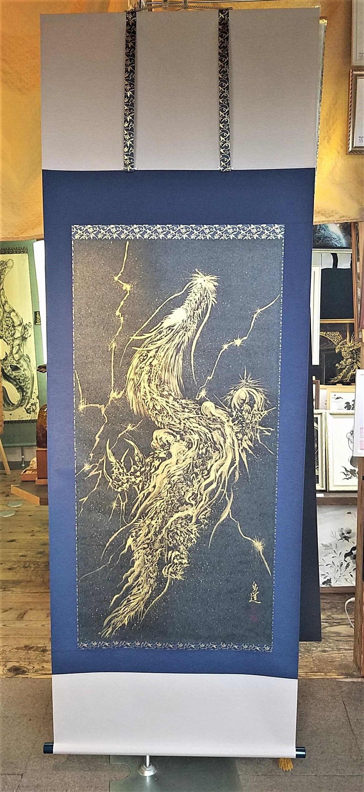 この「金龍昇雷電」は、その伝統的な意味を表現した、直筆作品であり、細部まで緻密に描かれた金色の鱗や、雷のエネルギーを感じさせる神秘的な表現は、絵画の鑑賞だけでなく、その力強さに感動することができます。