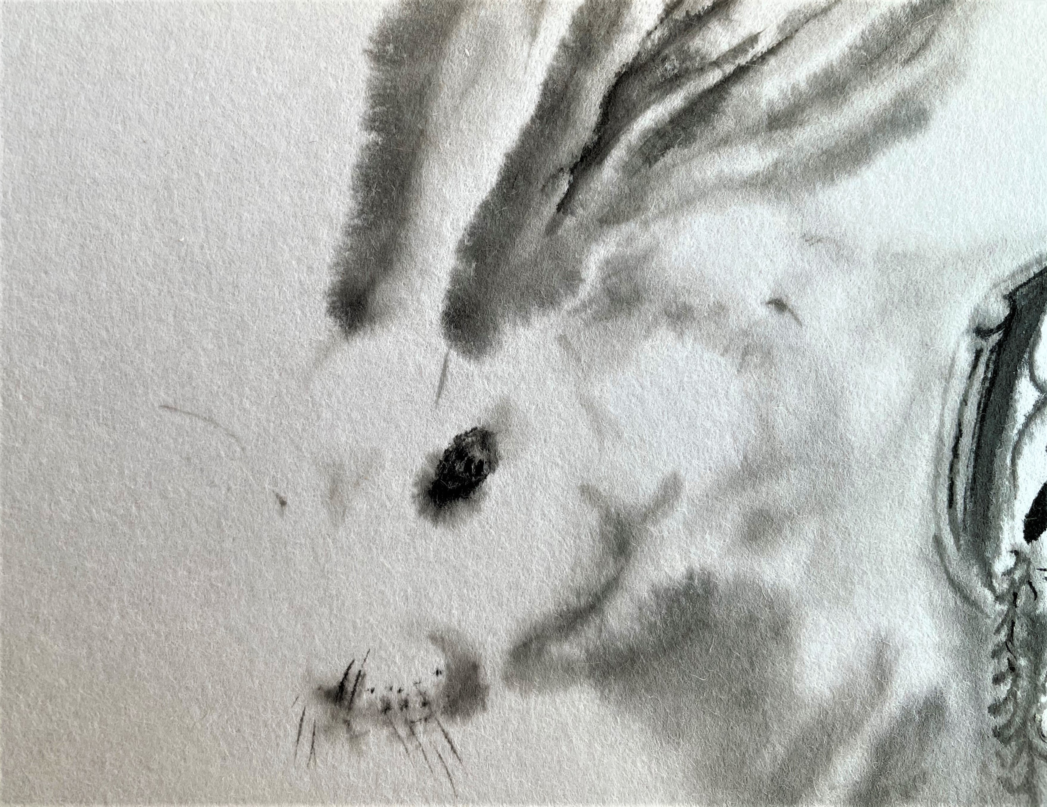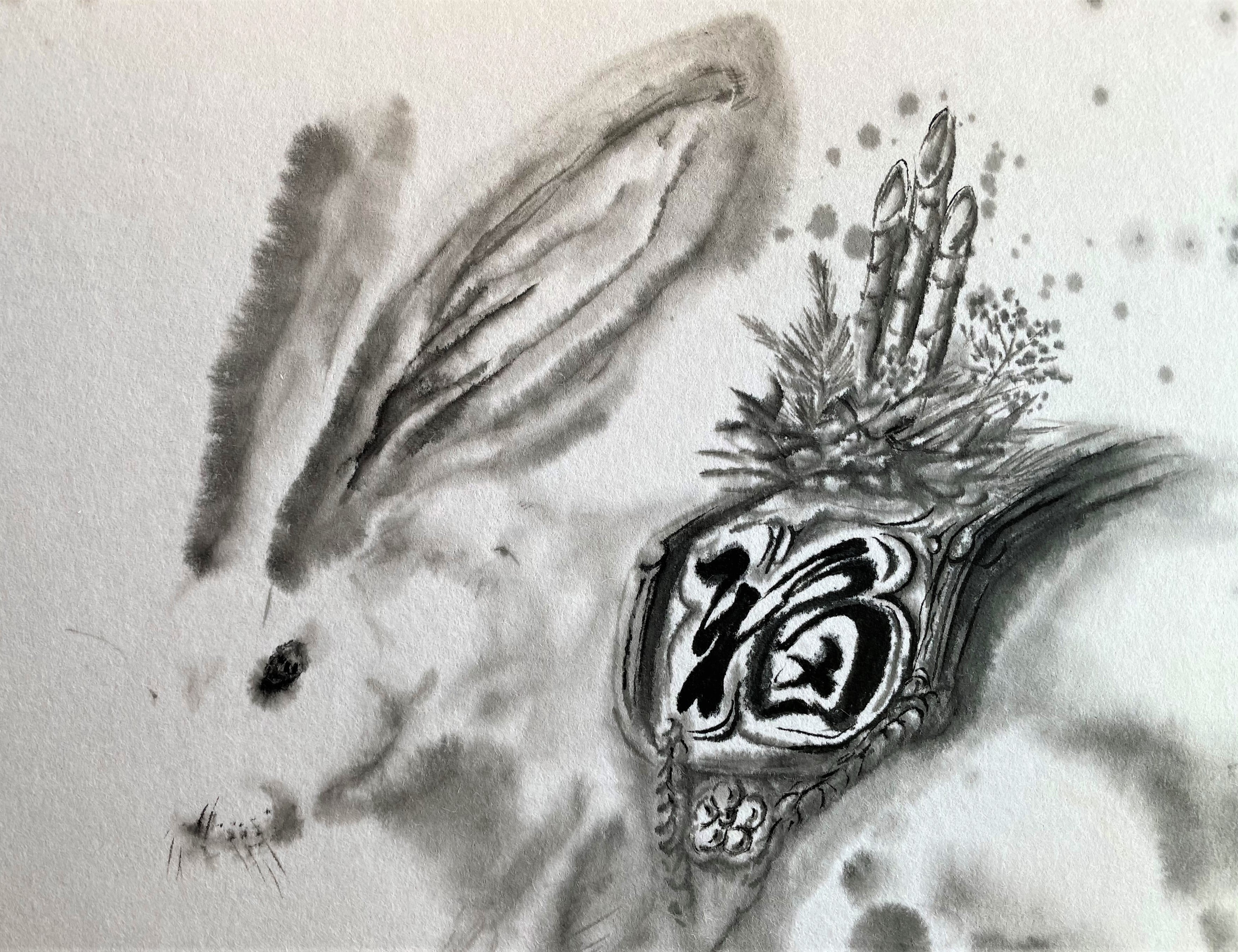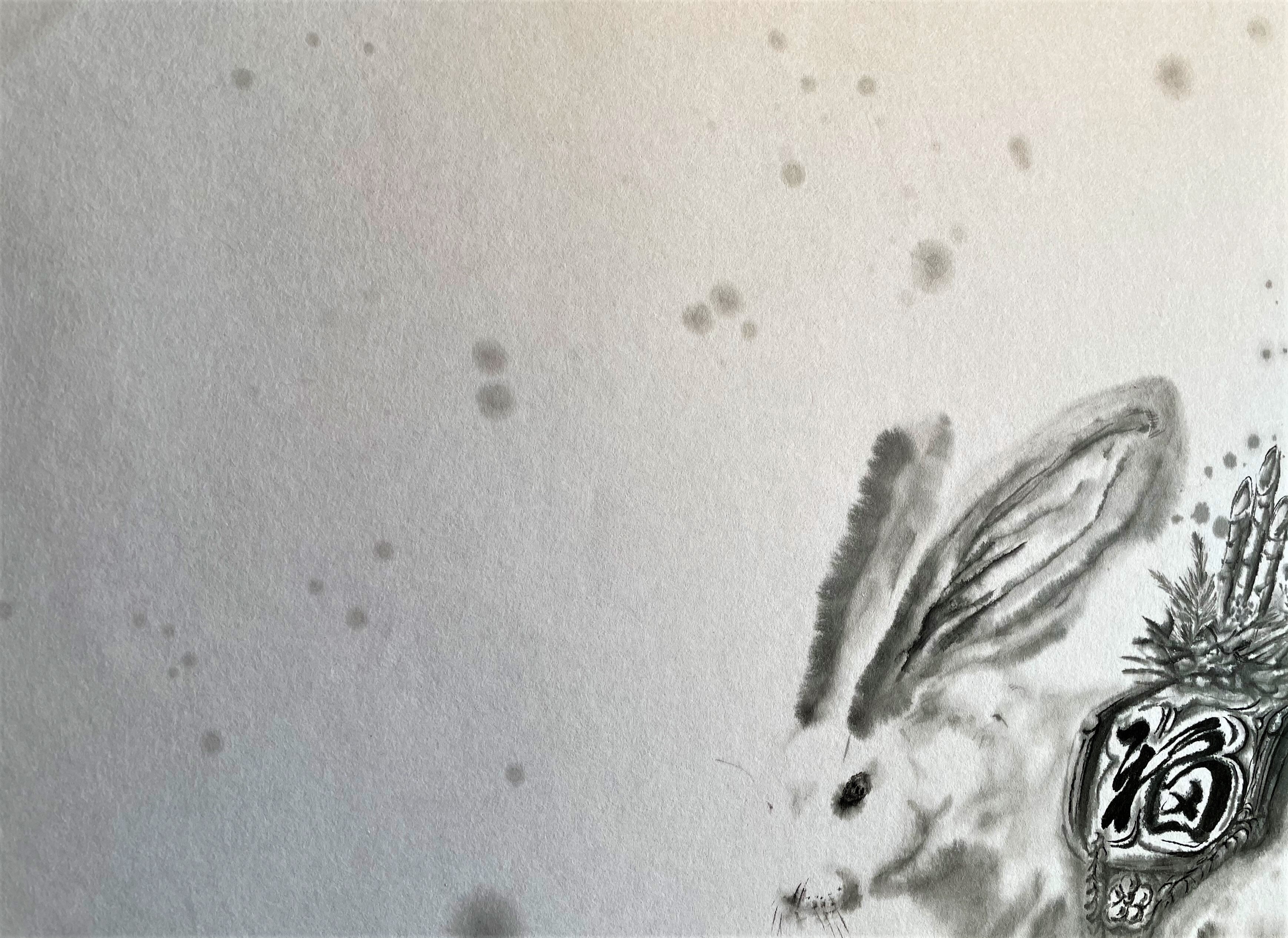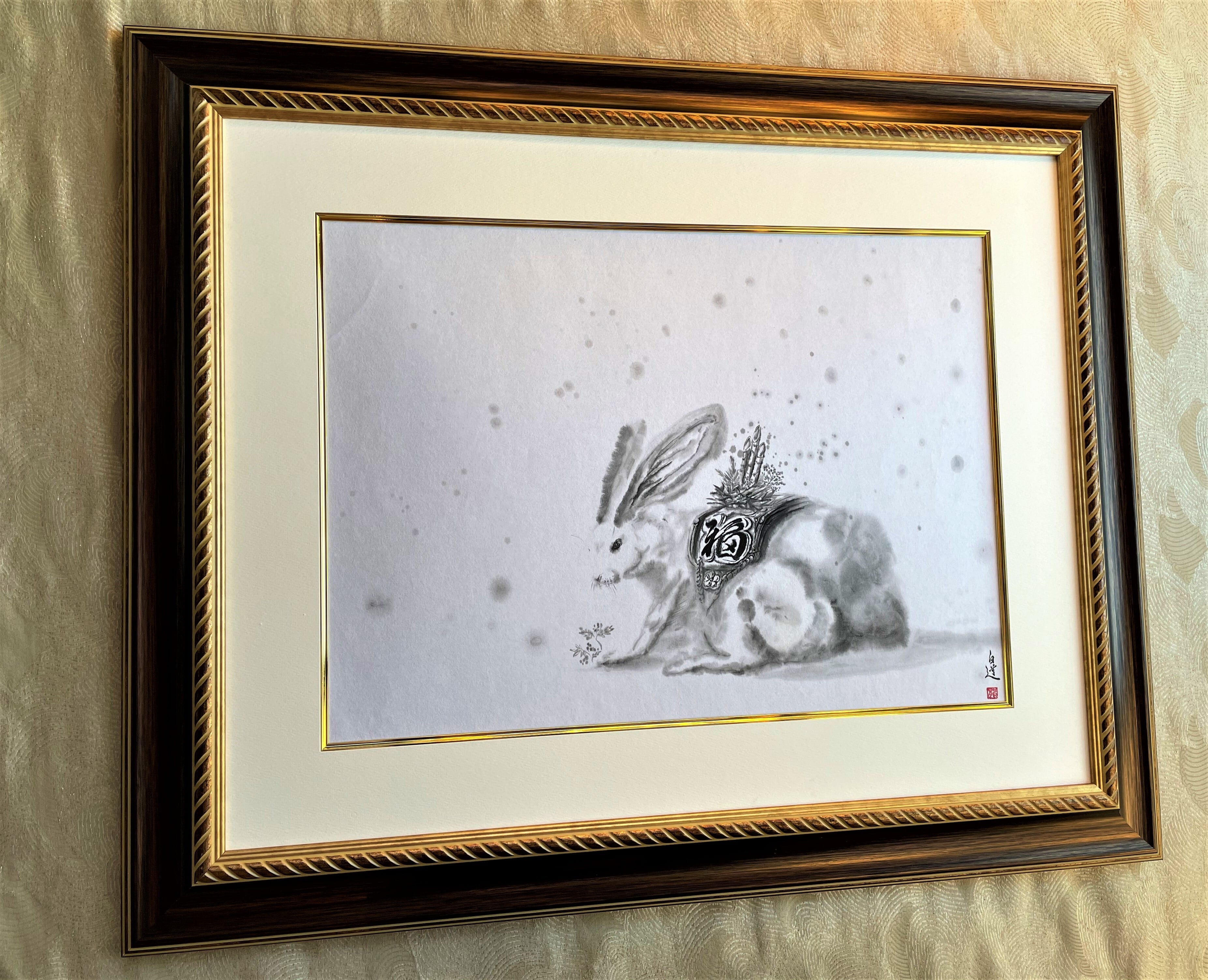 ☆「福うさぎ」(真筆証明書付き) 墨絵 絵画 ART 直筆作品 送料無料♪