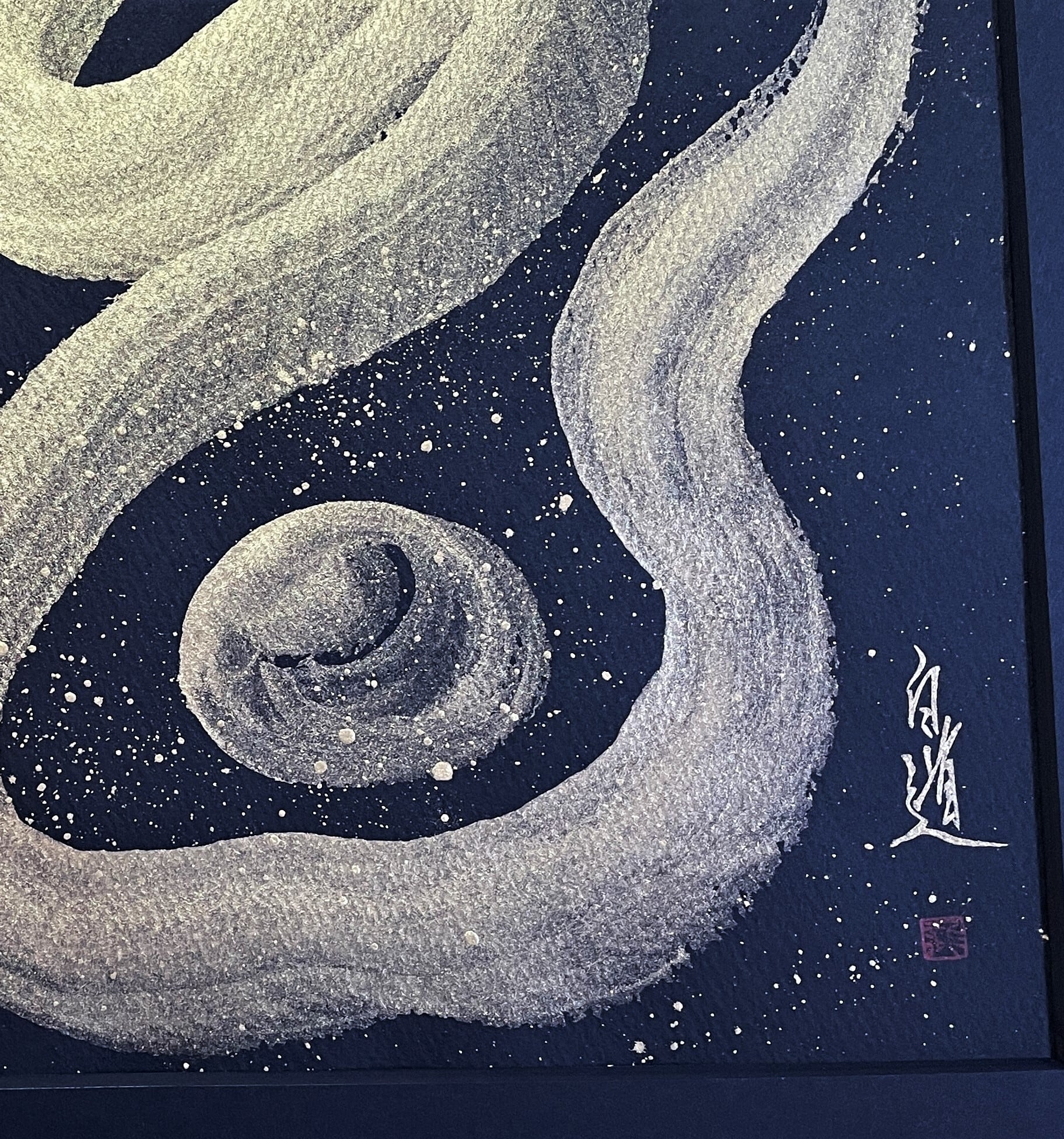 一筆描きという技法を使い胴体にウロコを表現しながら福の文字にして描いています。