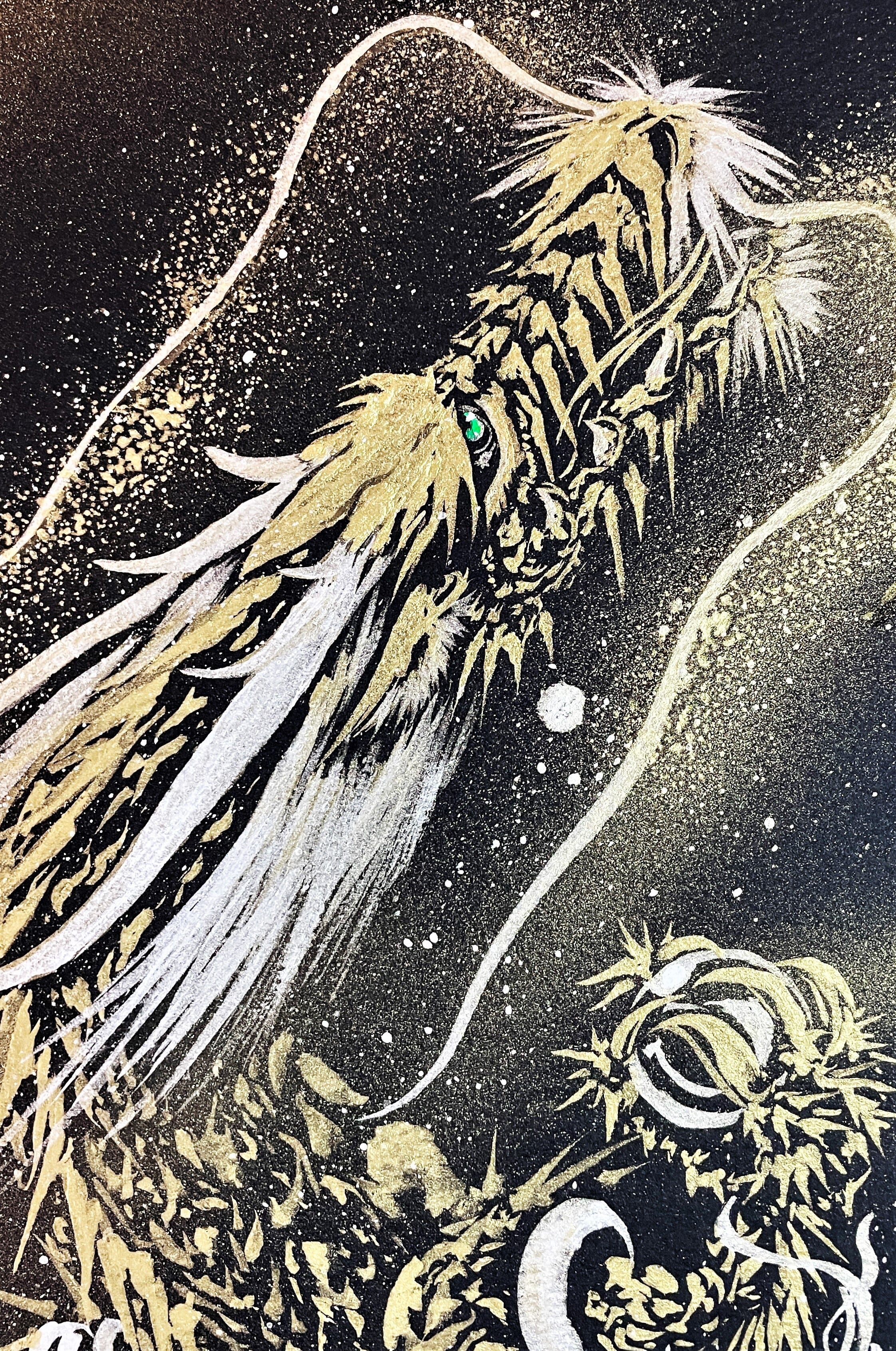 うねる体をおもいっきり使って勢いよく天に昇っていく金龍の姿を描きました。
