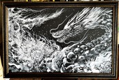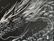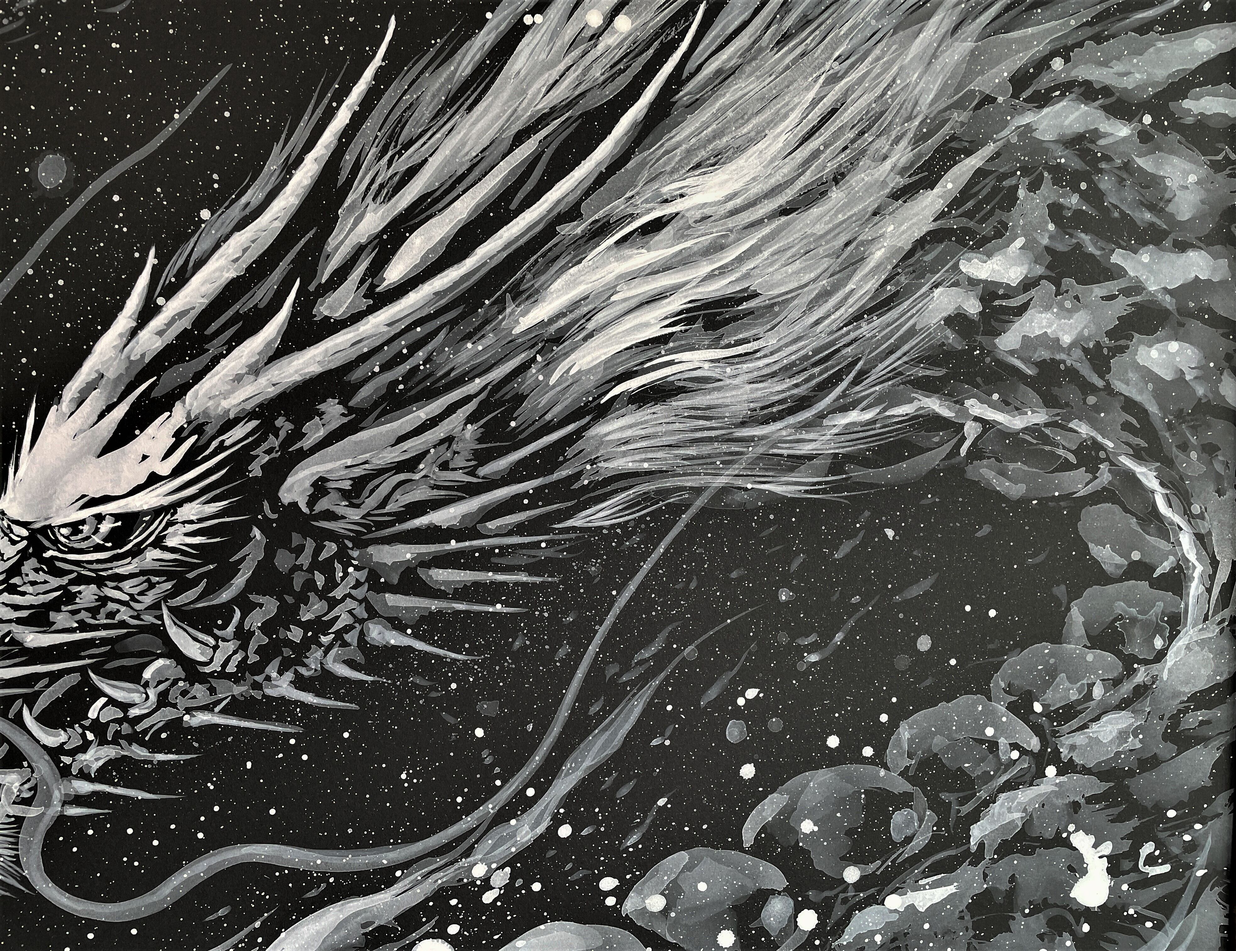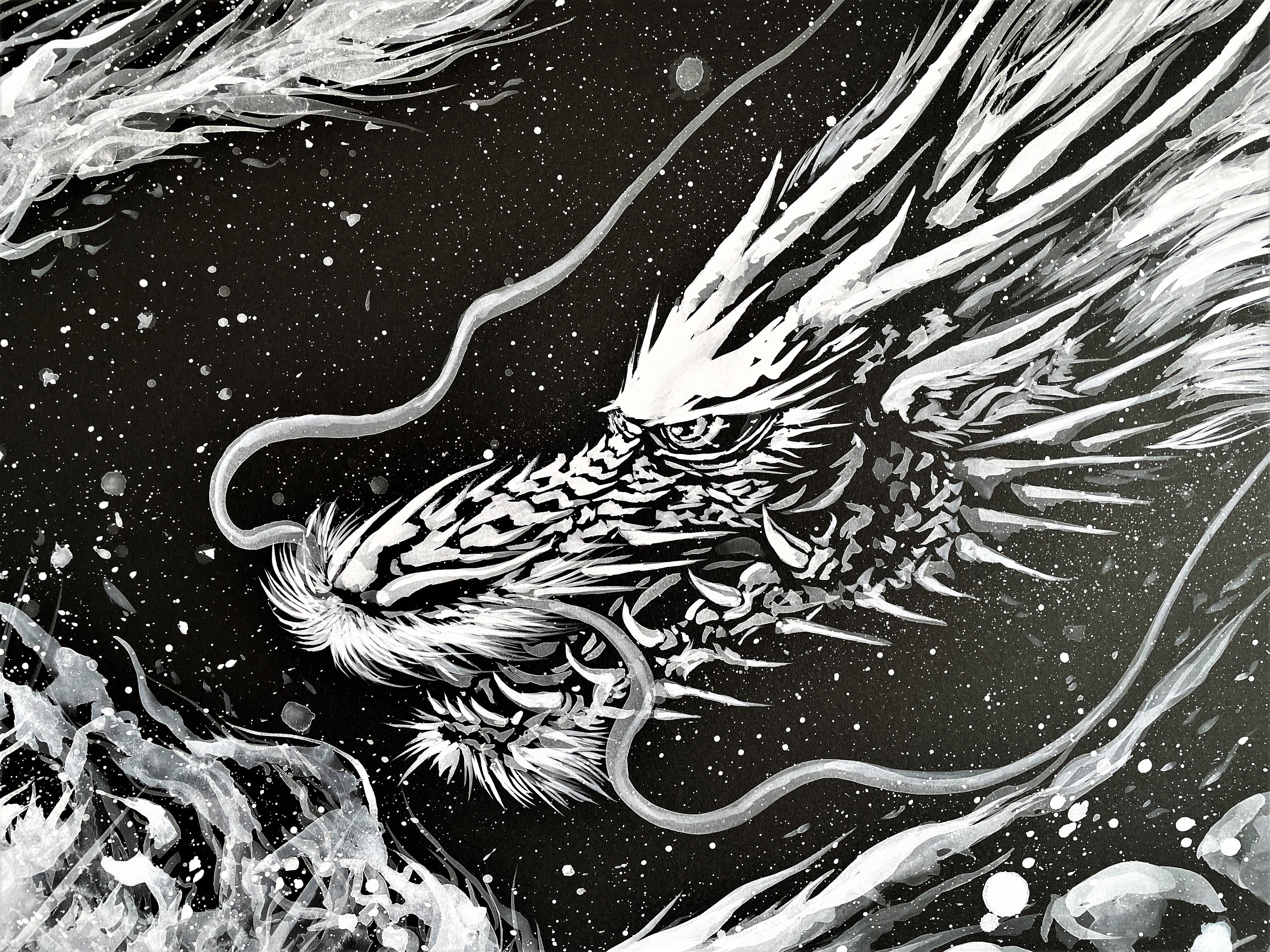 雄大な世界感でどっしりとした腰を据えた白龍の姿をアクリル絵具、白一色で描きました。