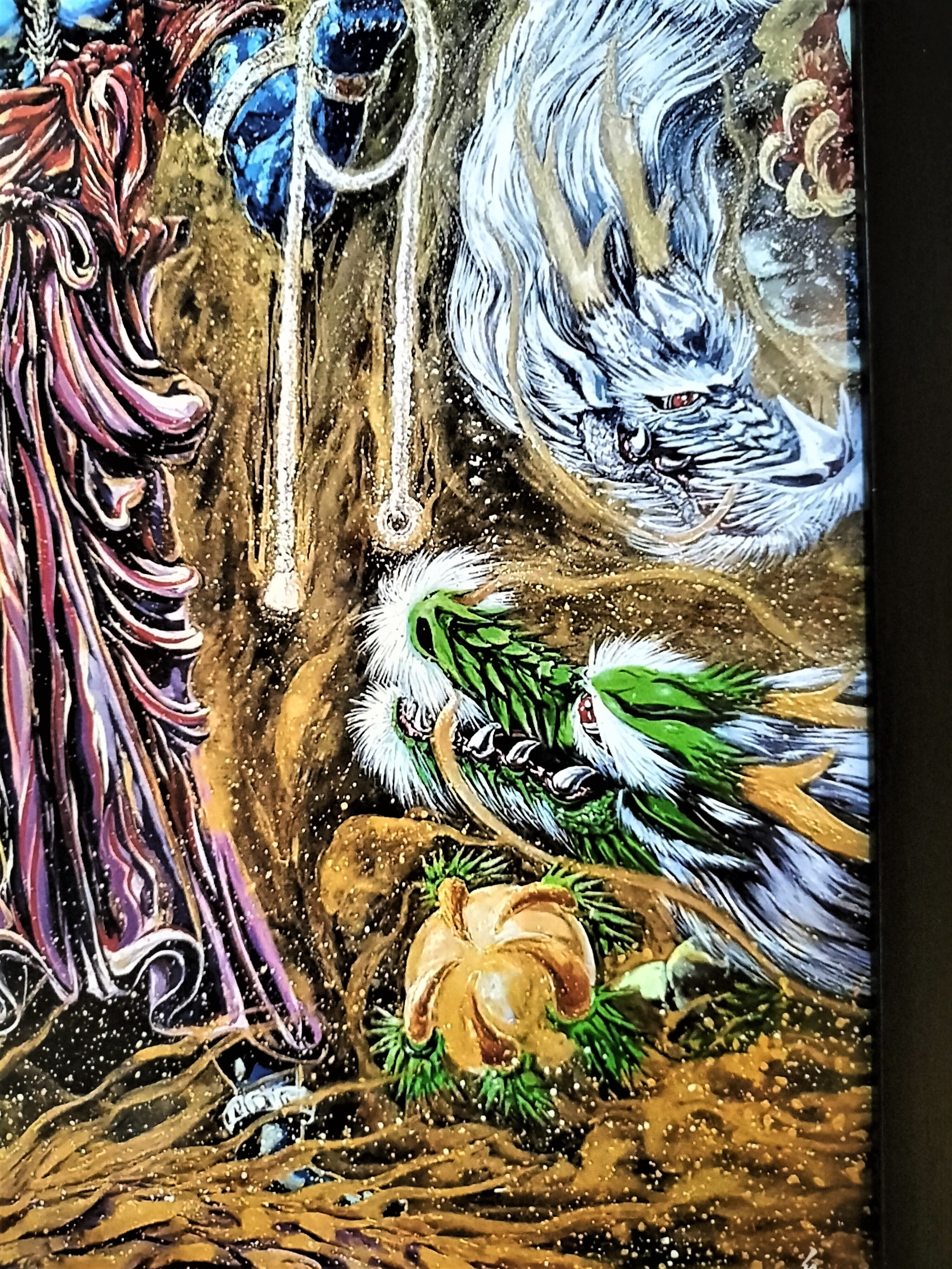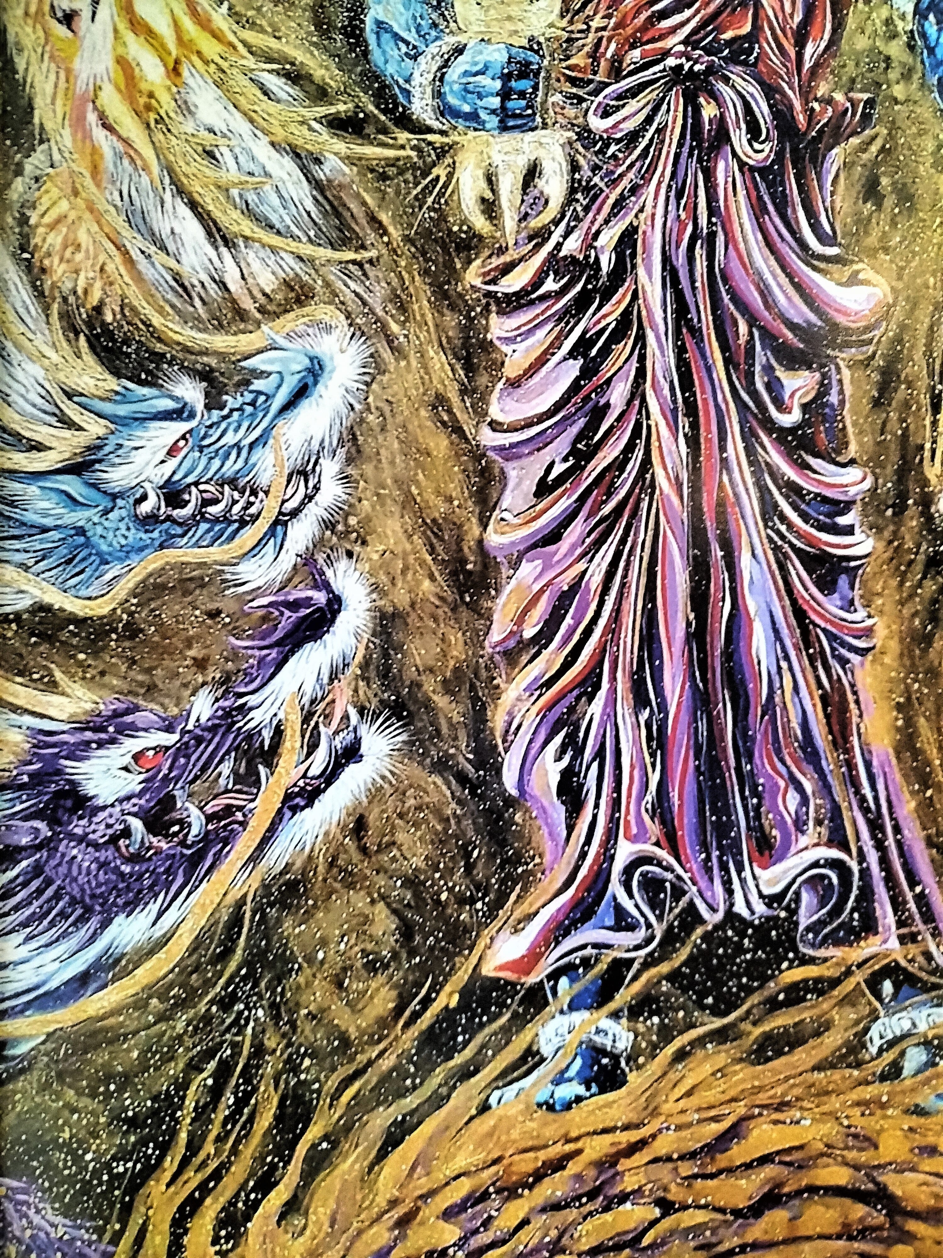 相反する存在を一画面に描いたとき「火」を描こうとはならず、また、「水」の波を描くこともなく、そこには金色で描いた大気がうねり狂ったように現れ静寂さえ感じさせる不思議な絵になりました。
