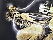 一筆描きという技法で胴体のウロコを表現しながら、福の文字を描いています。