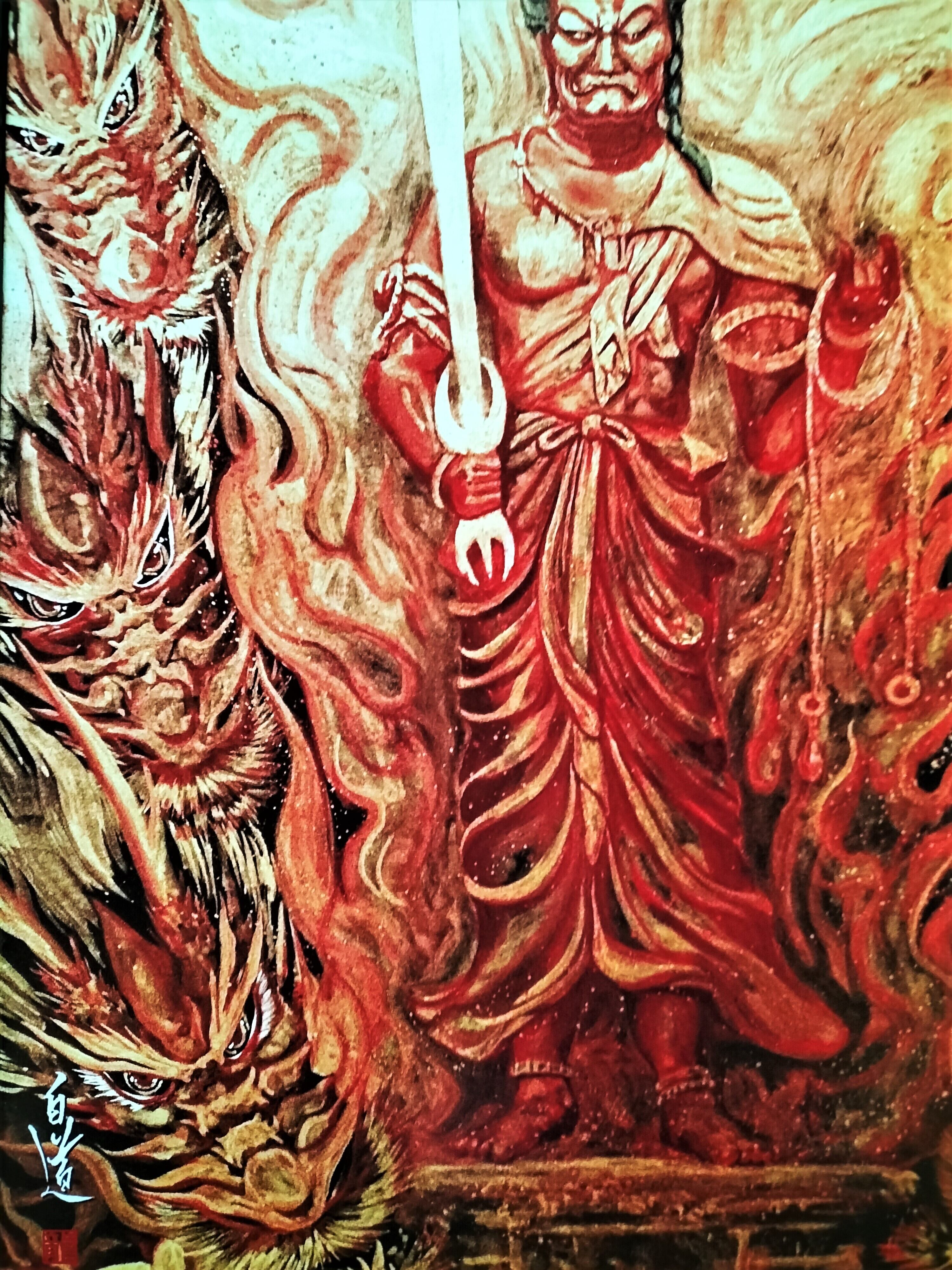 現代芸術家 絵師白道 「炎の赤不動明王と八大龍王」(複製画) 直筆サインあり /Hakudouroom. ART 不動 明王 仏 龍 絵 絵画