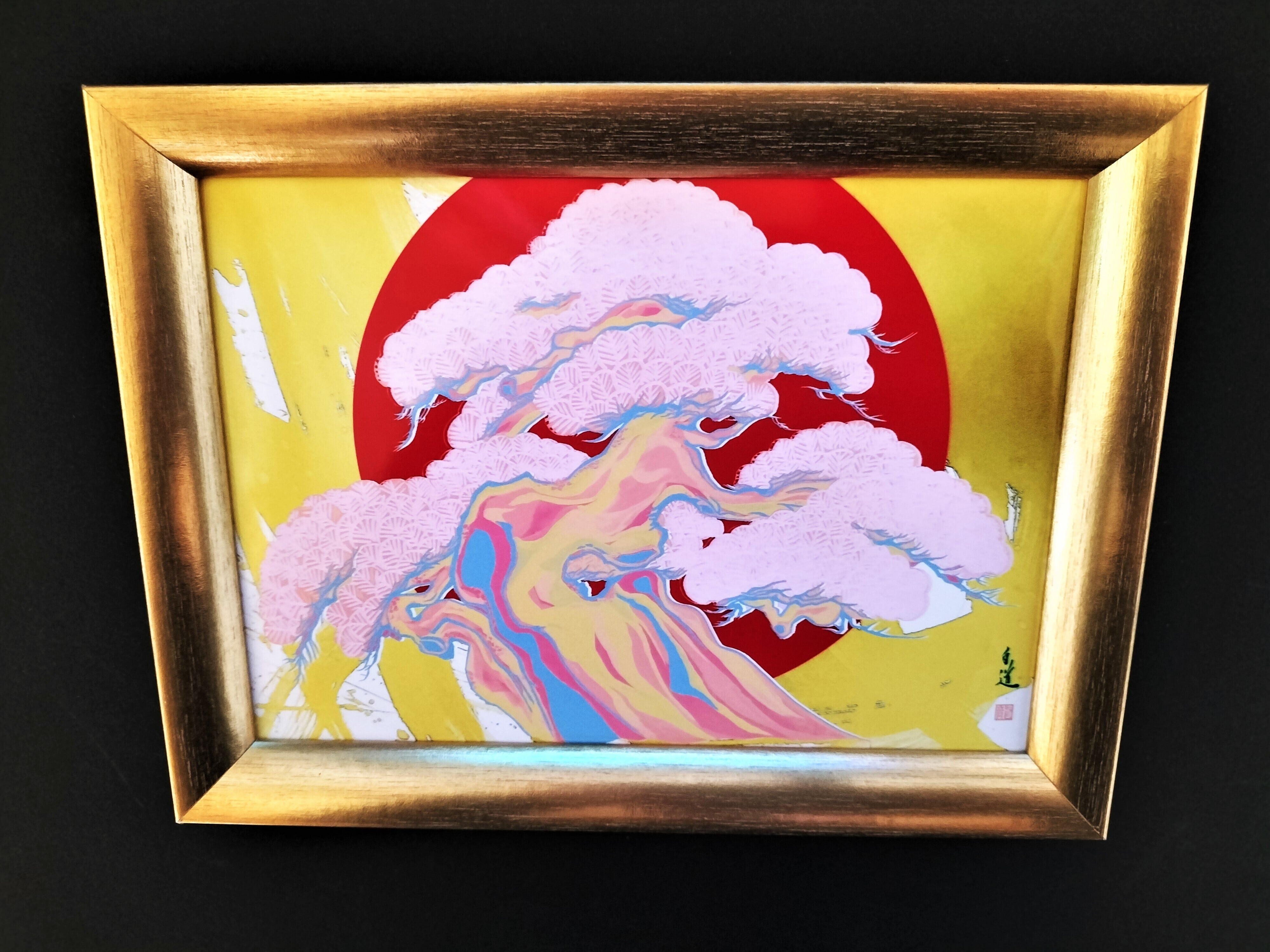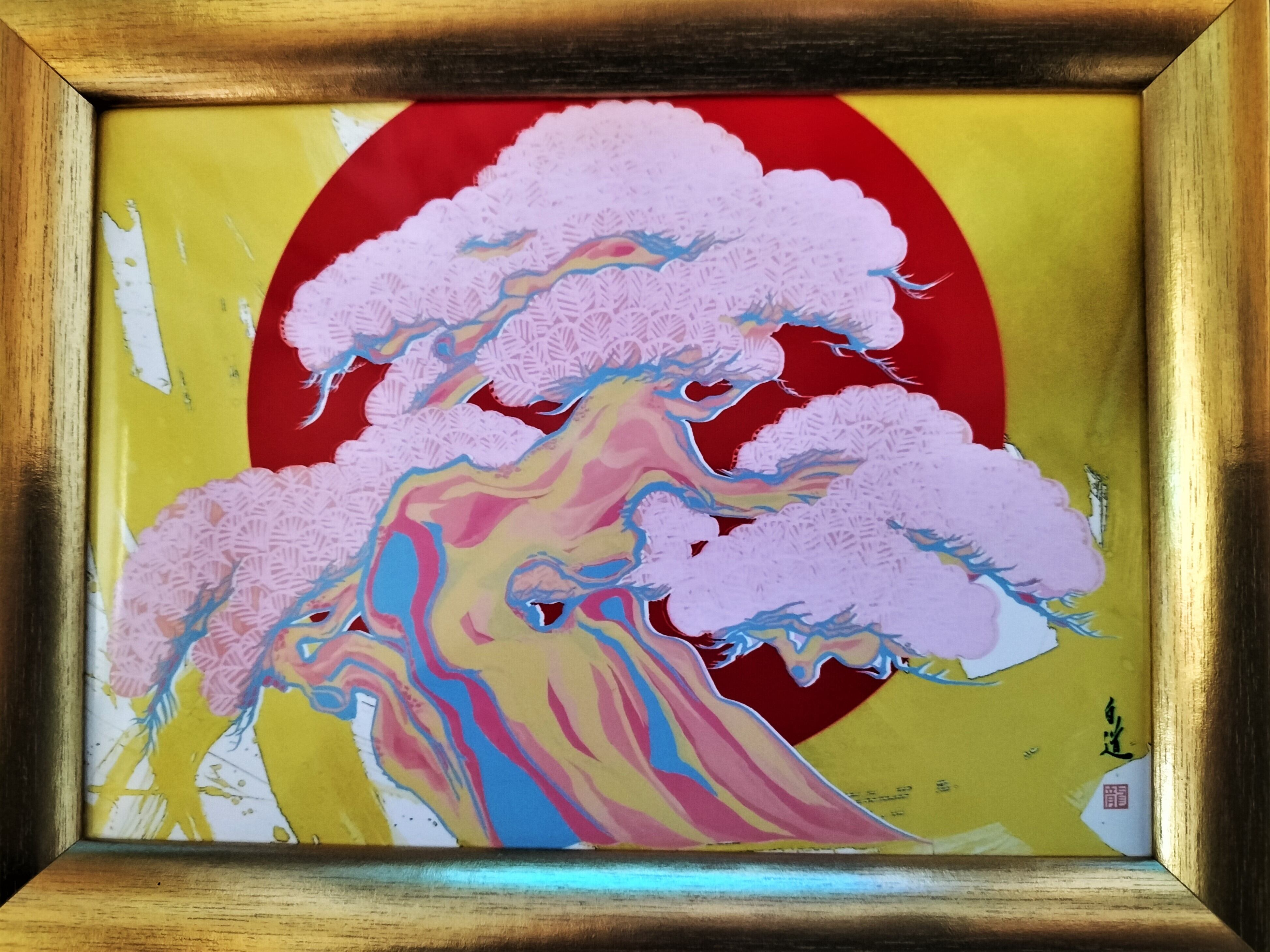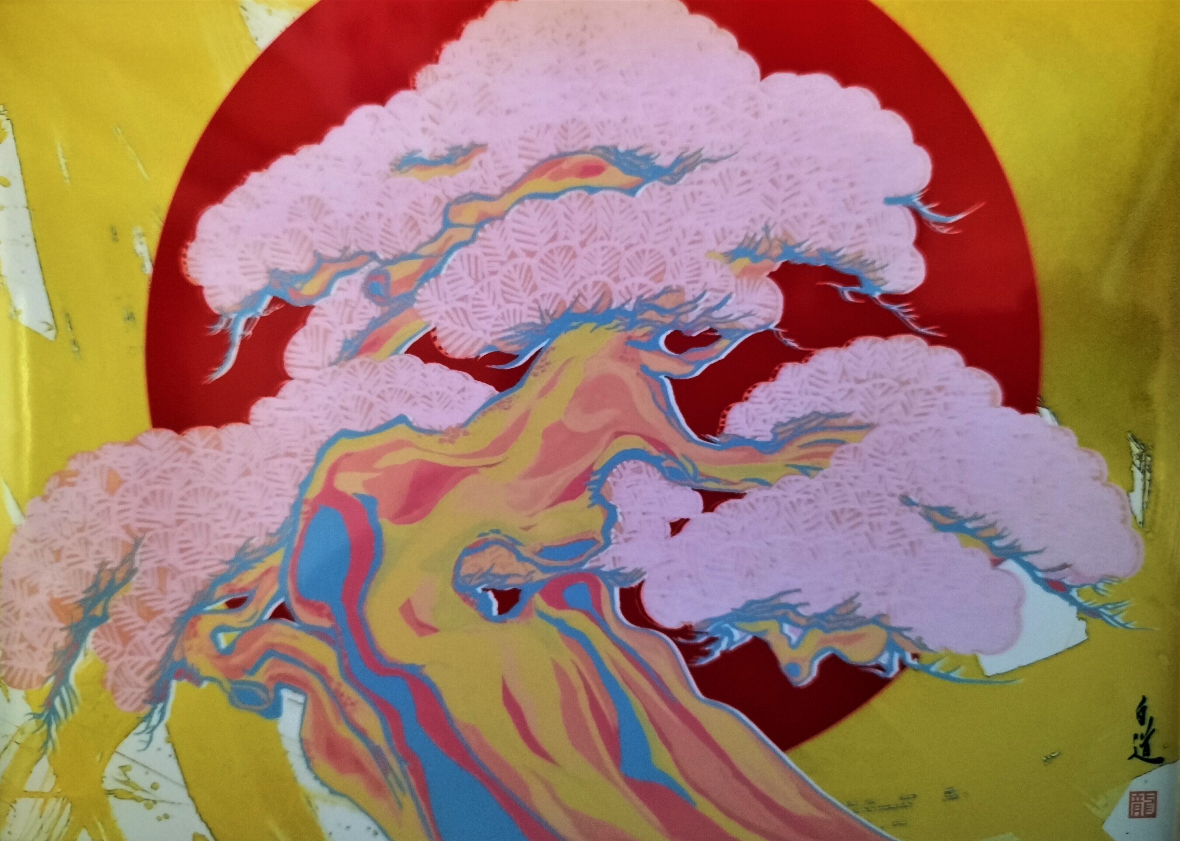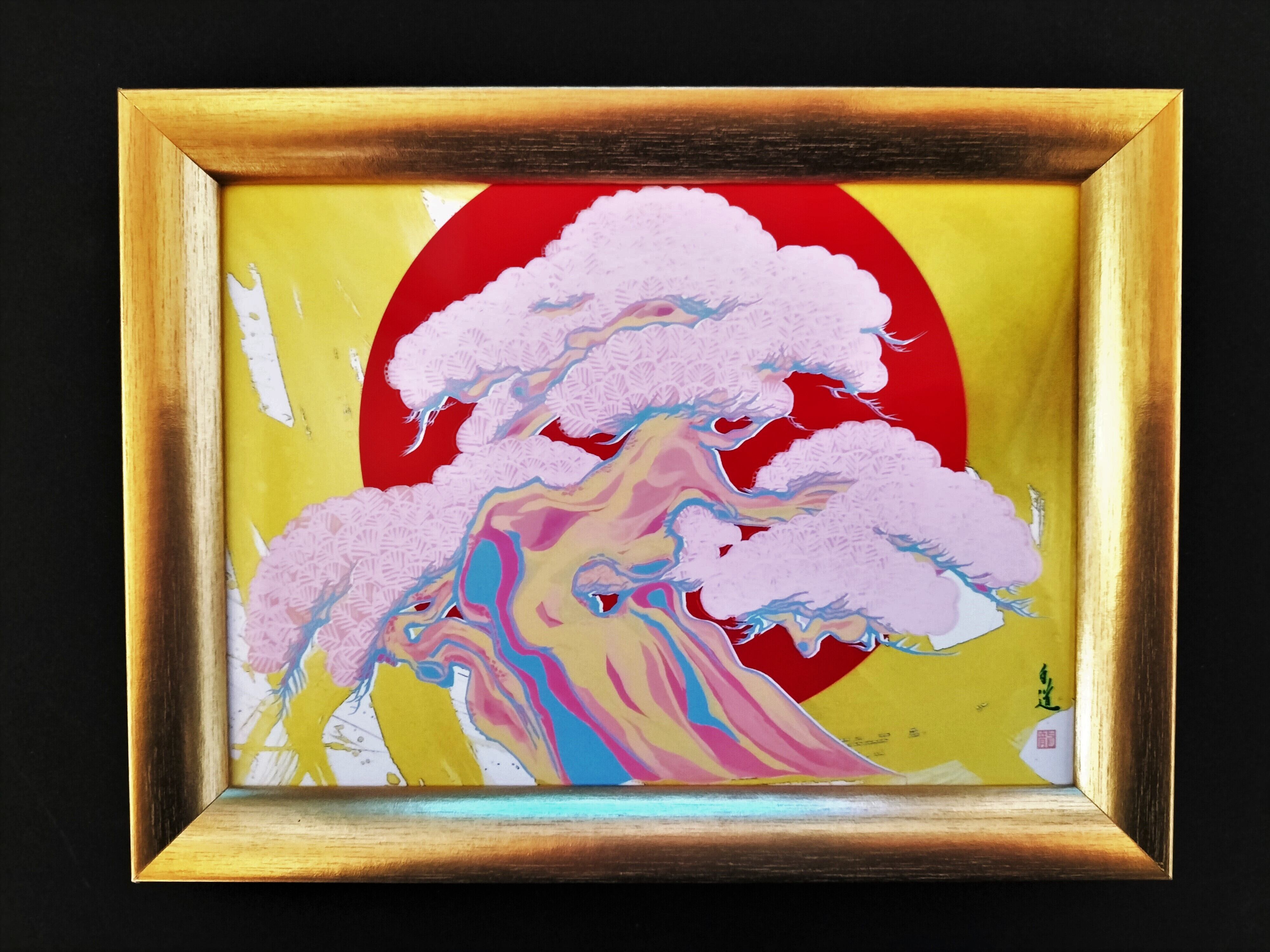 現代芸術家・絵師白道の作品は、世界中で愛されています。この作品も、独特の絵柄と、季節感あふれる松のモチーフが融合した独創的な一枚です。