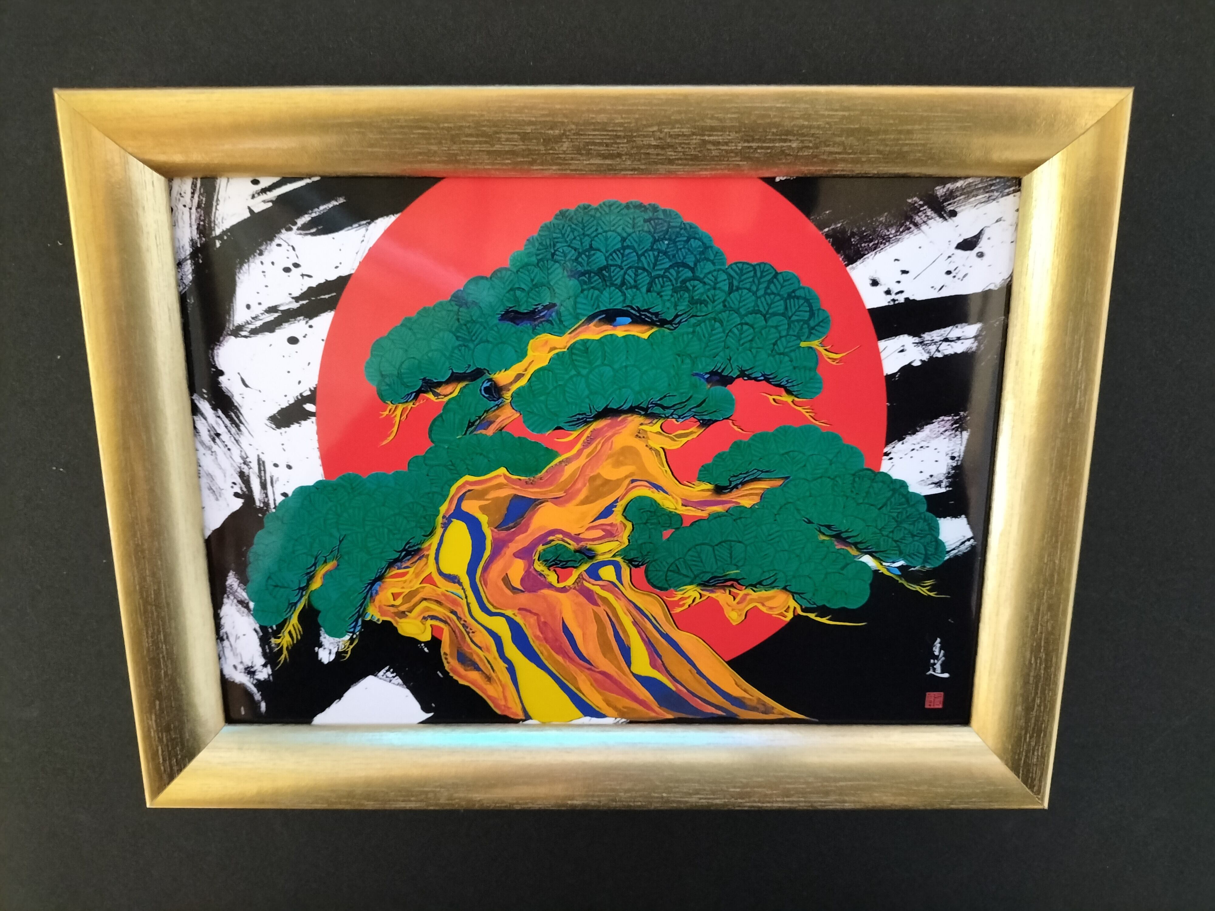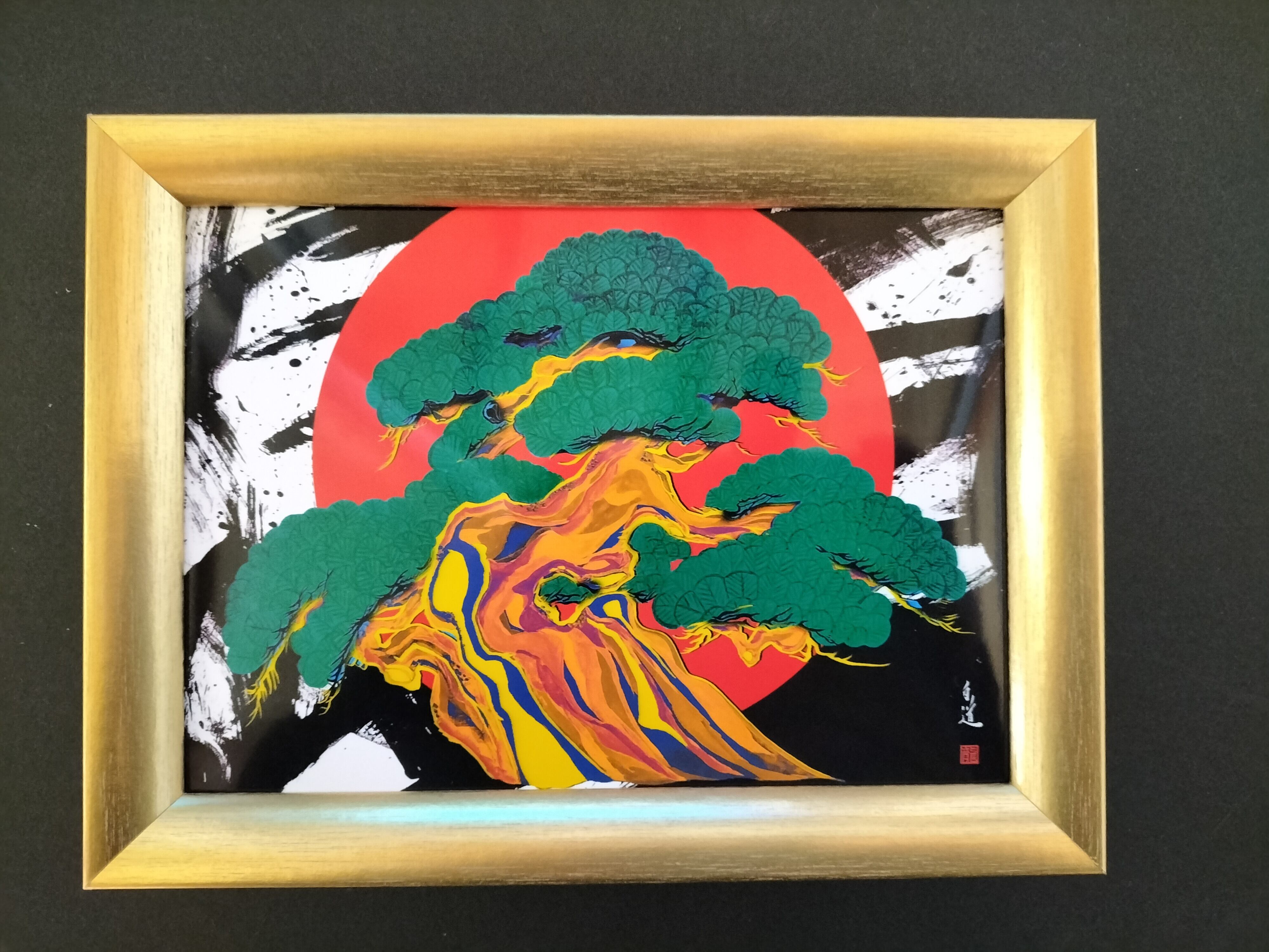 現代芸術家・絵師白道の作品は、世界中で愛されています。この作品も、独特の絵柄と、季節感あふれる松のモチーフが融合した独創的な一枚です。