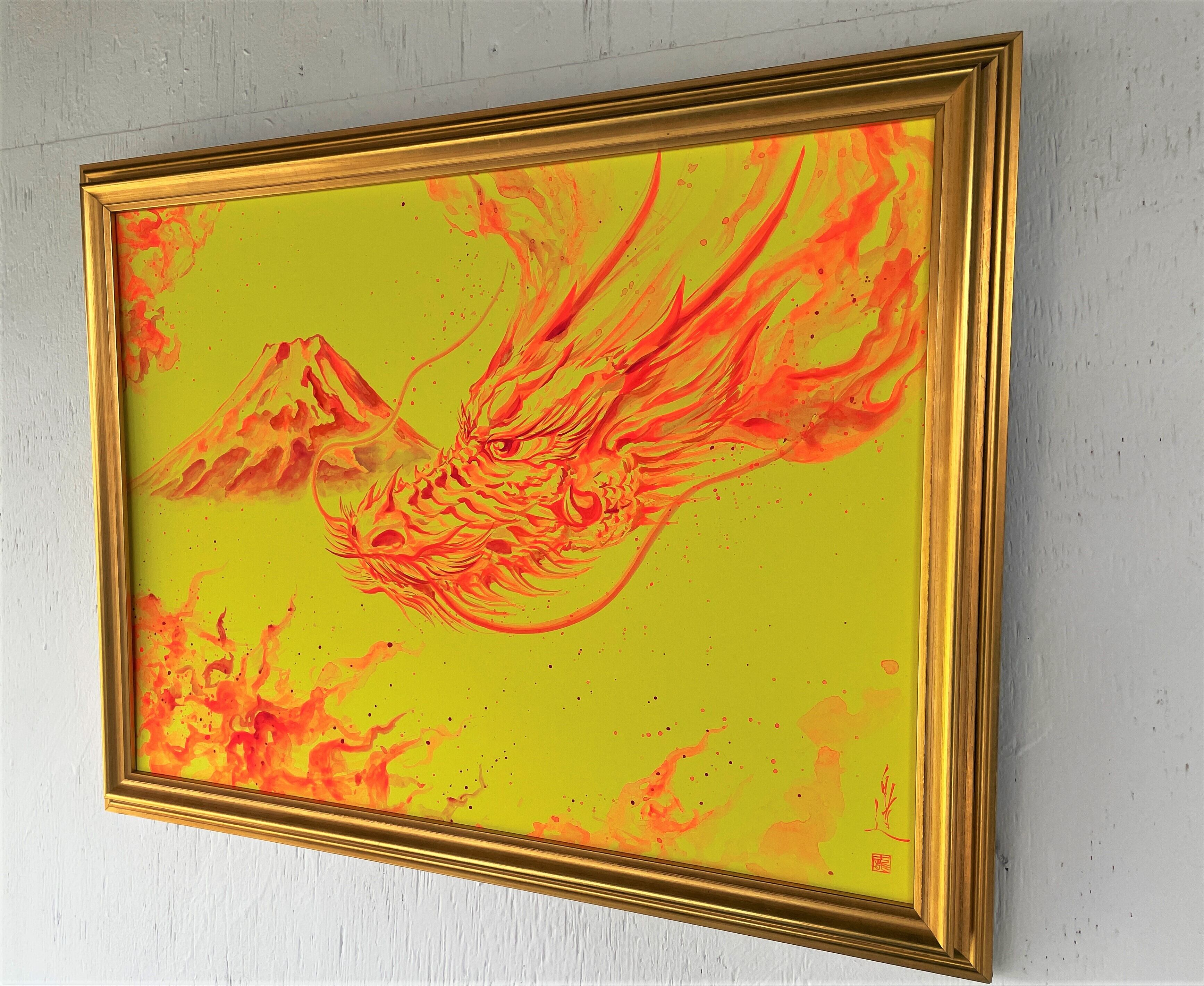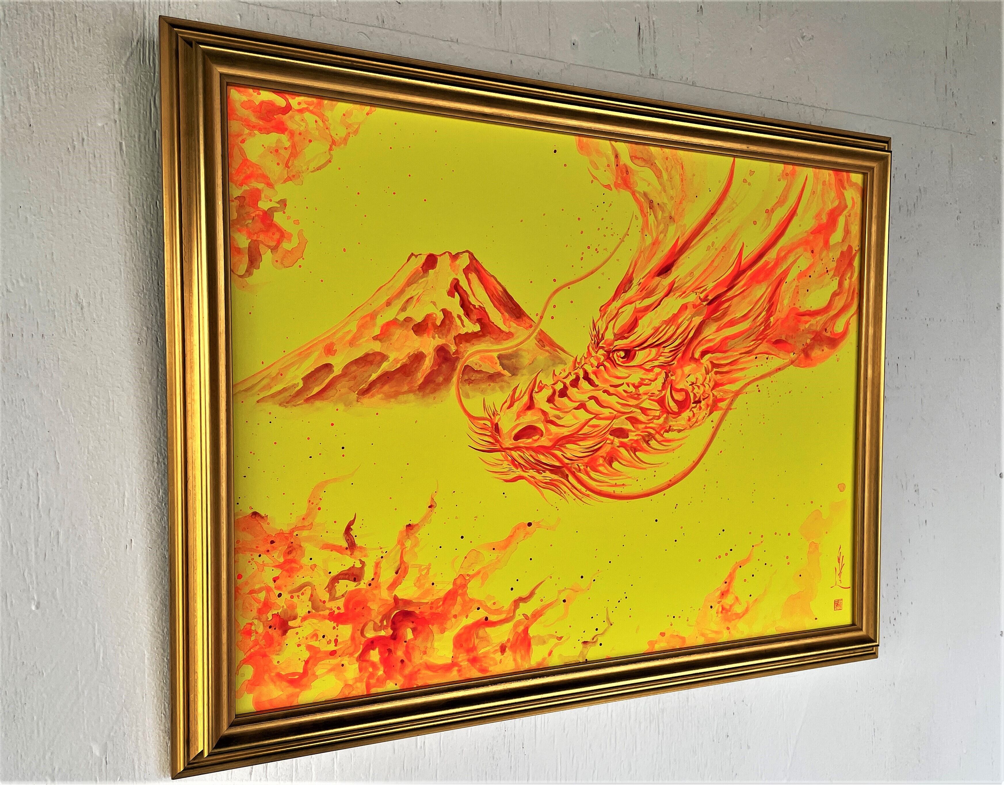 現代水墨画家☆絵師白道 「Yellow Dragon 幸福の黄龍」(赤富士)(直筆作品) サイン 箱あり 高級額装 /Hakudouroom. ART Hakudou 龍 風水 絵 絵画