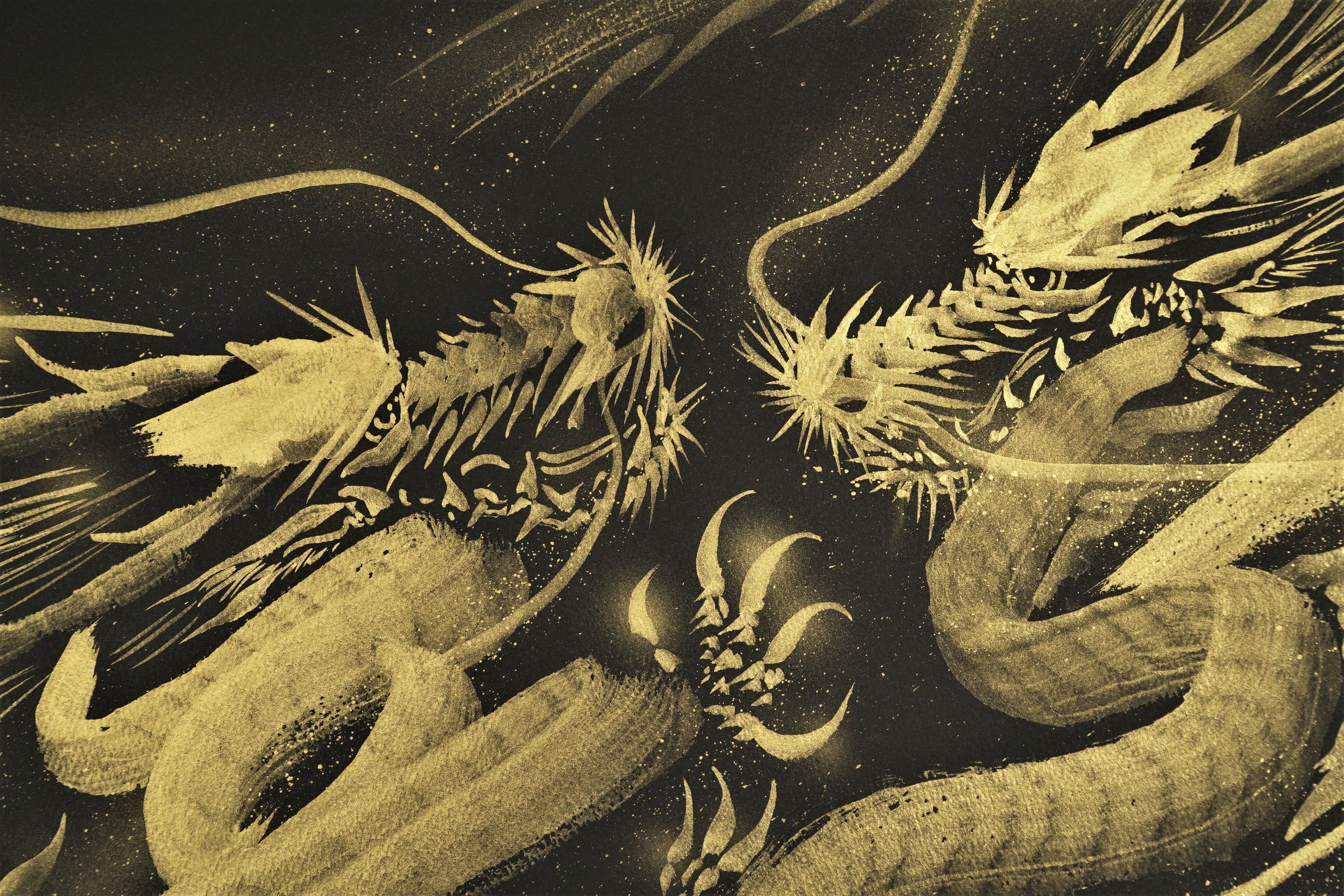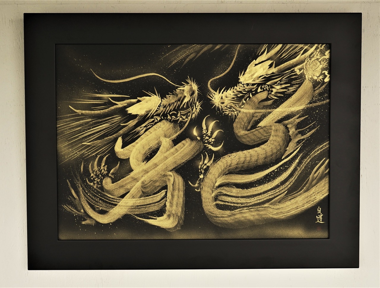 現代水墨画家☆絵師白道 「一筆金双龍」(直筆作品) 直筆サインあり 箱あり 高級額装 /Hakudouroom. ART Hakudou 絵 絵画 送料無料♪