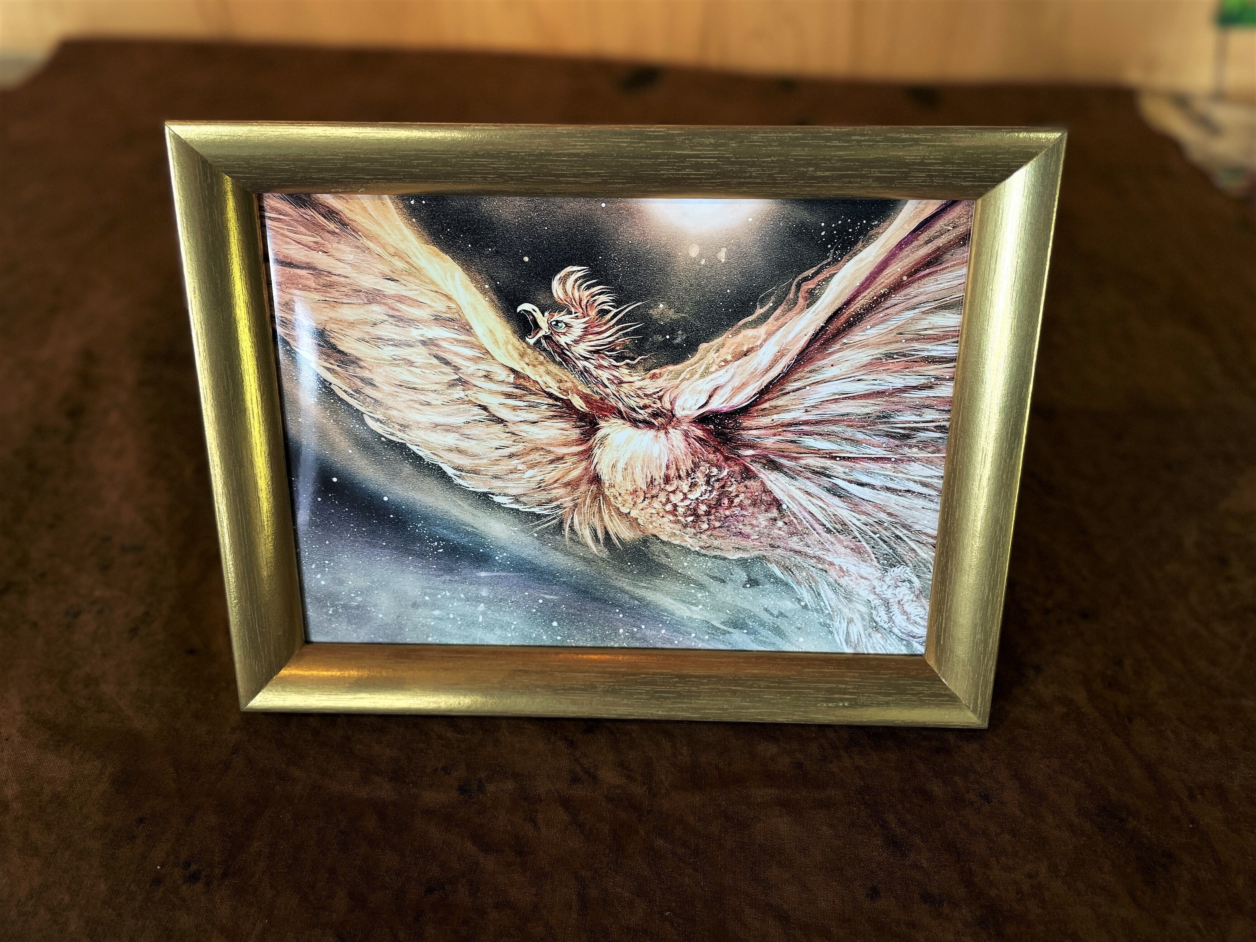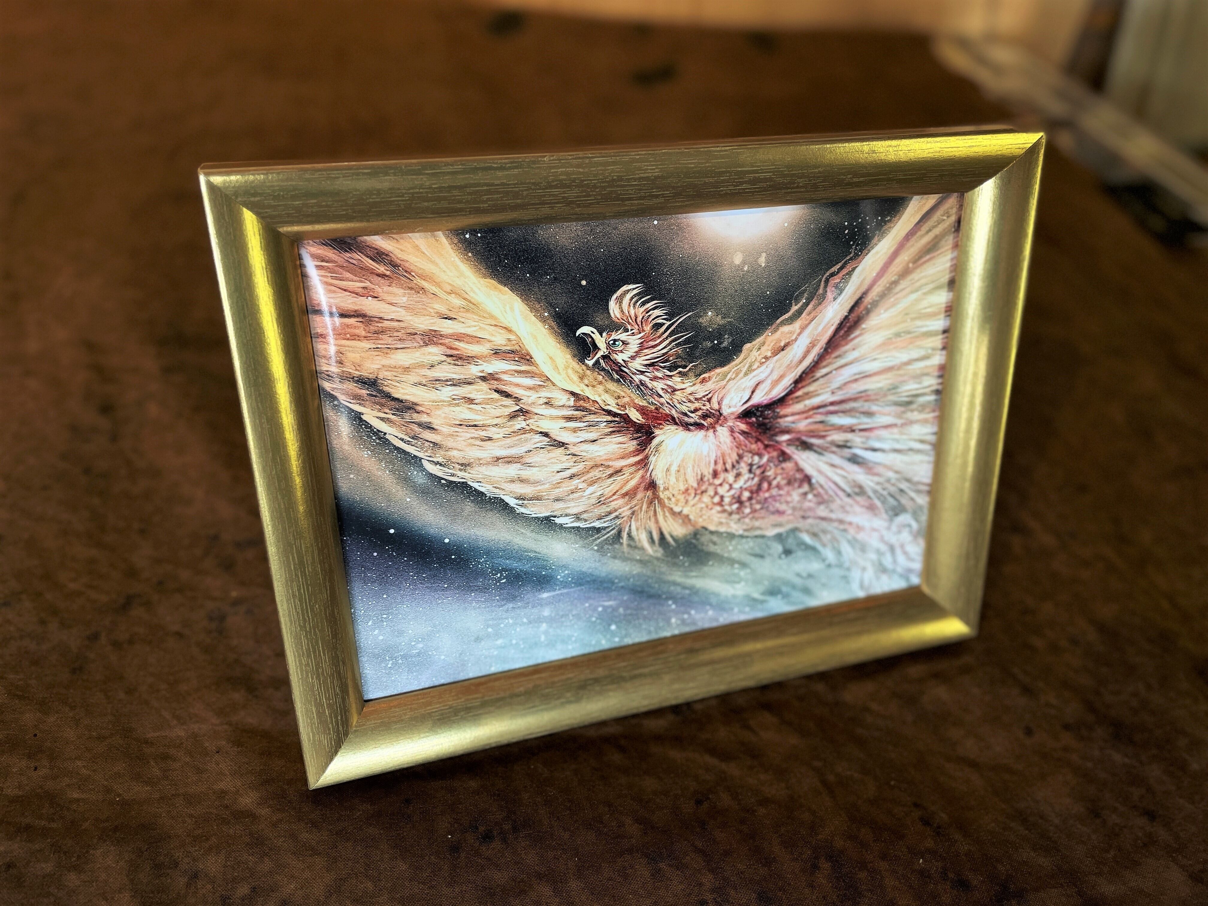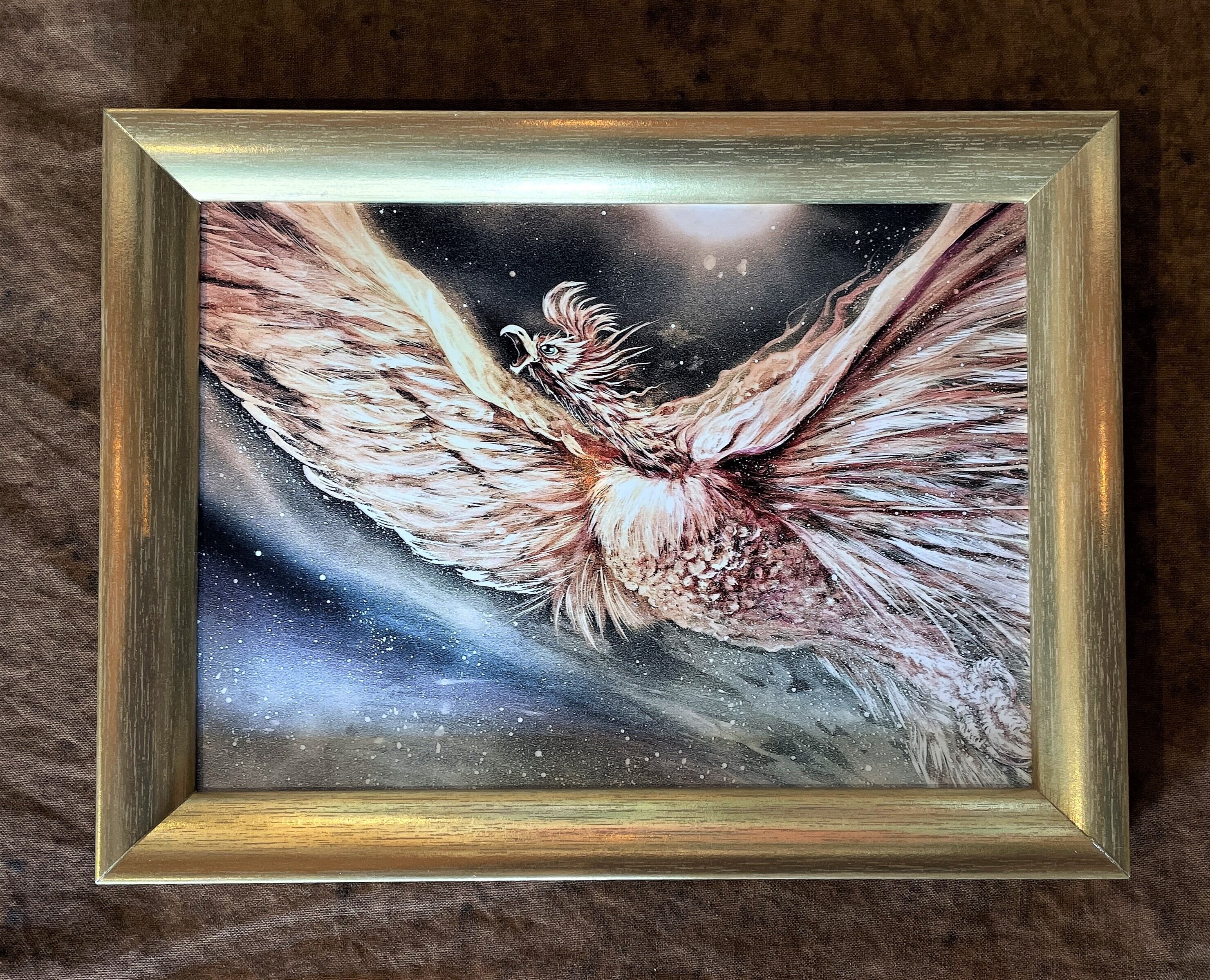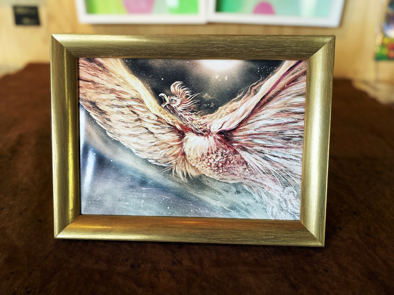 大きく翼を広げ虹色のオーラを放ちながら羽ばたいていく夏の守護神、朱雀を描きました。