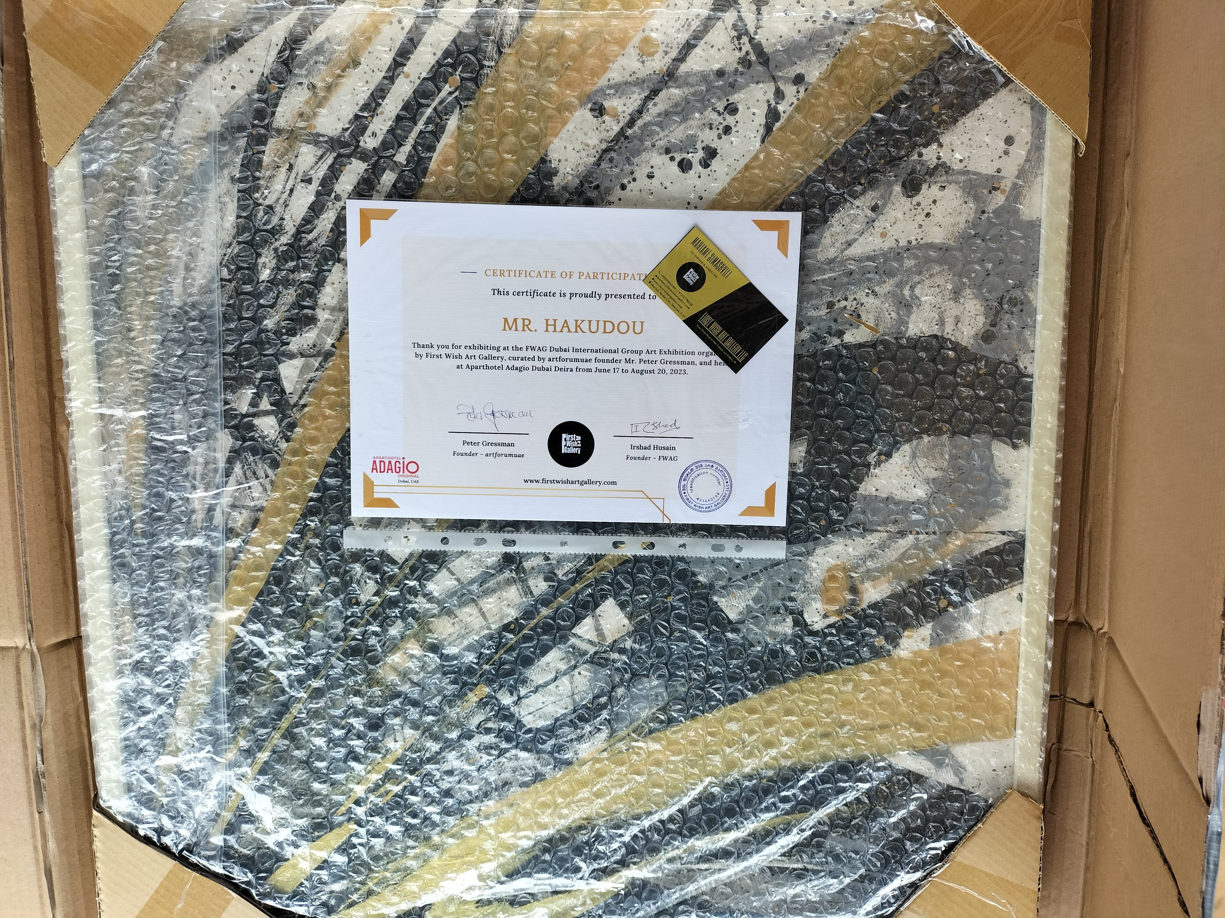 ドバイのギャラリー( FIRST EISH ART GALLERY)の証明書、名刺もお付けします。