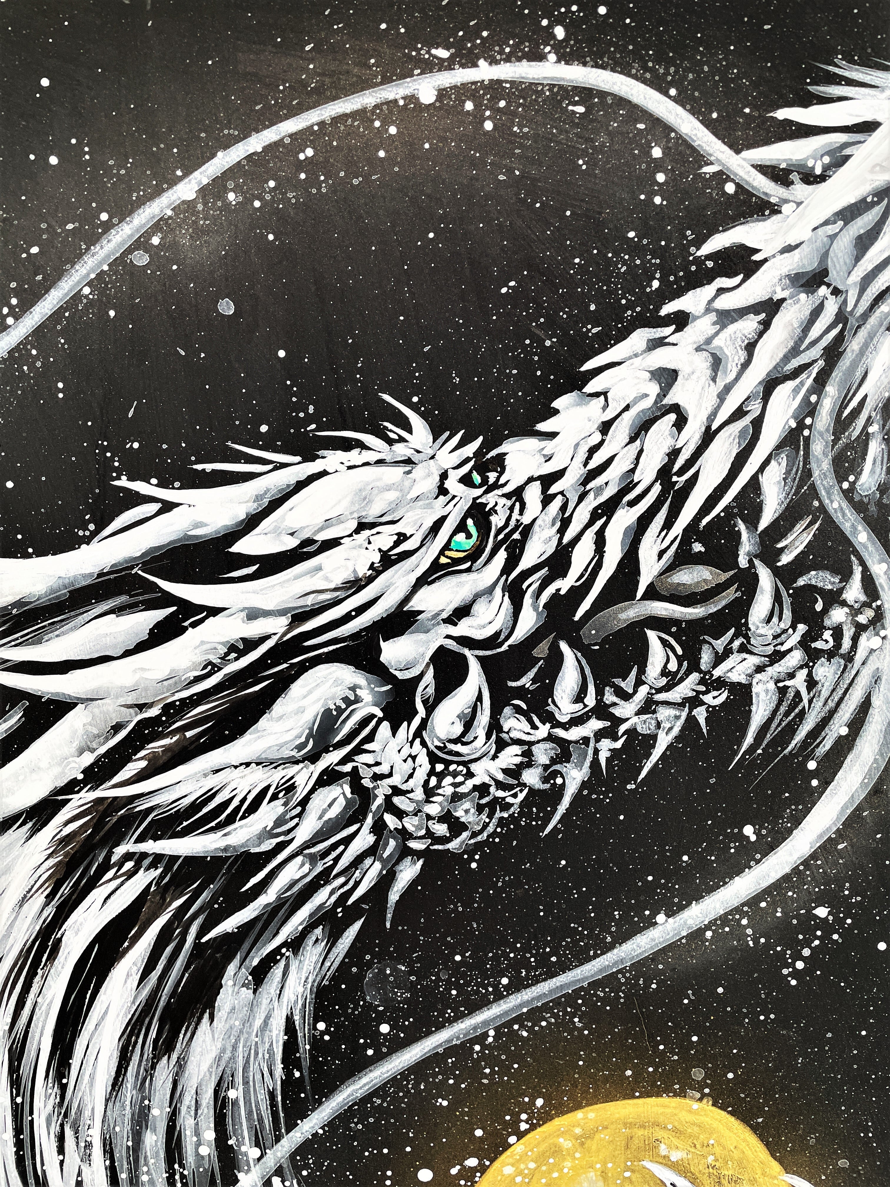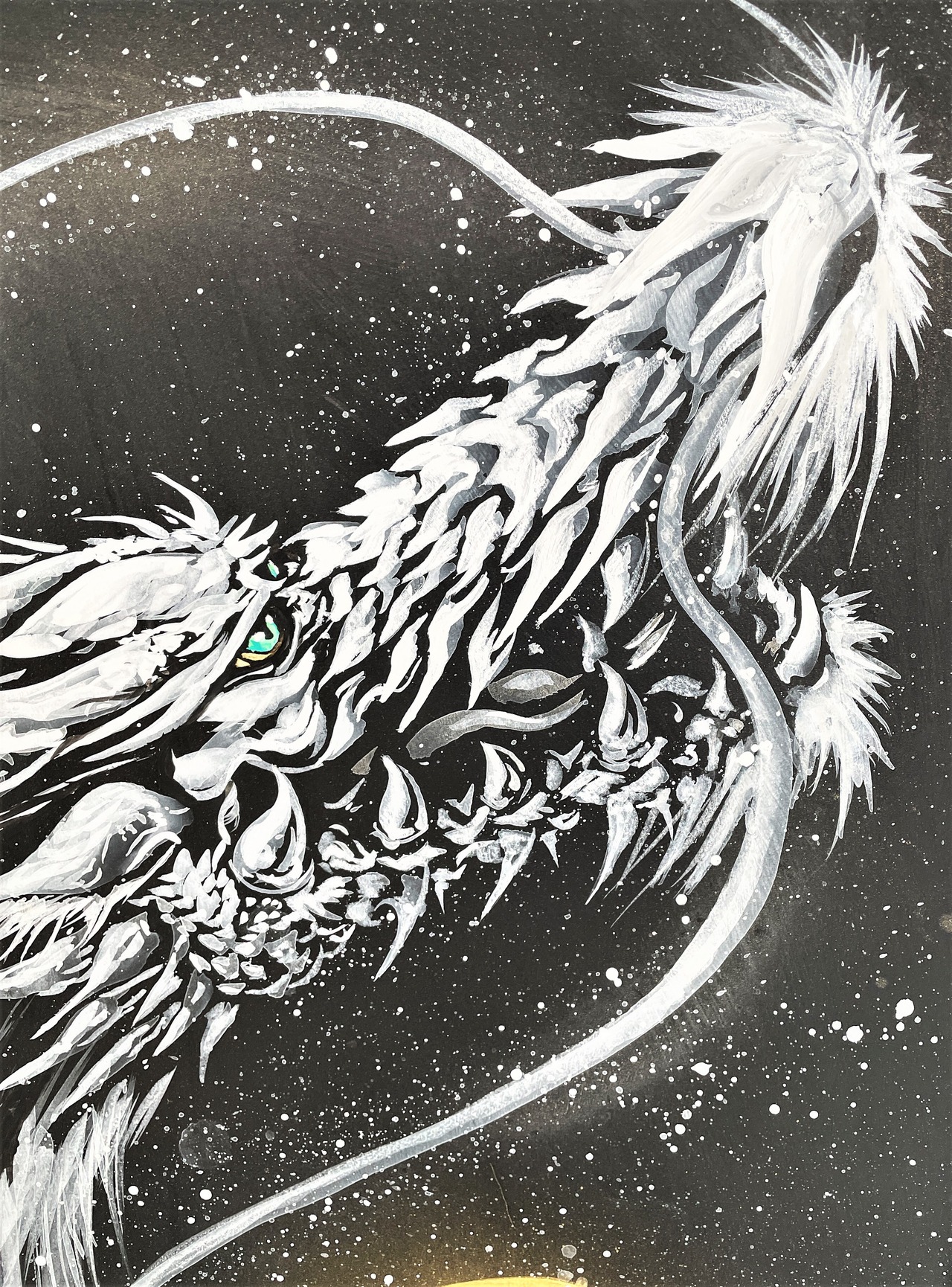 天に勢いよく昇っていく白龍のアップを大胆に描きました。