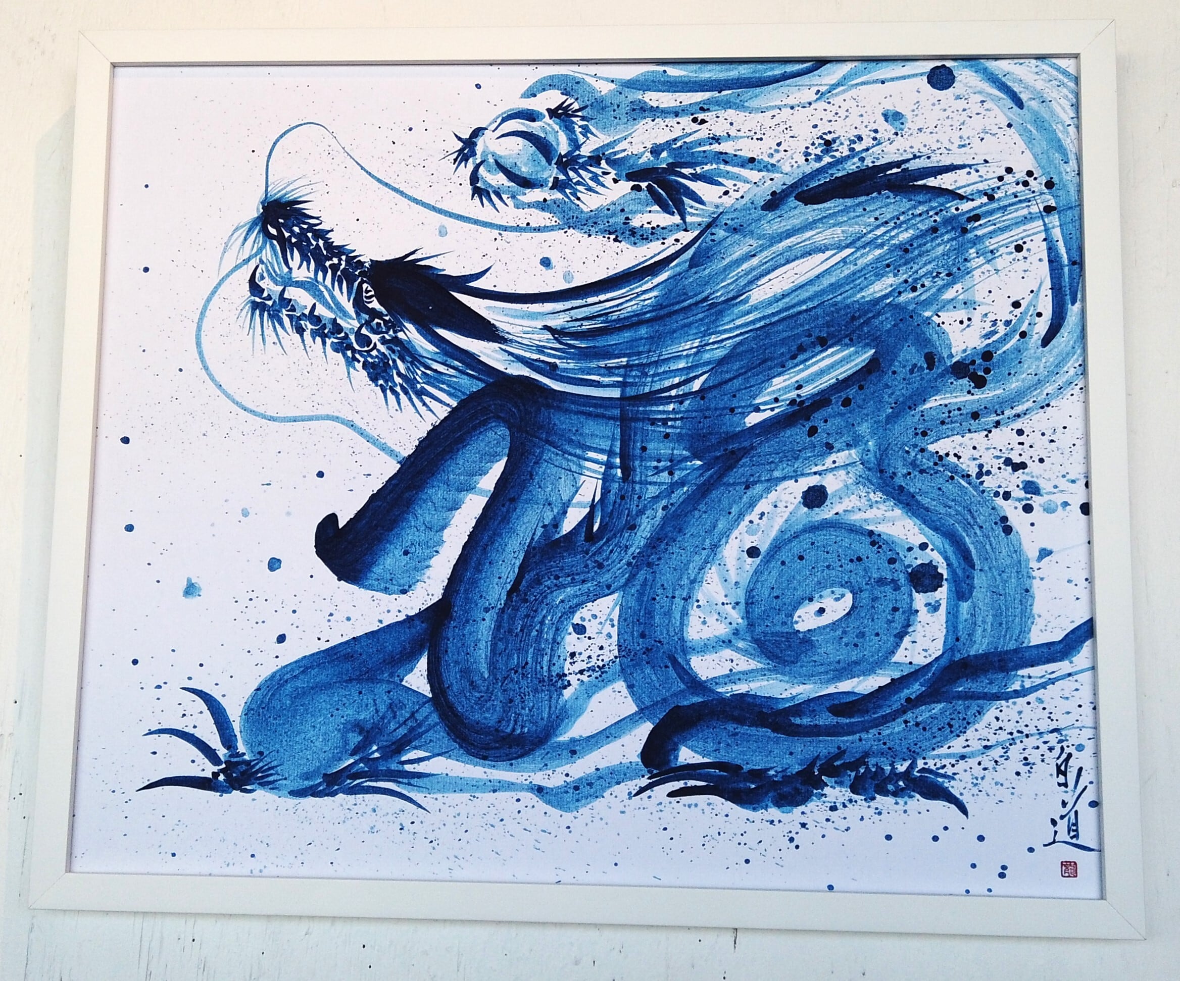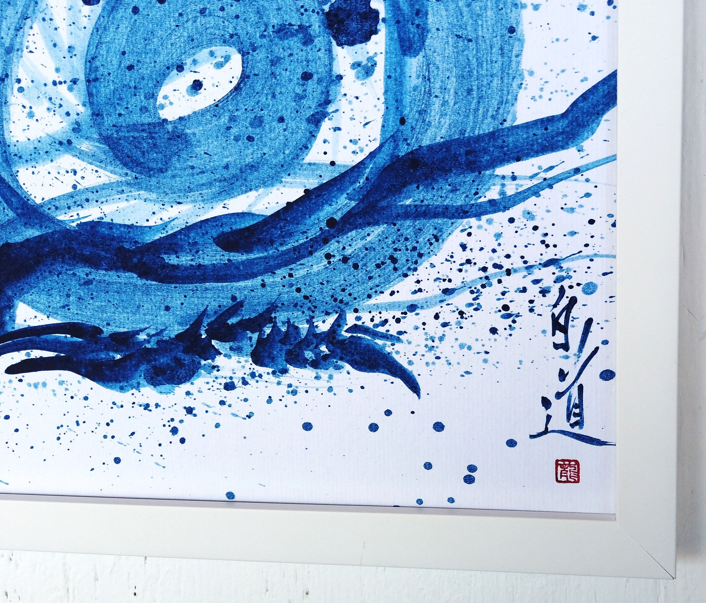 現代水墨画家 絵師白道 「蒼き一筆福龍」 (青ボンド墨) 直筆作品 証明書カード付 龍 絵 絵画 現代アート