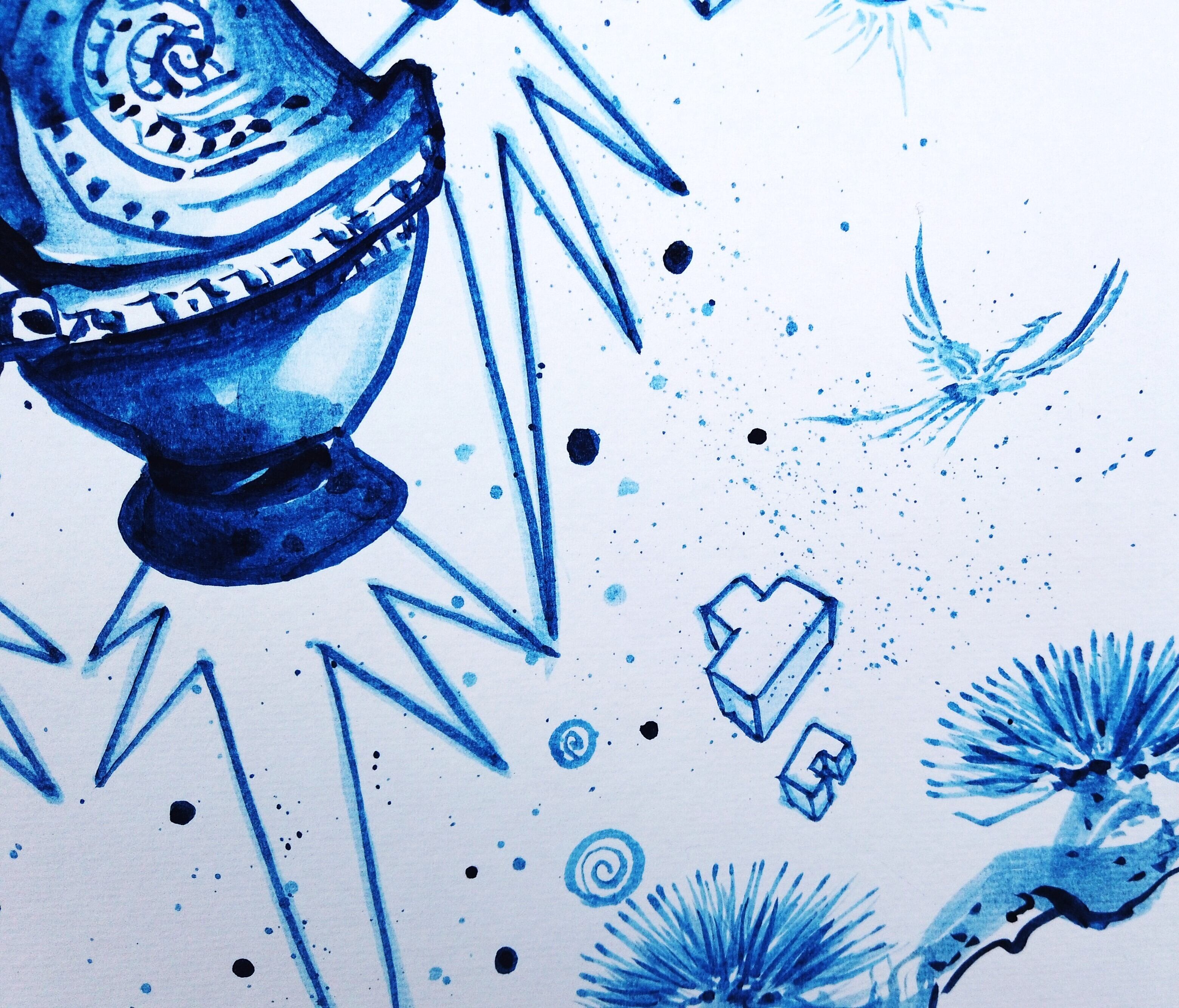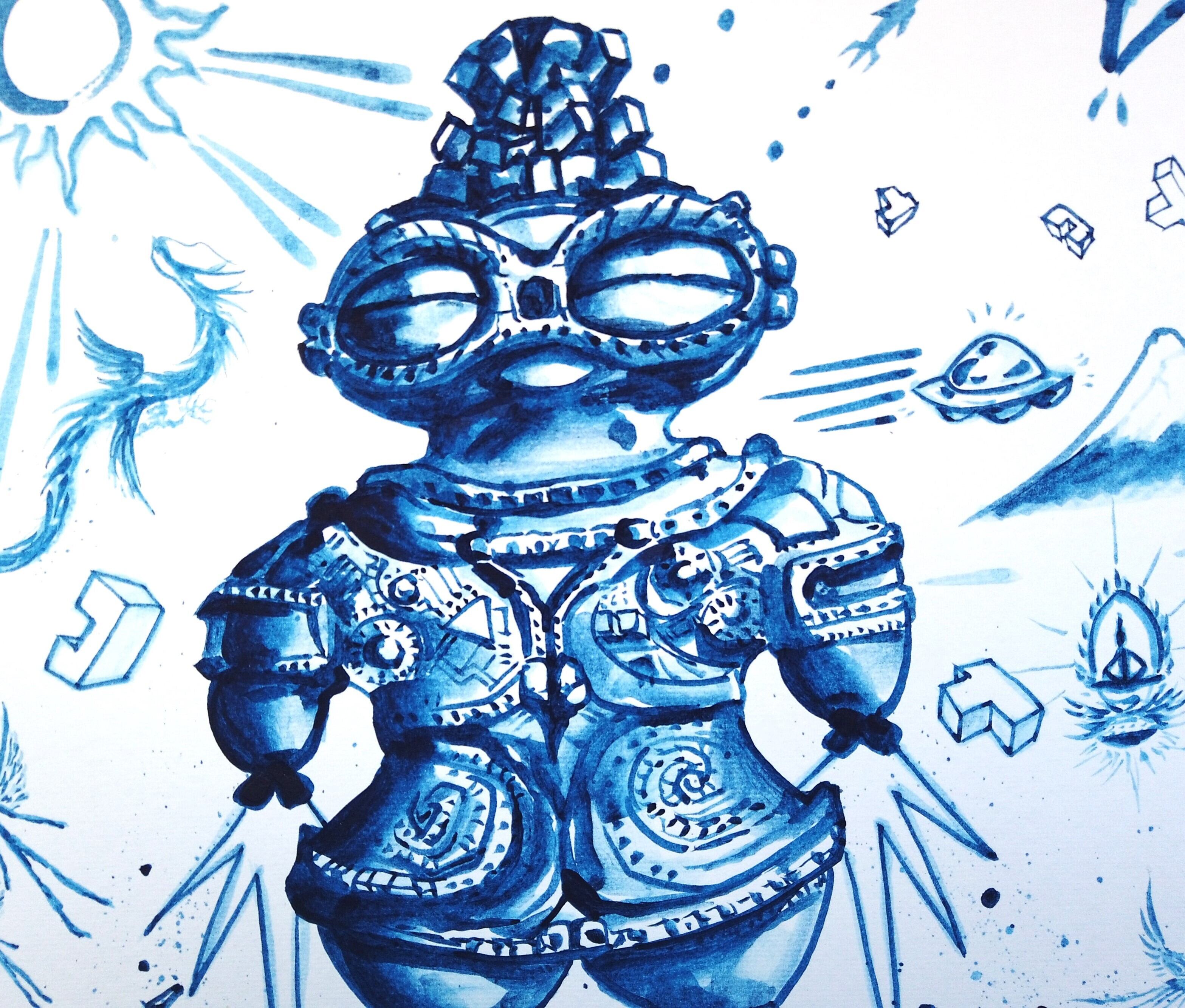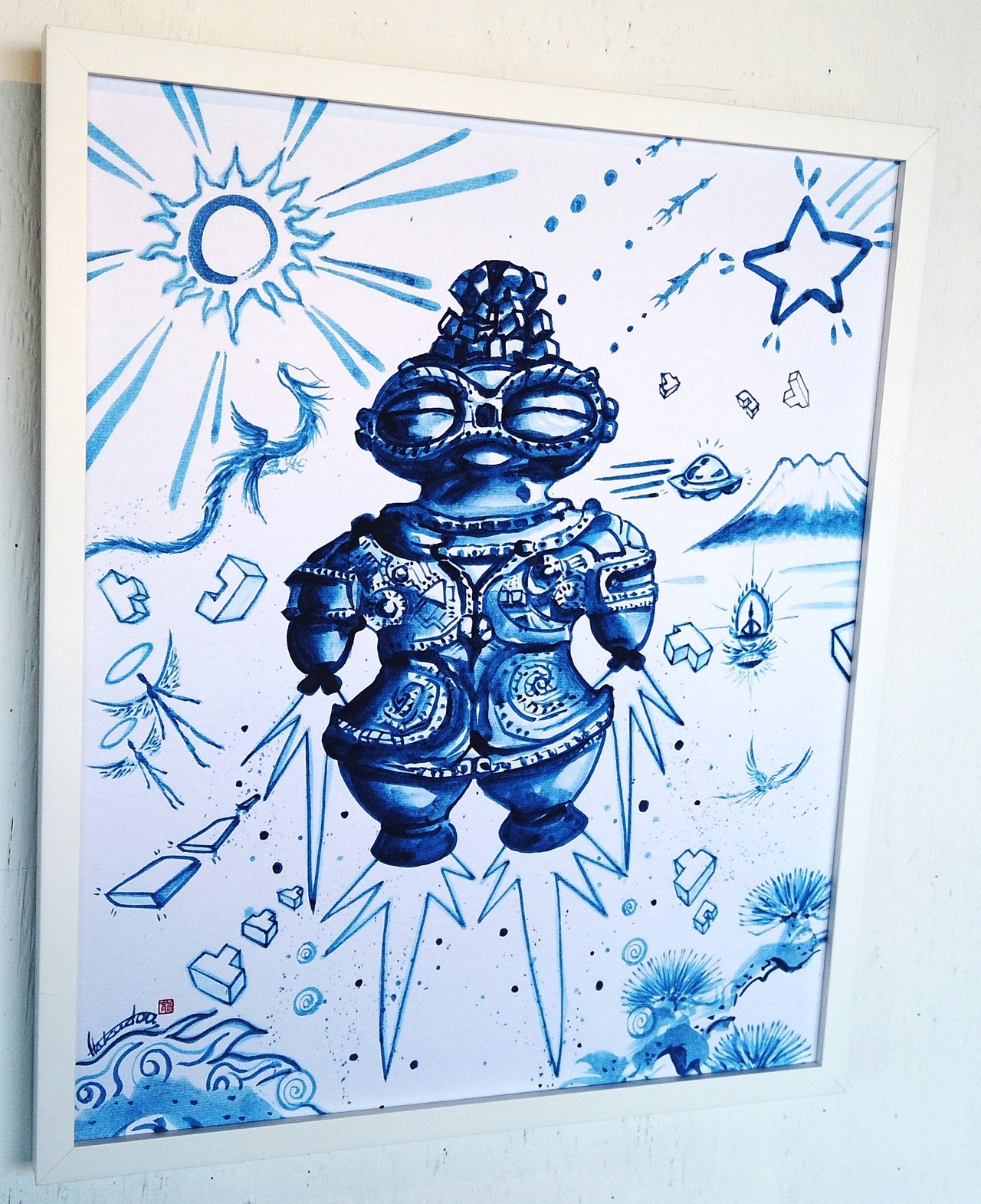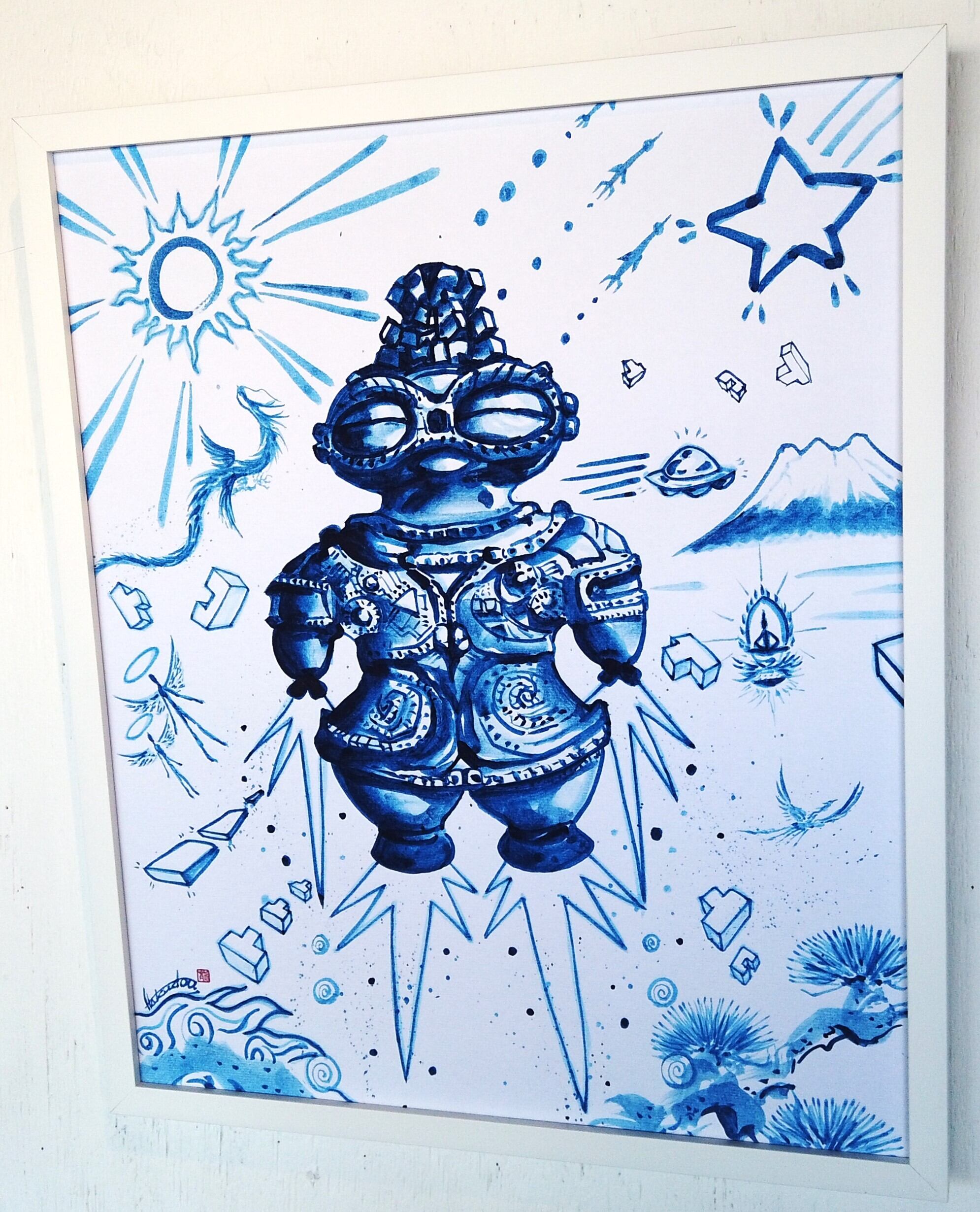 現代水墨画家 絵師白道 「Super Sonic Jet boy world」 (青ボンド墨) 直筆作品 証明書カード付 龍 土偶 鳳凰 絵 絵画 現代アート