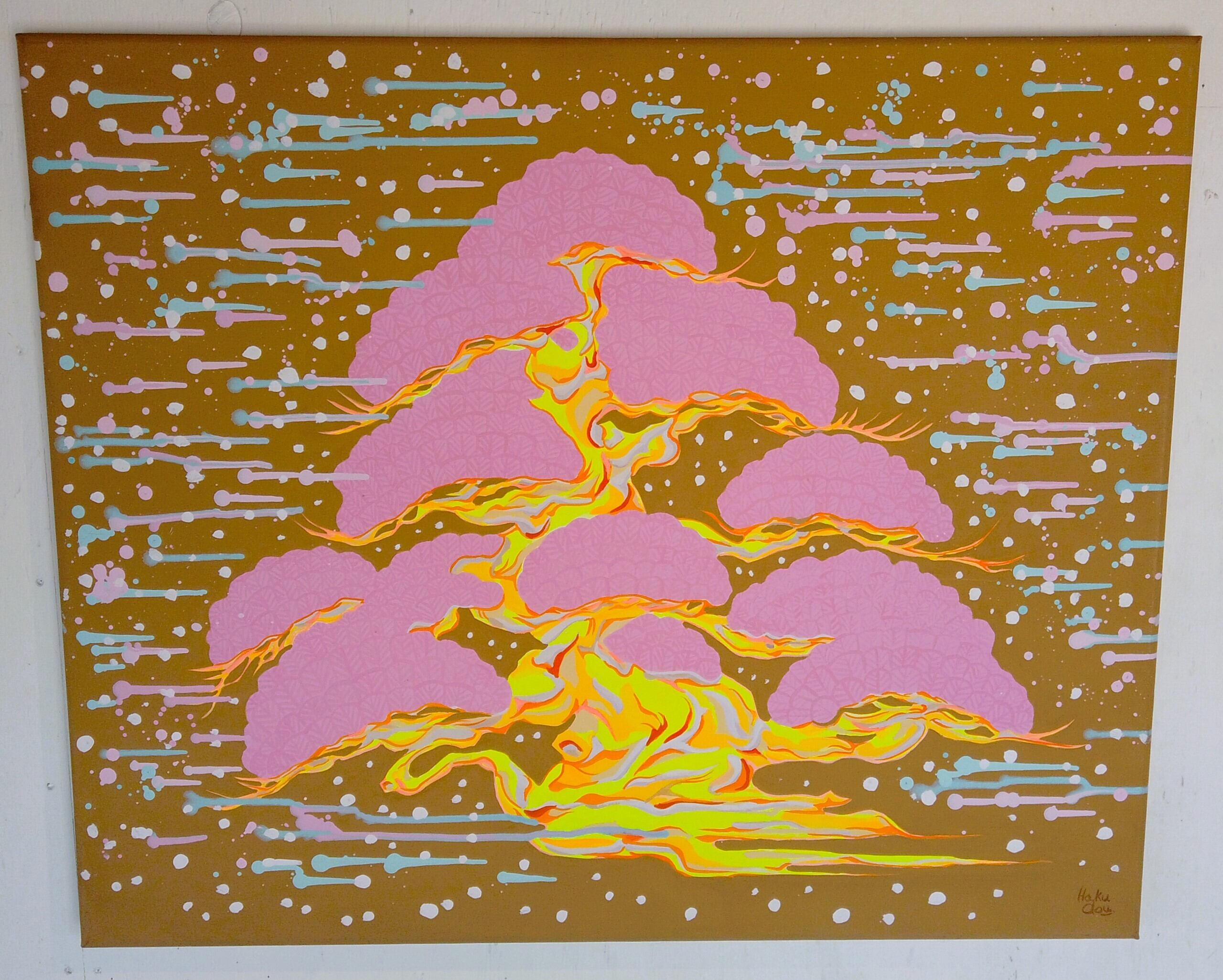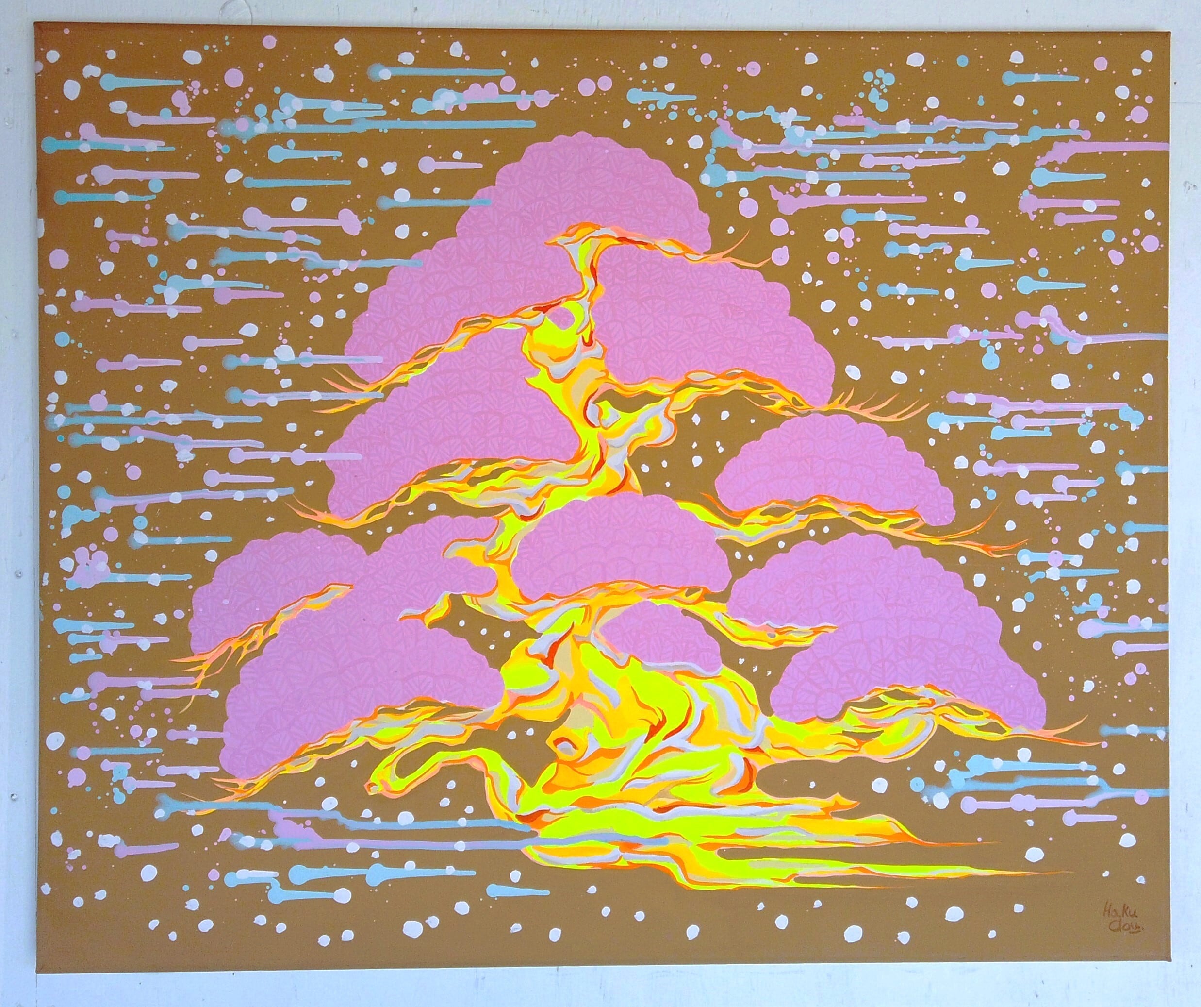 現代水墨画家 絵師白道 「Flying Bonsai (Pink)」直筆作品 証明書カード付 松 盆栽 絵 絵画 現代アート