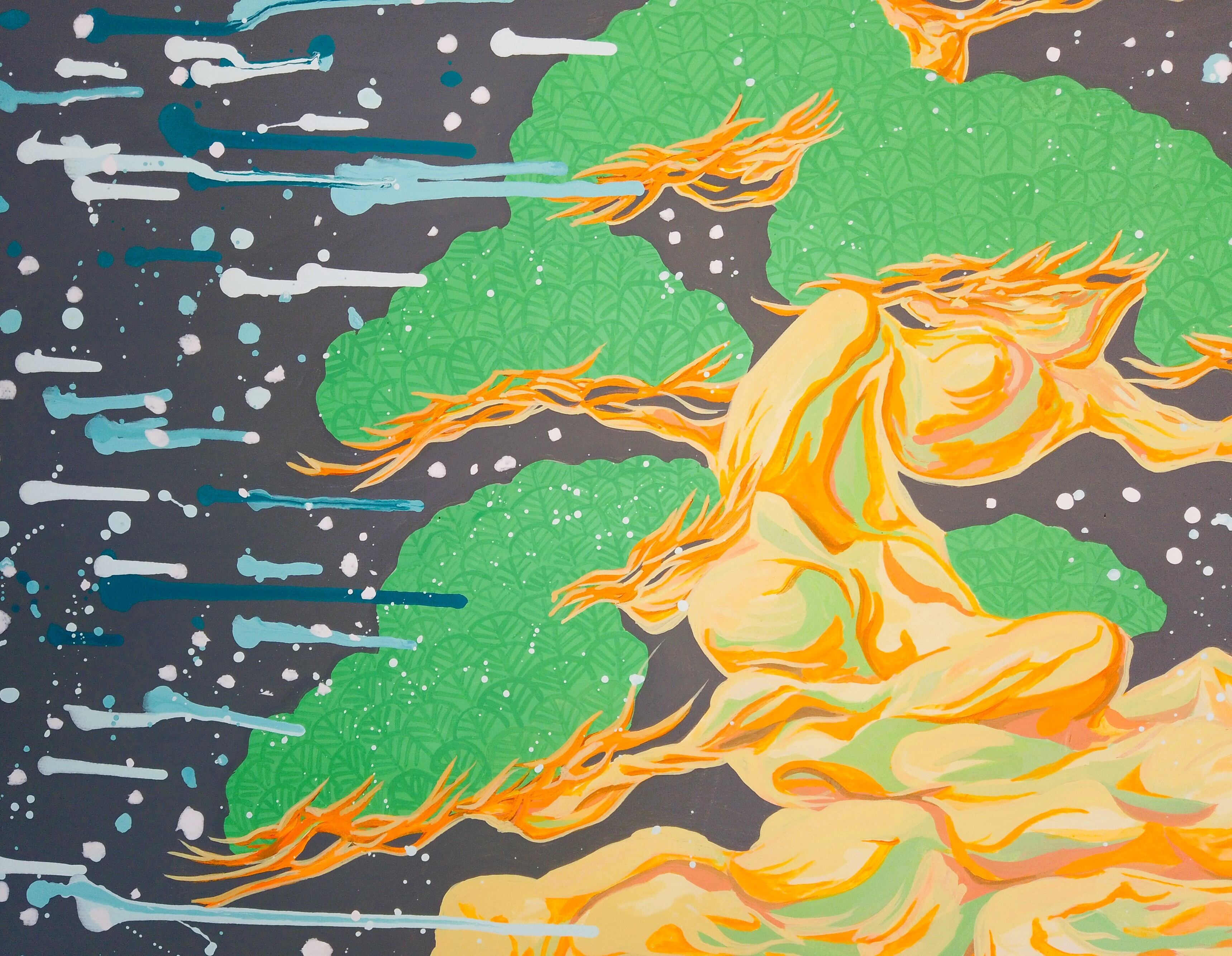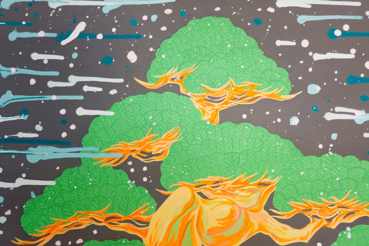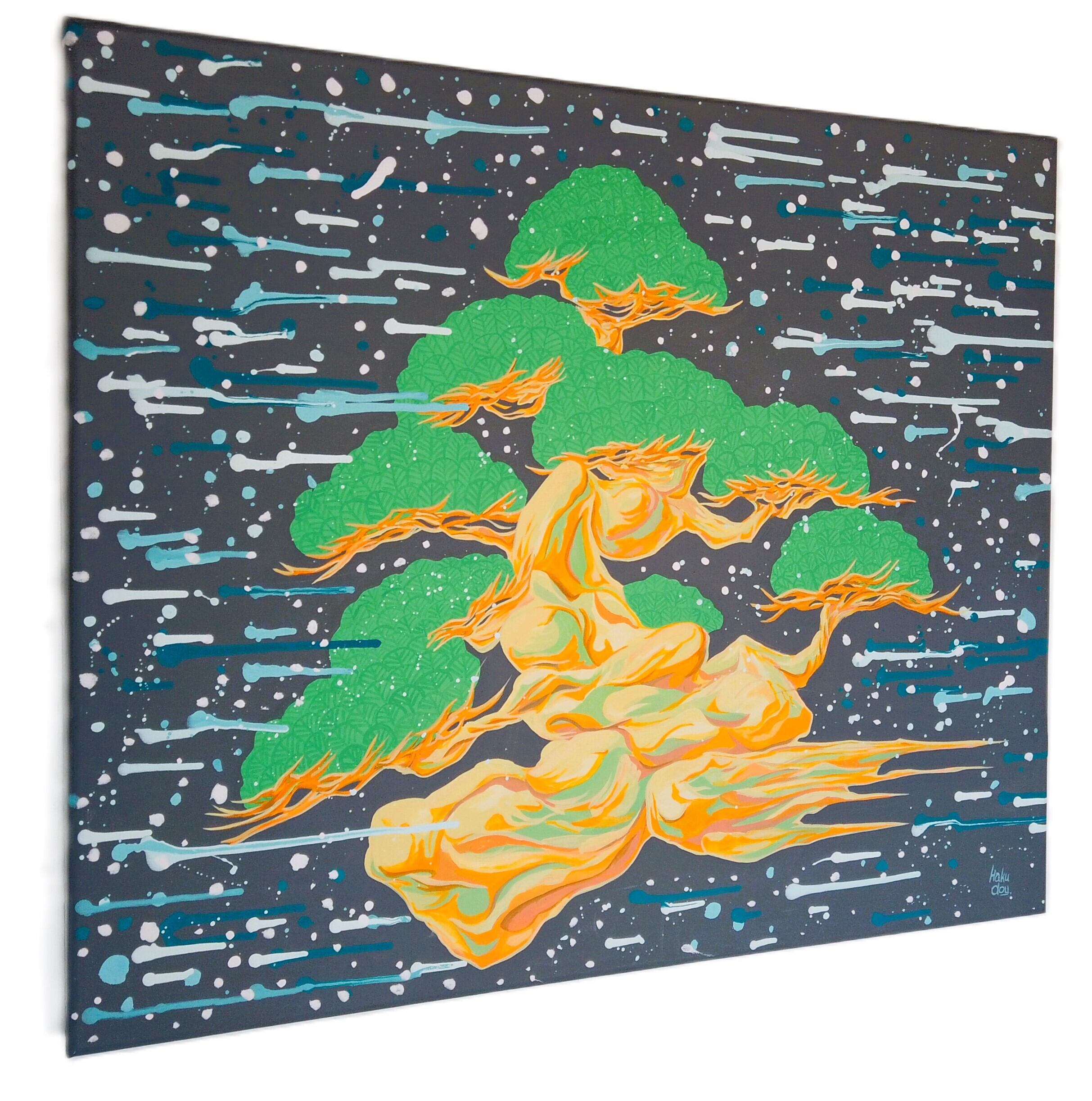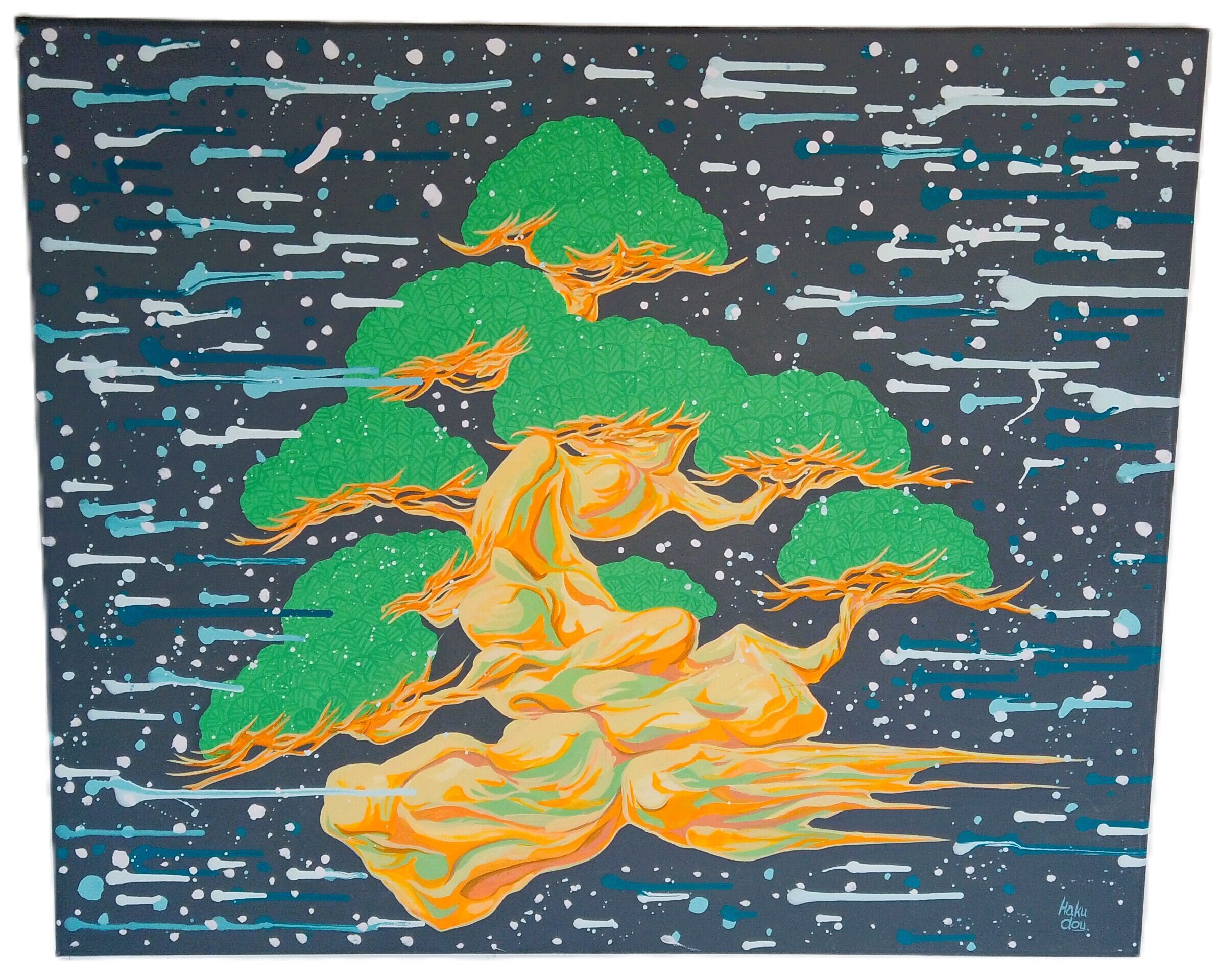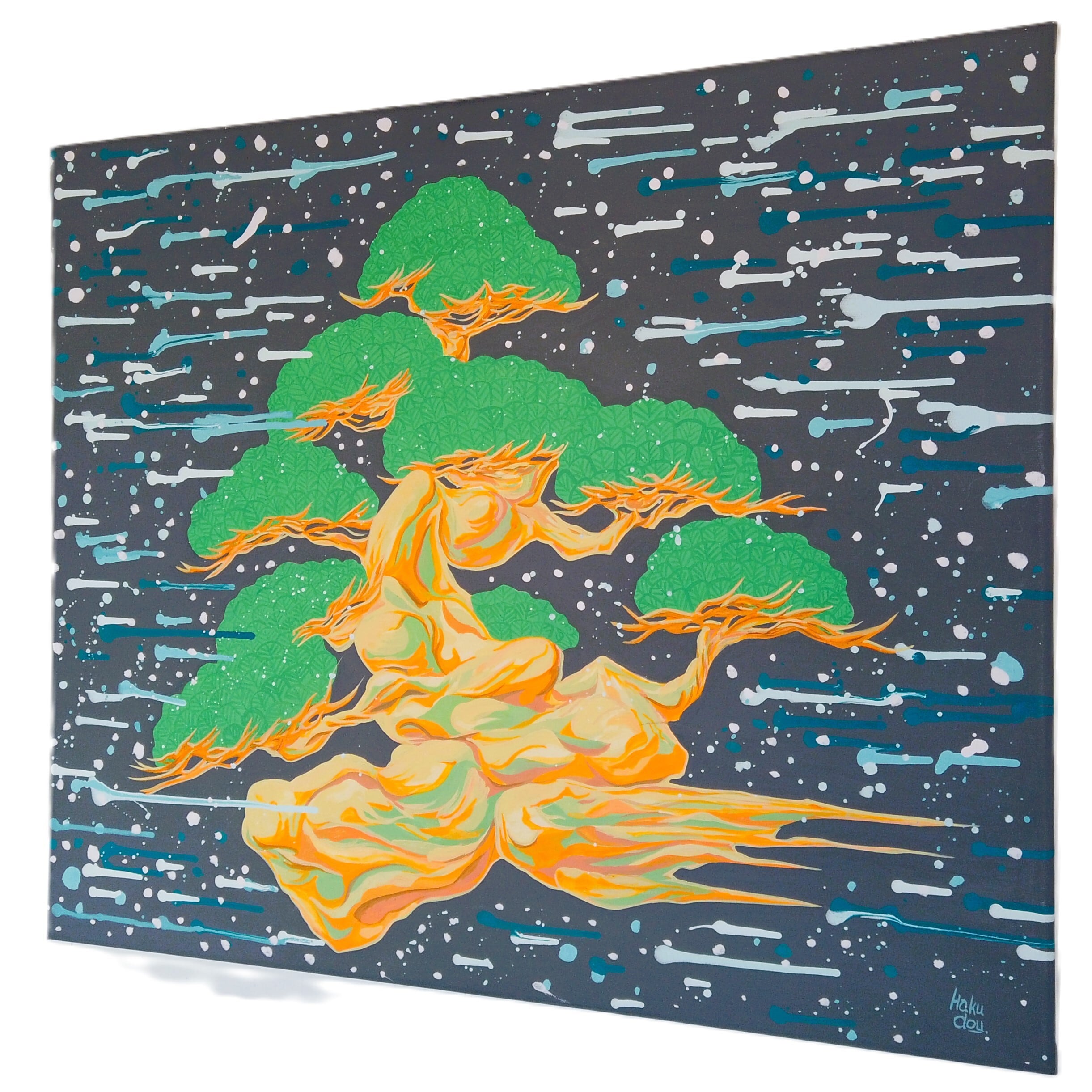 現代水墨画家 絵師白道 「Flying Bonsai (Green)」直筆作品 証明書カード付 松 盆栽 絵 絵画 現代アート