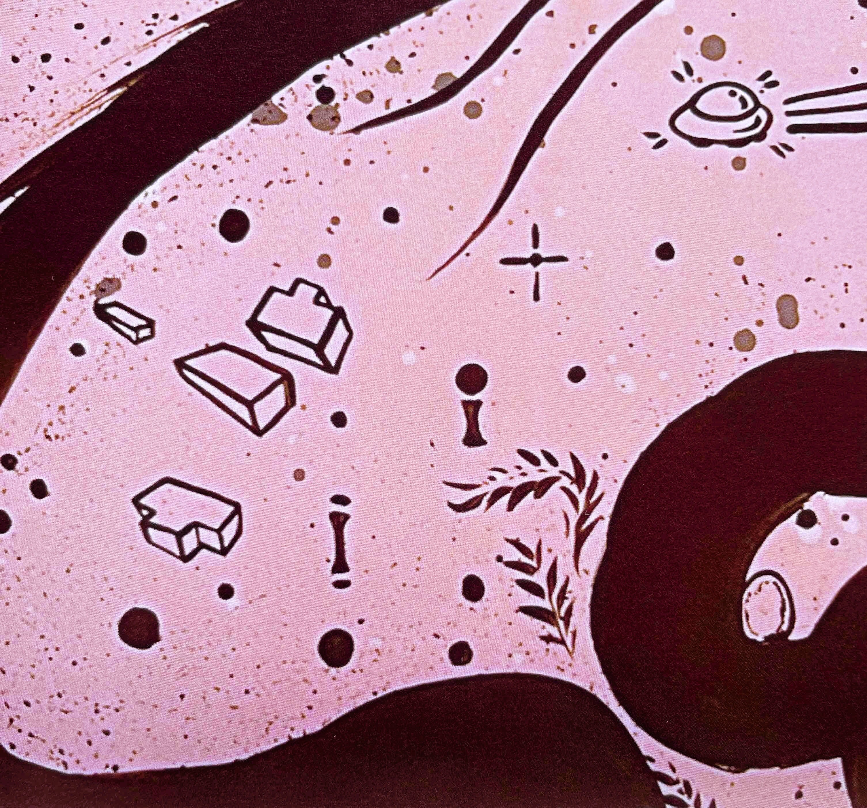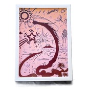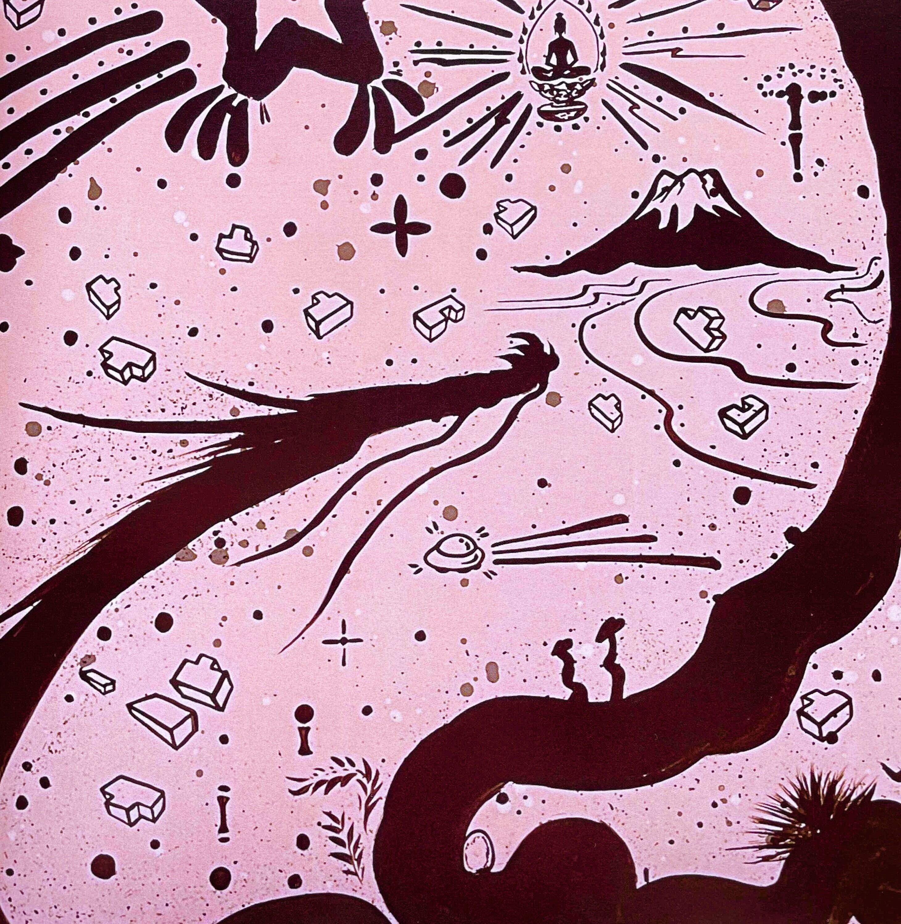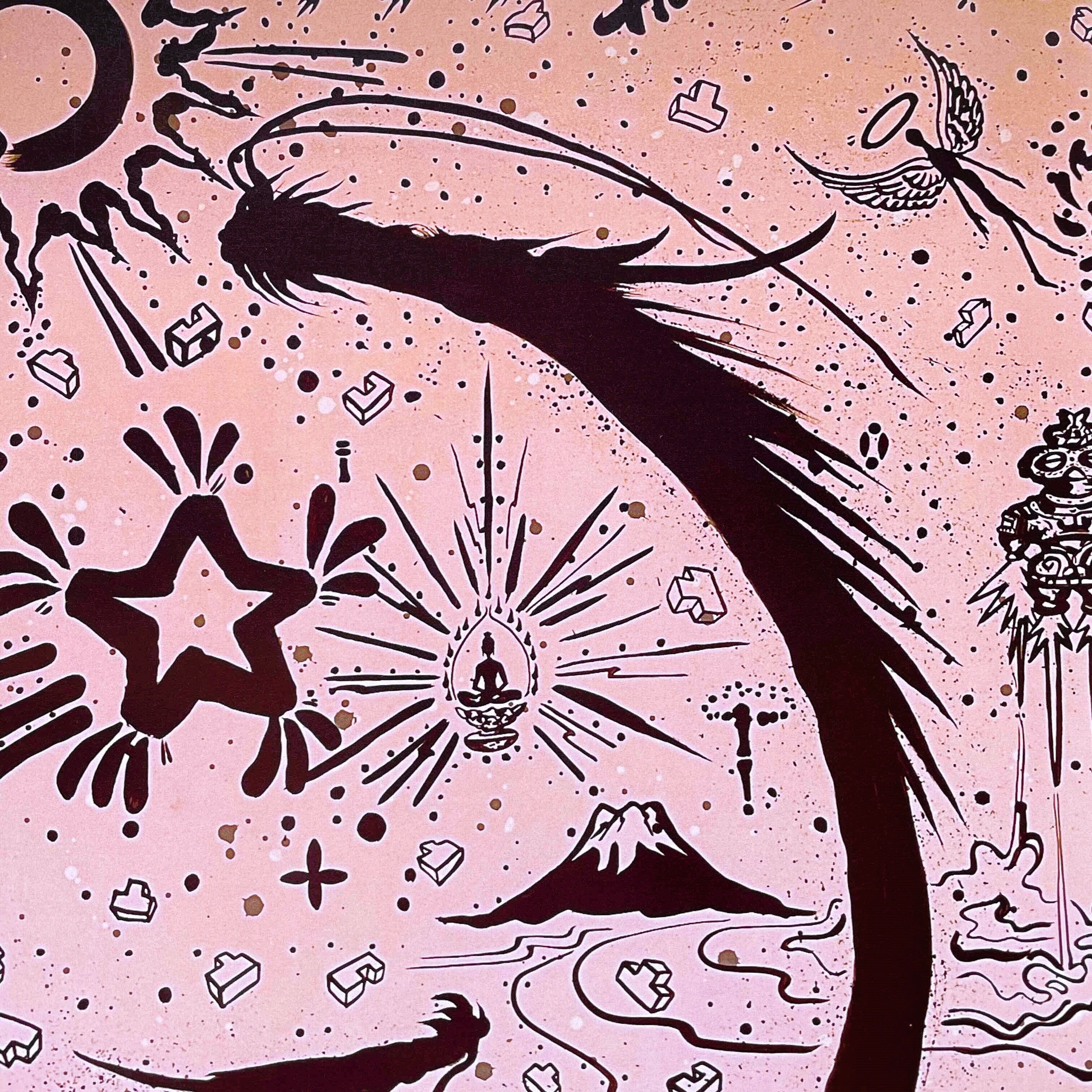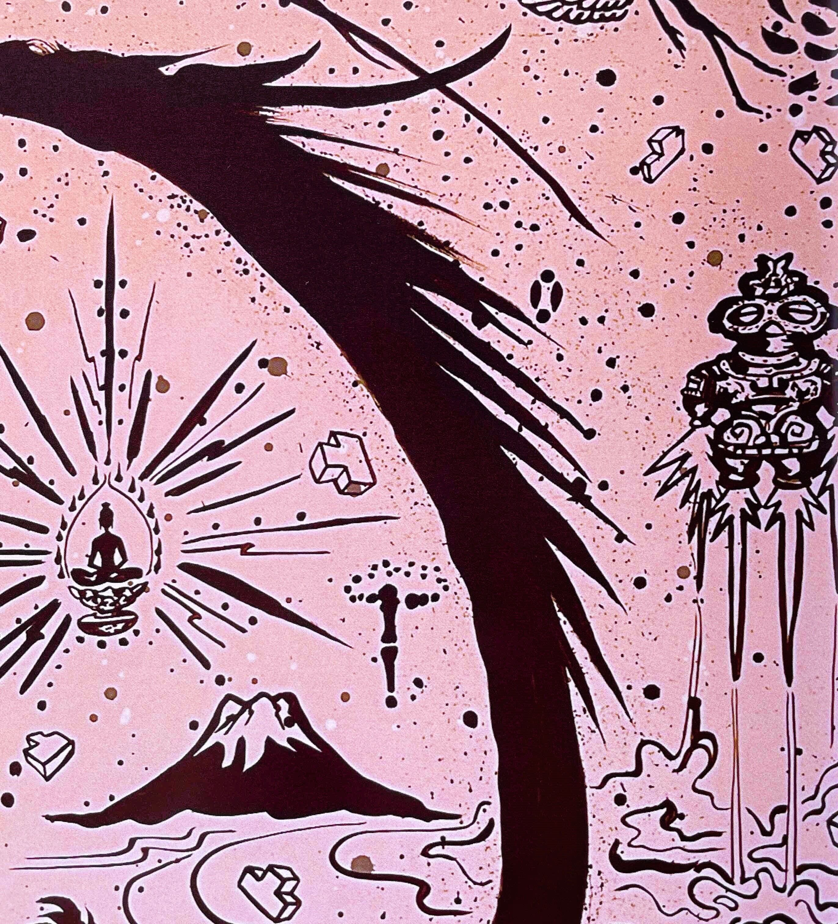 世界の文化、文明を観ることができるようになった現代、その歴史を残すために描いた作品 ピクトグラムのように簡略的な表現で観る者にそのすべてを伝えている。大きく伸びた龍の姿は日本人を示している星や天使は西洋や欧米を意味している 火星へ行くロケットや宇宙人の乗ったUFOや古来の土偶等が平等に主張している。そして絶妙なバランスで配置された絵の中の世界は平和で楽しいものにした。 この作品を日々眺めて世界が生活の一部にリンクさせれると幸いです。
