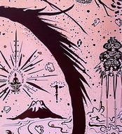 太陽(天照大御神 龍道門)、☆星(アメリカ)、土偶、龍、弥勒菩薩、天使、UFO、火星に行くロケット、宇宙文字、松、卵、凸凹(民)川、草花