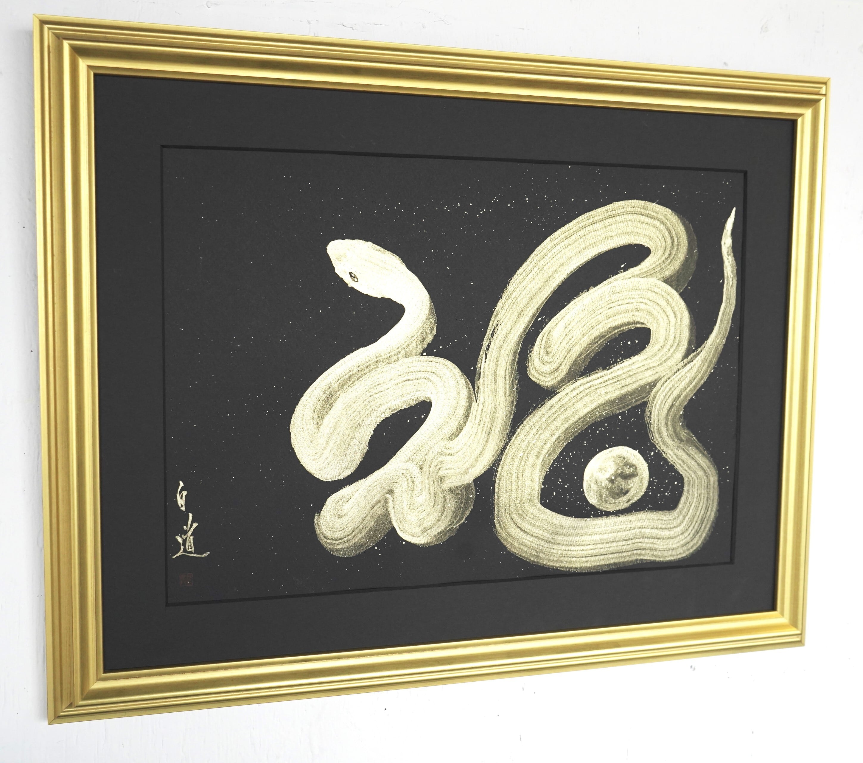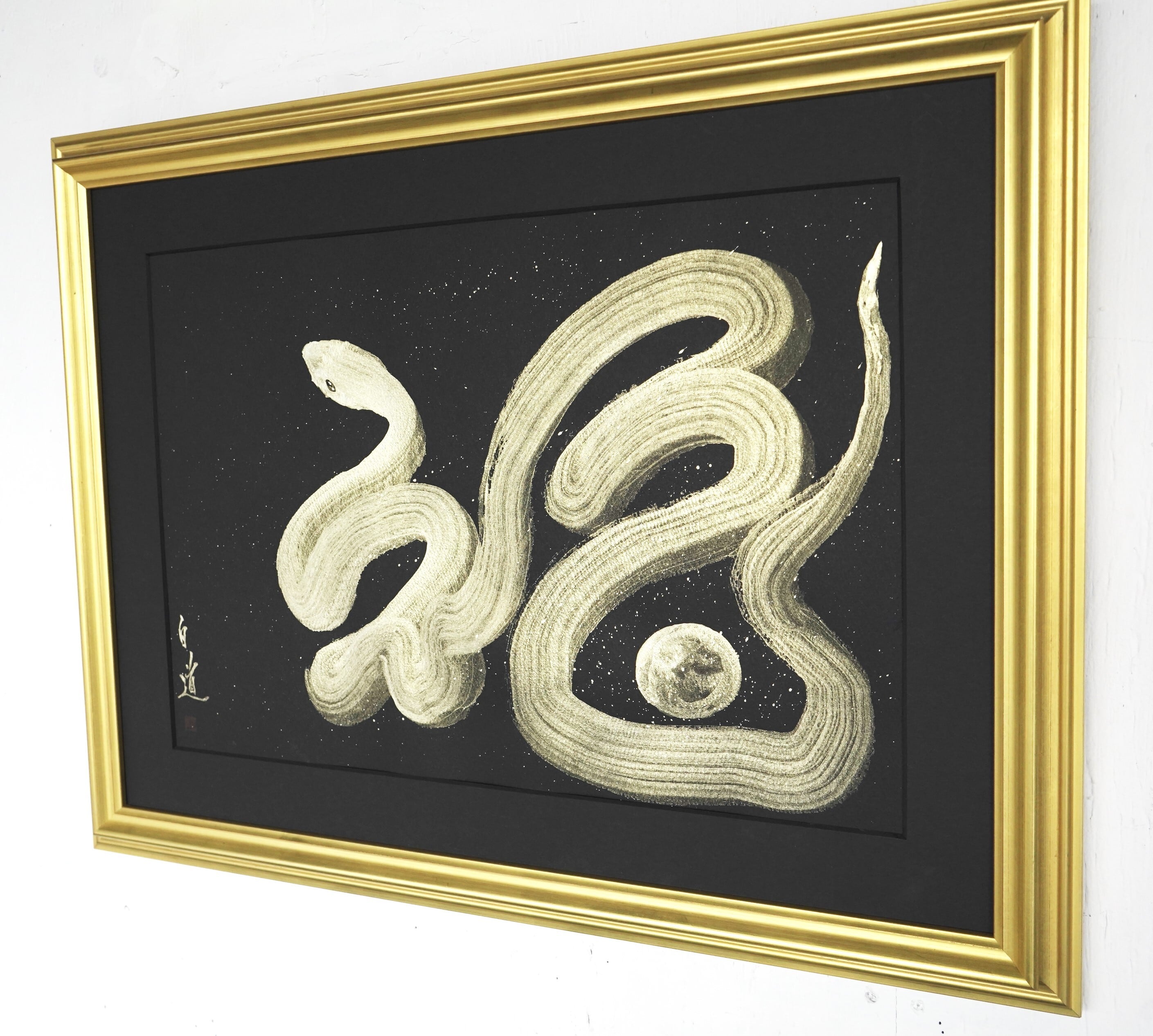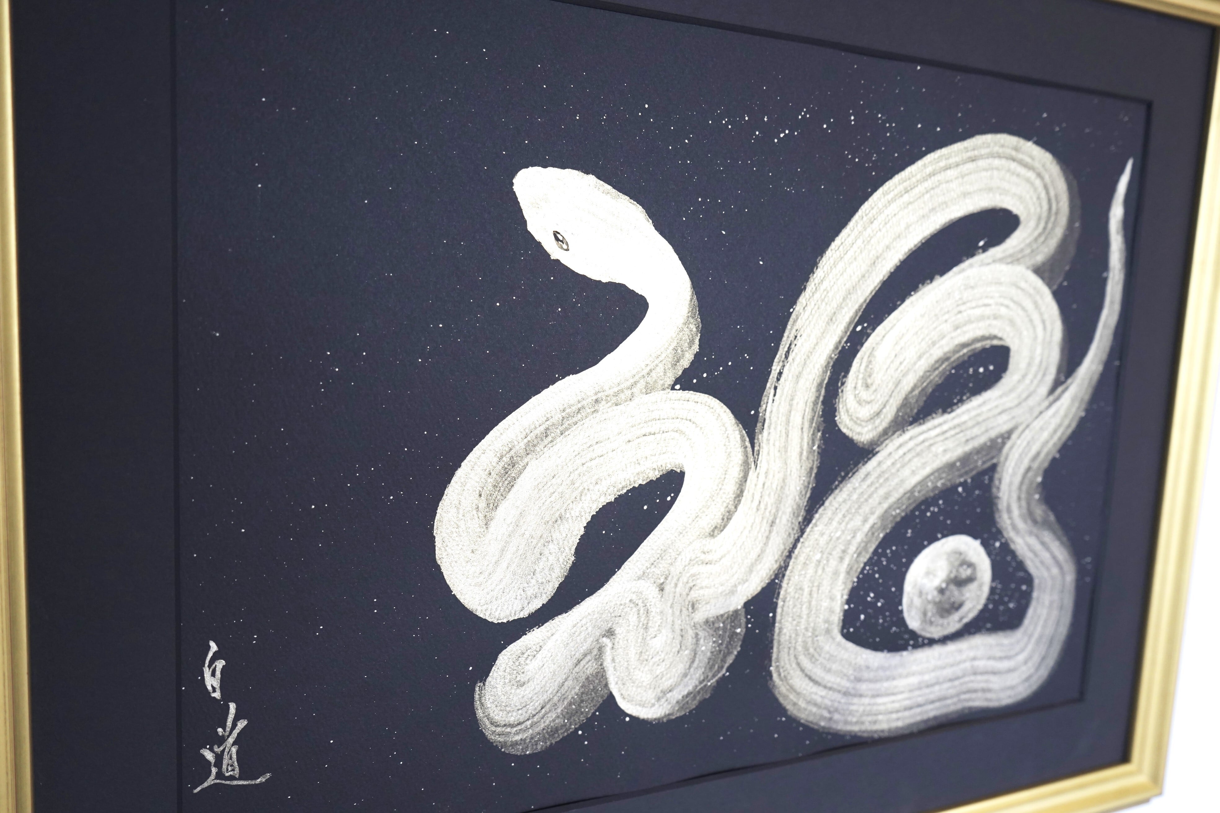 2025巳年記念♪ 現代水墨画家 絵師白道 「一筆白福蛇」 (岩絵の具、金銀) 直筆作品 証明書カード付 蛇 絵 絵画 現代アート
